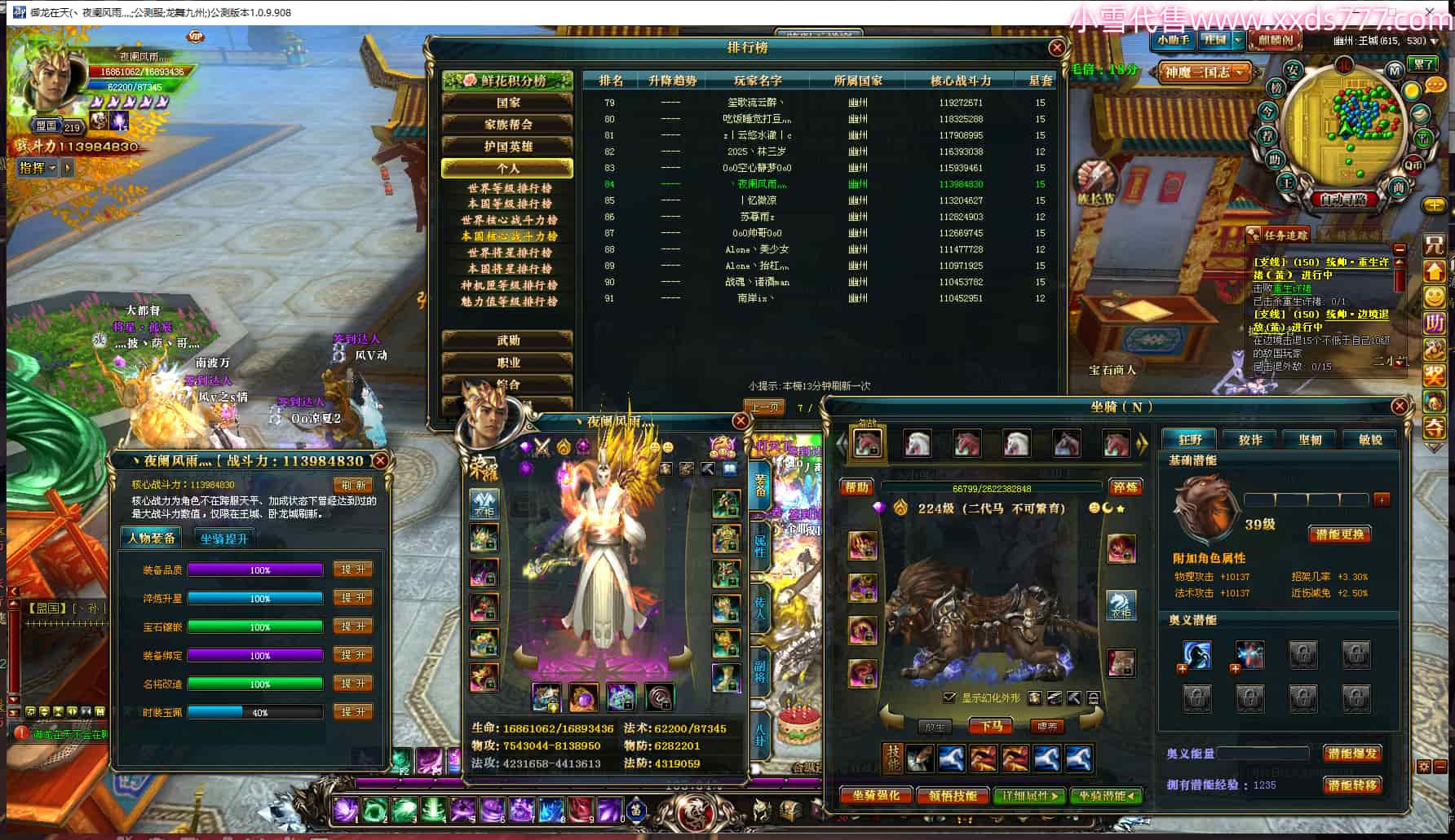 编号W23753 丶夜阑风雨灬 龙舞九州 幽州 本国排名84名 11398W战力 人物黄金普通橙12X(9件15X3件混沌) 传人精良紫12X 副将极品紫12X 马史诗紫10X 精良紫15披风 人物星魂15级 传人星魂6级 副将星魂6级 马星魂8级 人物铭刻15级 人物点亮3件16星其余14星 马铭刻12级 点亮10星 人绿龙印 马黄龙印 五六等单双属性神圣完美优秀石头 蓝黄孔