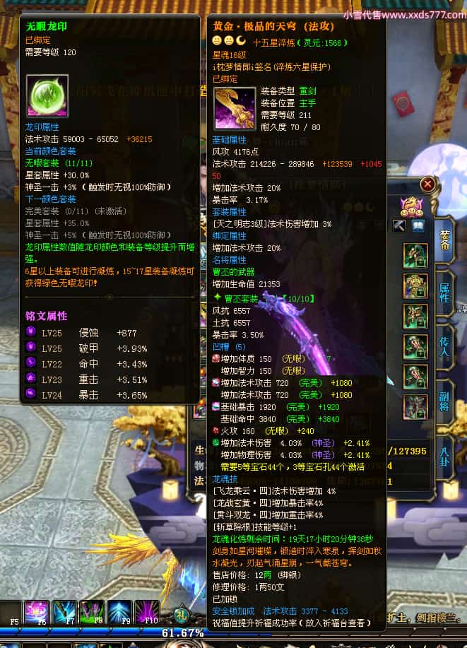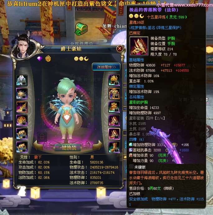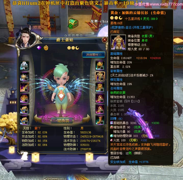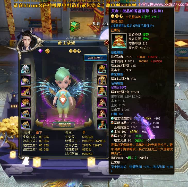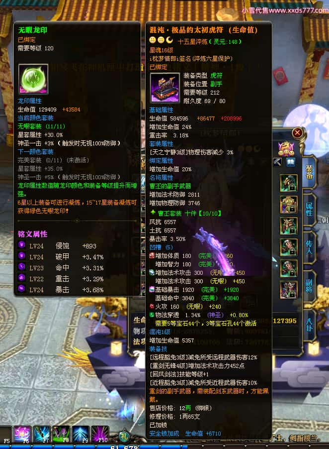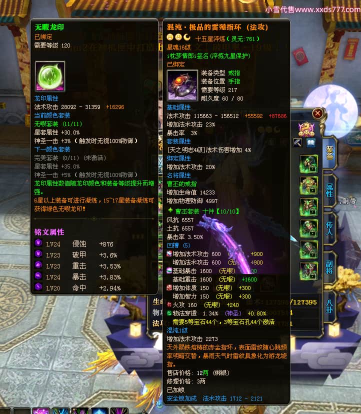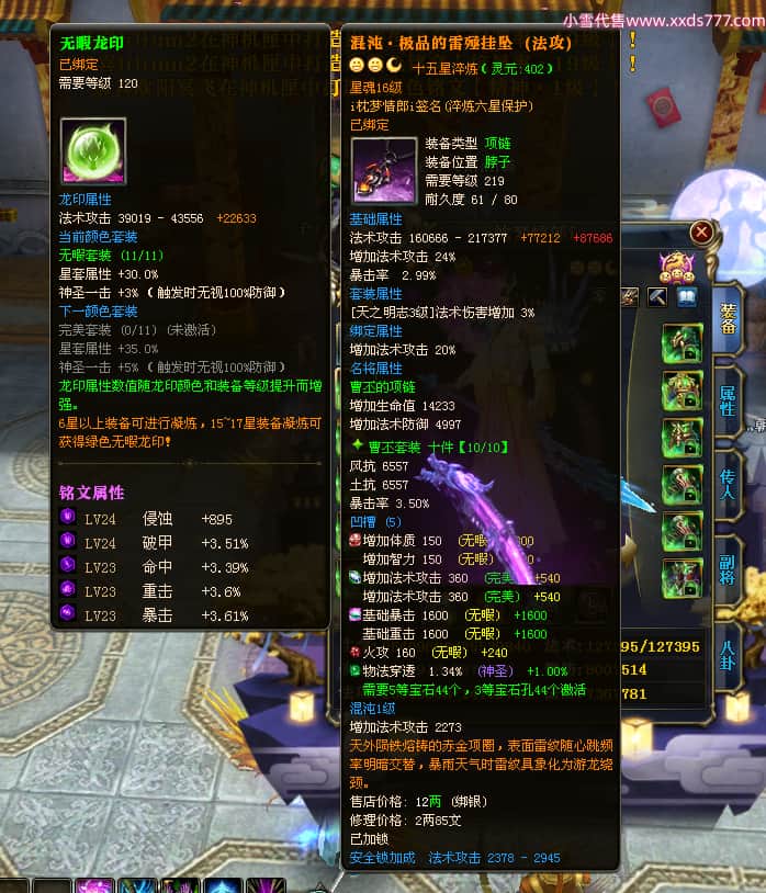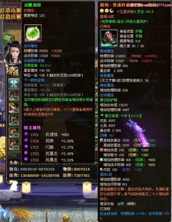 编号W23496 i枕梦情郎i 龙舞九州 江州 本国排名12名 22031W战力 人物黄金普通橙15X(1件18X9件混沌) 传人极品紫15X 副将极品紫15X 马黄金普通橙12X 极品紫16披风 人物星魂16级 传人星魂16级 副将星魂6级 马星魂16级 人物铭刻15级 点亮16星 马铭刻12级 点亮12星 人物绿龙印 马黄龙印(1件绿龙印) 六等单双属性神圣完美无暇石头 黄绿孔 已开2次永久15星套