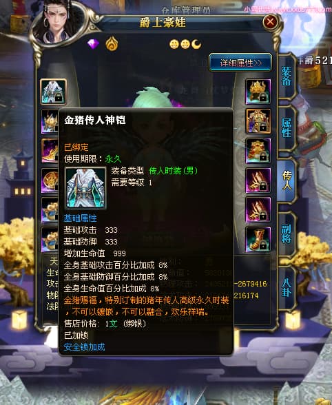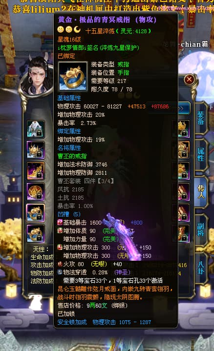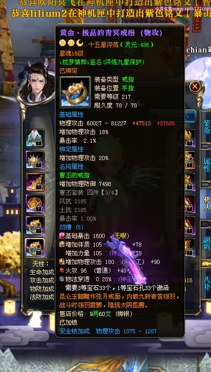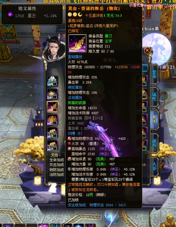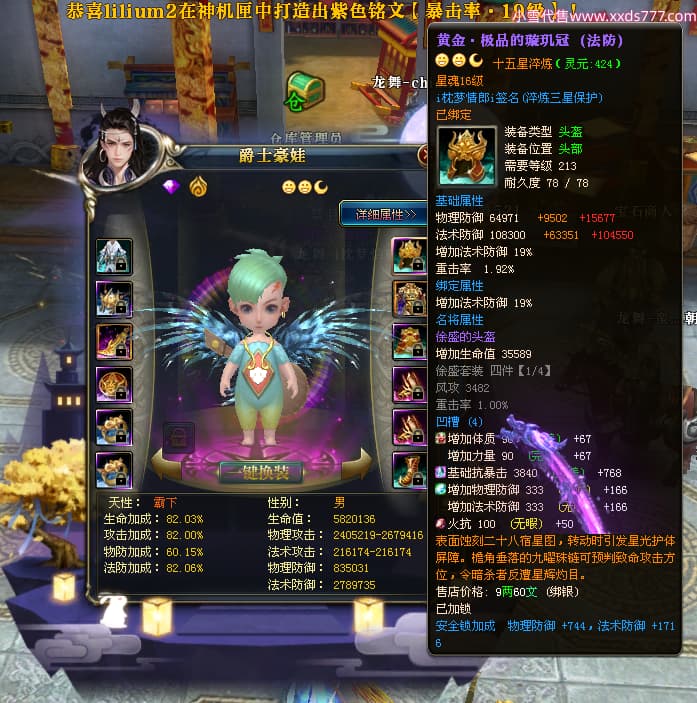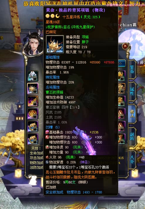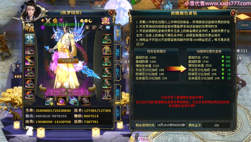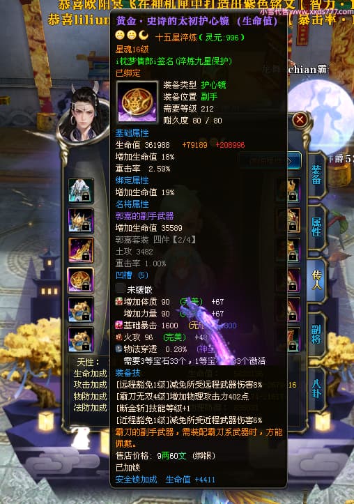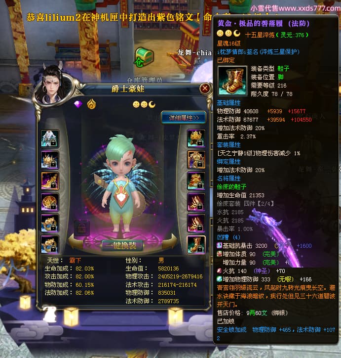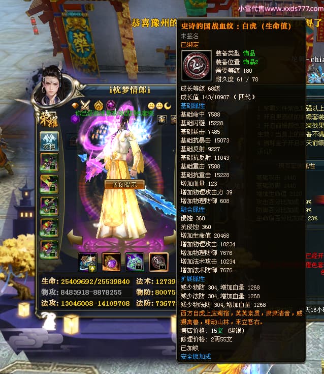 编号W23496 i枕梦情郎i 龙舞九州 江州 本国排名12名 22031W战力 人物黄金普通橙15X(1件18X9件混沌) 传人极品紫15X 副将极品紫15X 马黄金普通橙12X 极品紫16披风 人物星魂16级 传人星魂16级 副将星魂6级 马星魂16级 人物铭刻15级 点亮16星 马铭刻12级 点亮12星 人物绿龙印 马黄龙印(1件绿龙印) 六等单双属性神圣完美无暇石头 黄绿孔 已开2次永久15星套