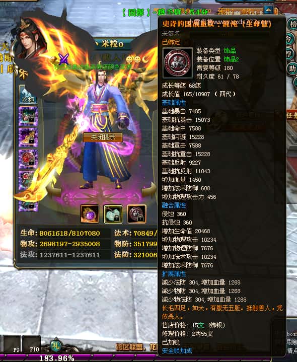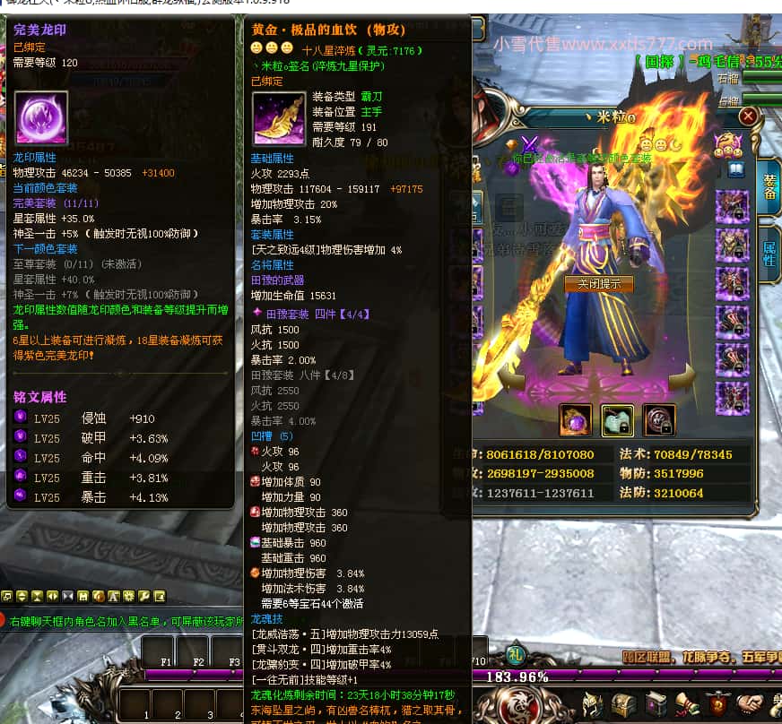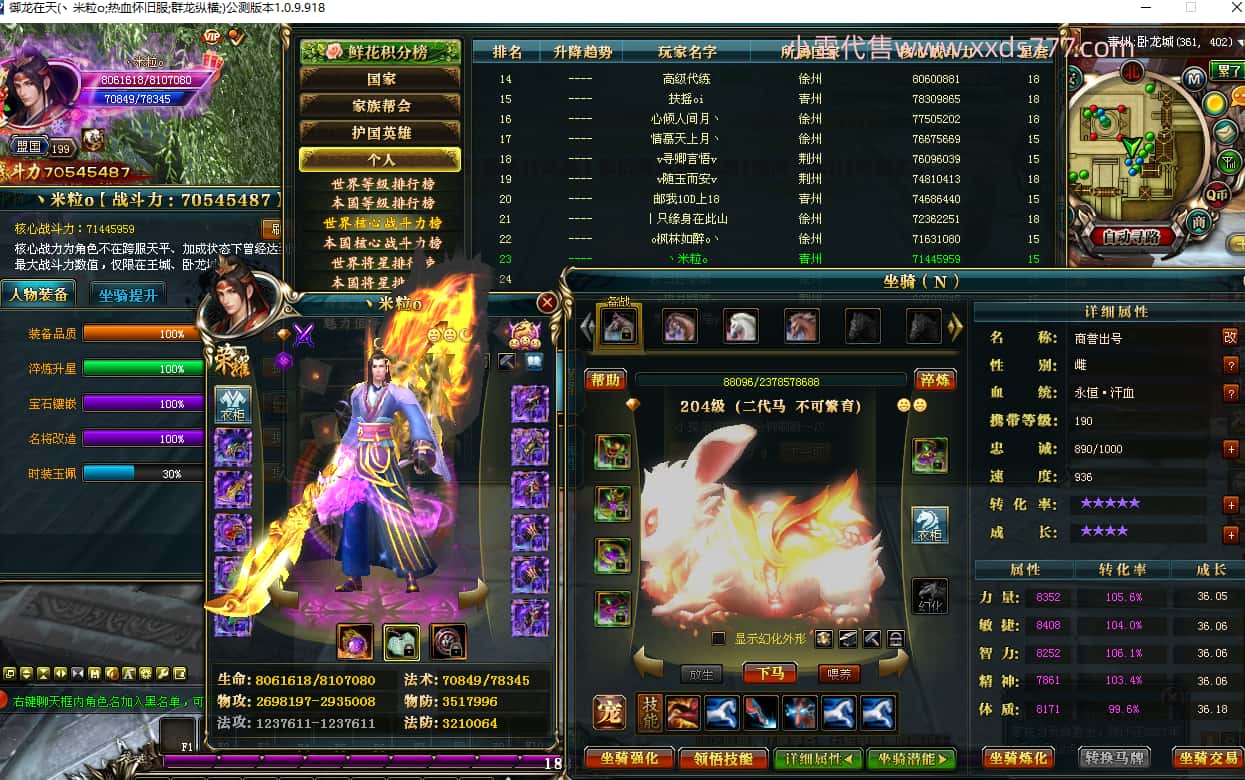 编号Q24232 丶米粒o 群龙纵横 青州 世界排名第23名 7054W战力 人物黄金精良橙15X(9件混沌) 马精良橙12X 龙魂296级 人物紫龙印 马绿龙印 6666等单双属性石头 可以转移百分百安全