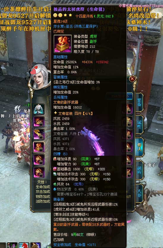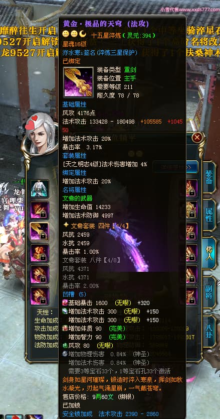 编号W24587 亦水寒i 龙舞九州 扬州 本国排名19名 17338W战力 人物黄金史诗紫15X(5件混沌) 传人精良紫12X 副将精良紫12X 马史诗紫12X 精良紫15披风 人物星魂16级 传人星魂14级 副将星魂6级 马星魂13级 人物铭刻15级 人物点亮4件16星其余14星 马铭刻12级 点亮12星 人物绿龙印 马黄龙印 五六等单双属性完美无暇神圣石头 蓝黄孔 已开2次永久15星套·