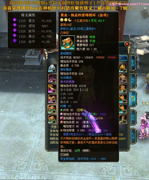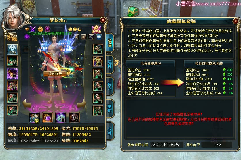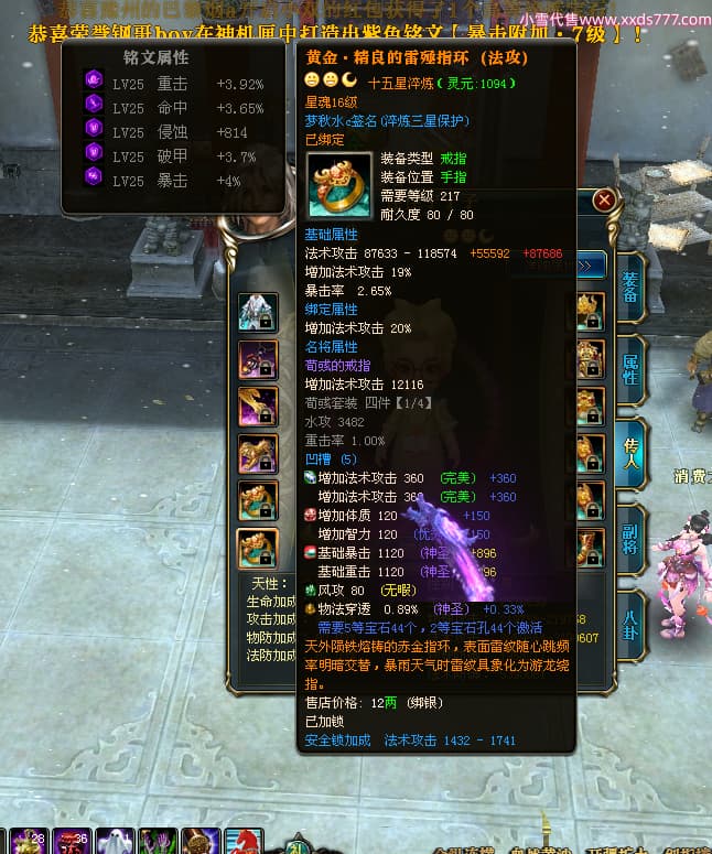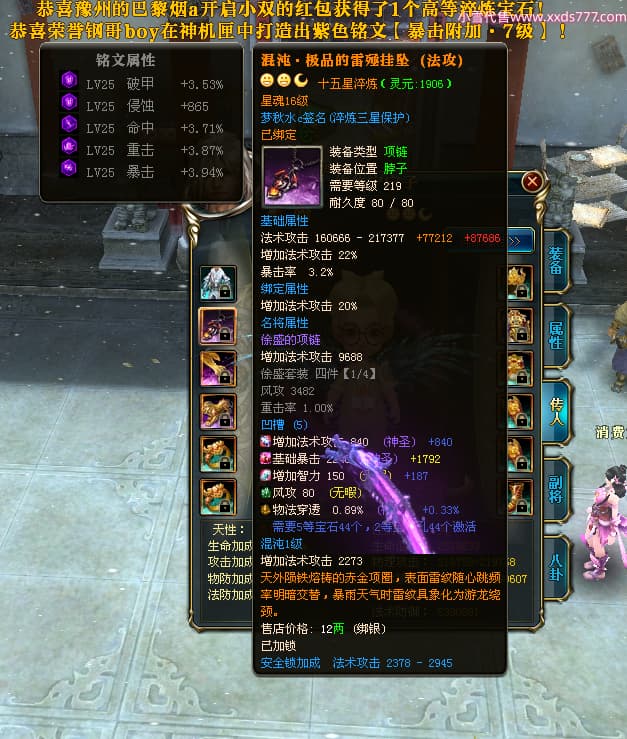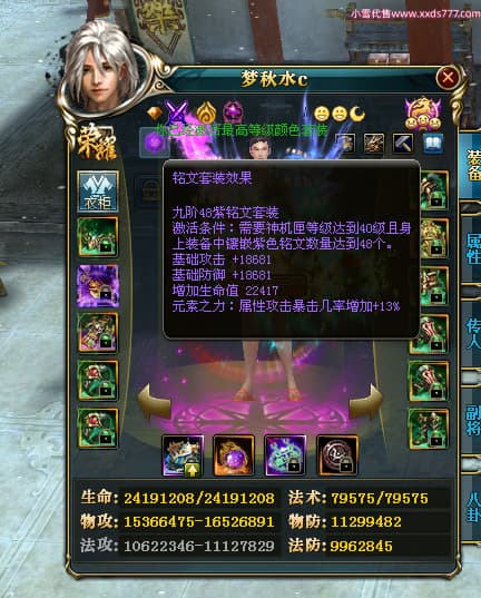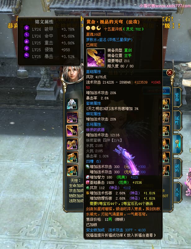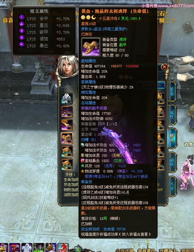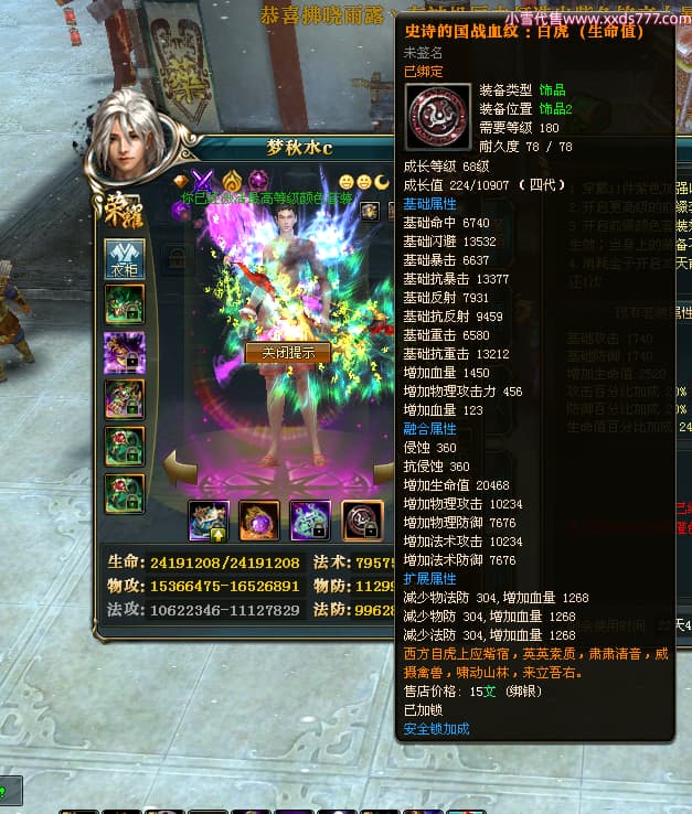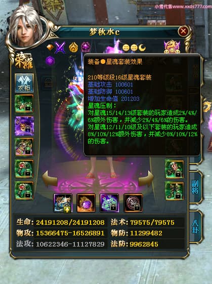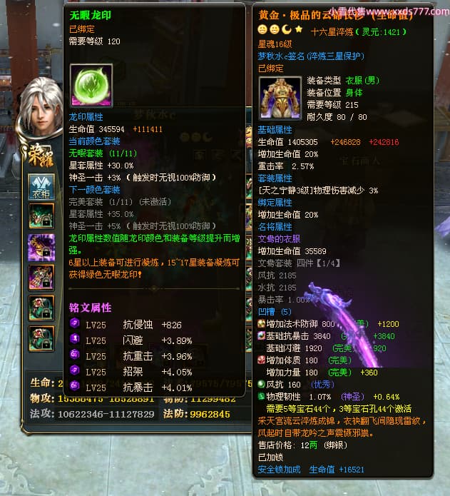 编号Z24590 梦秋水c 逐鹿天下 荆州 世界排名51名 26185W战力 人物黄金精良橙15X(9件混沌) 传人黄金普通橙15X 副将极品紫12X 马黄金加强橙13X(双潜能50级33级) 极品紫16披风 人物星魂16级 传人星魂16级 副将星魂8级 马星魂16级 人物铭刻7件16级其余15级 点亮16星 马铭刻2件15级其余14级 点亮3件14星其余12星 人绿龙印(1件紫龙印) 马黄龙印 六等单双属性神圣完美无暇石头 黄绿孔