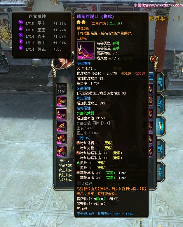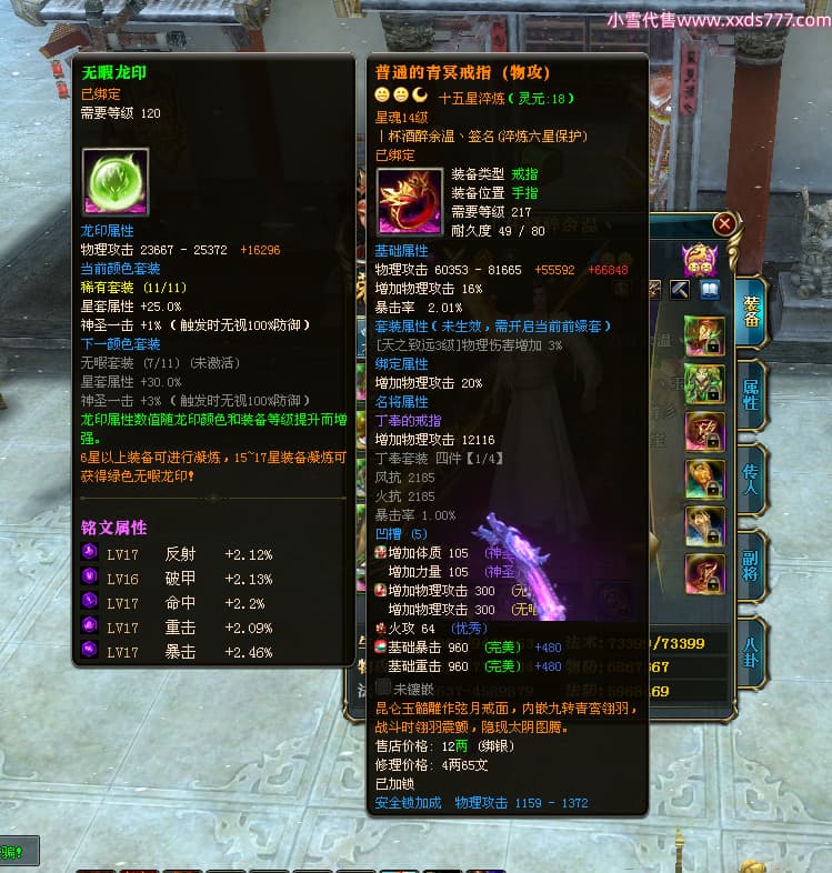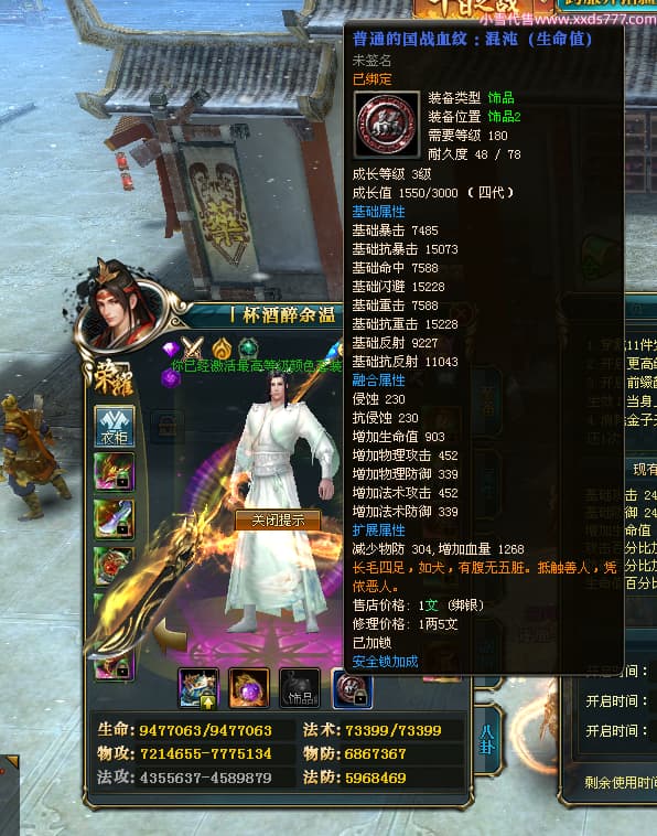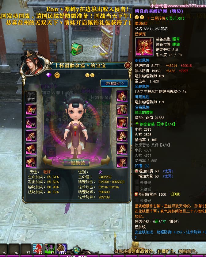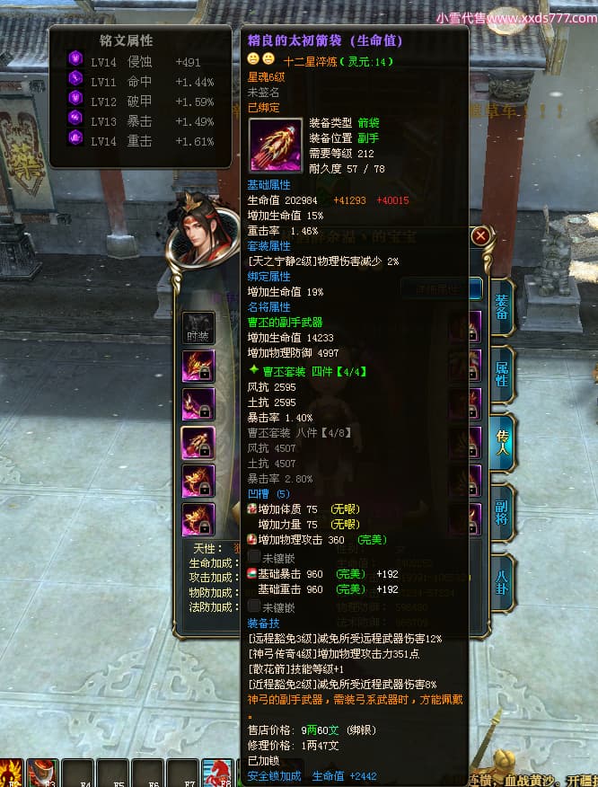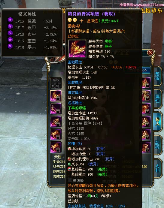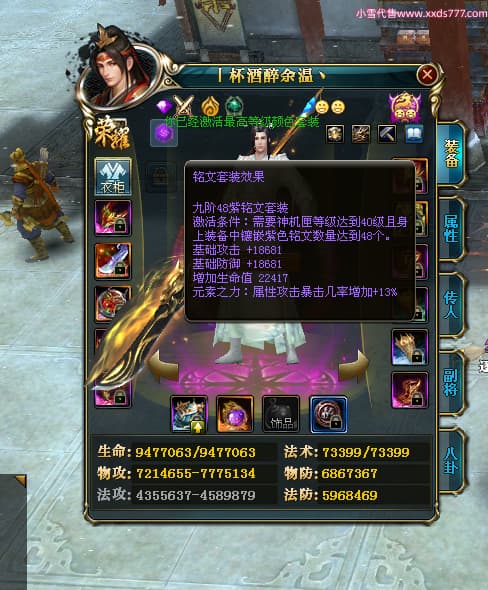 编号Z24641 丨杯酒醉余温丶 逐鹿天下 扬州 本国排名44名 10049W战力 人物史诗紫14X(4件15X1件混沌) 传人精良紫12X 副将精良紫12X 马普通橙12X 普通紫12披风 人物星魂14级 传人星魂6级 马星魂10级 人物铭刻15级 人物点亮5件14星其余12星 马铭刻1件14级1件13级其余12级 点亮12星 人物黄龙印(7件绿龙印) 马蓝龙印 五等单双属性神圣完美无暇石头