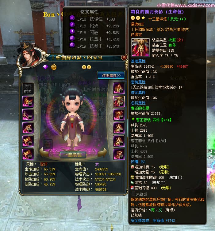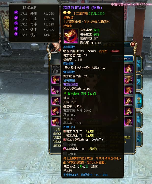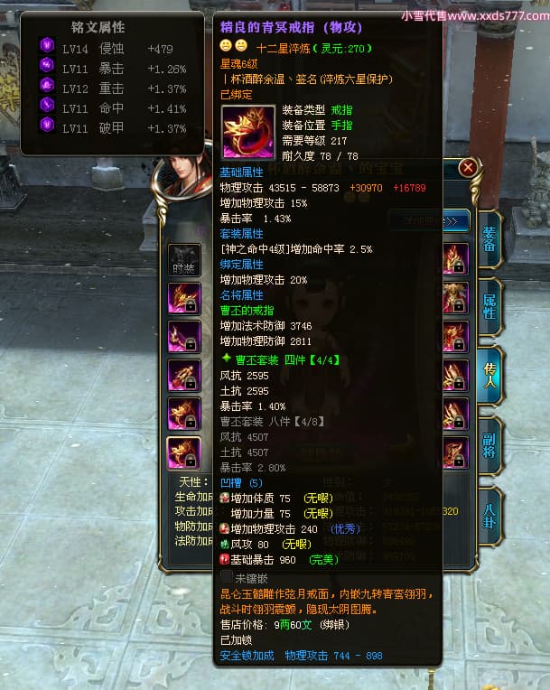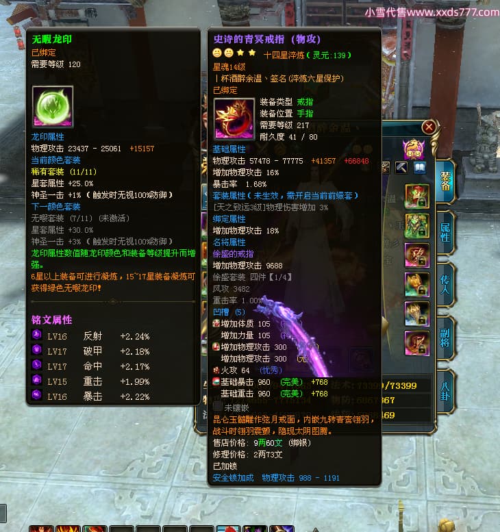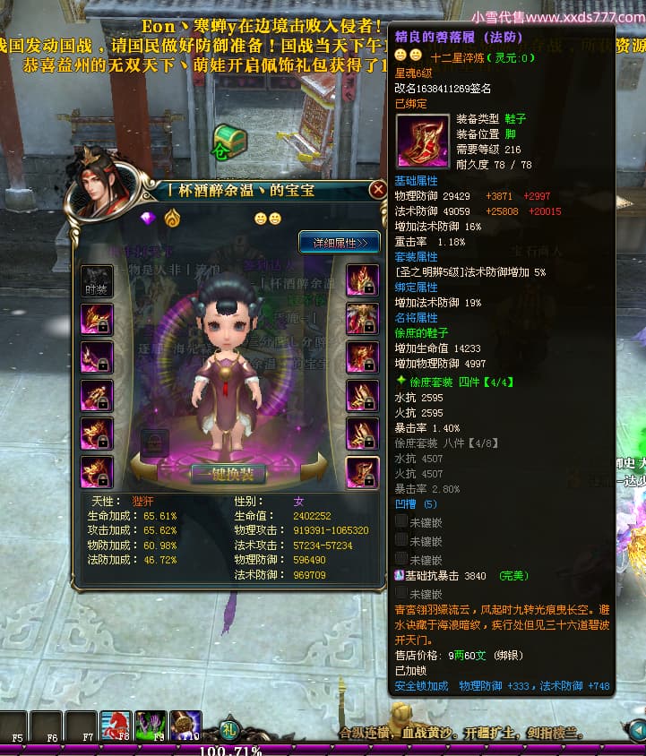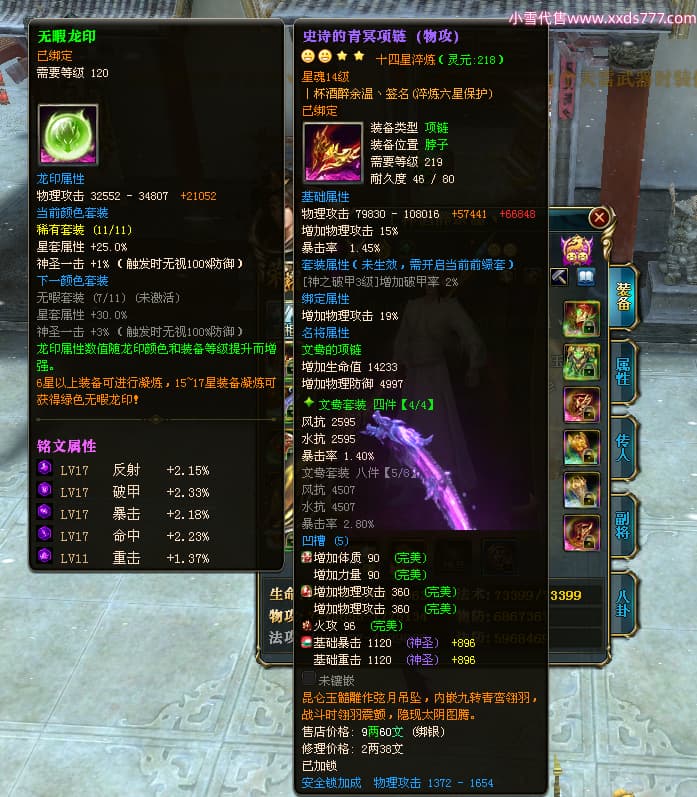编号Z24641 丨杯酒醉余温丶 逐鹿天下 扬州 本国排名44名 10049W战力 人物史诗紫14X(4件15X1件混沌) 传人精良紫12X 副将精良紫12X 马普通橙12X 普通紫12披风 人物星魂14级 传人星魂6级 马星魂10级 人物铭刻15级 人物点亮5件14星其余12星 马铭刻1件14级1件13级其余12级 点亮12星 人物黄龙印(7件绿龙印) 马蓝龙印 五等单双属性神圣完美无暇石头