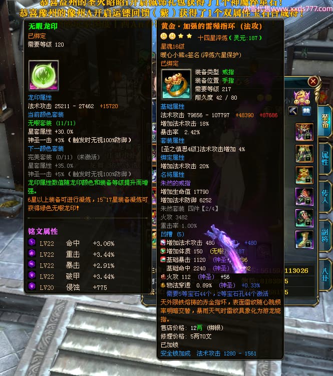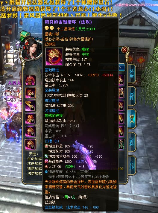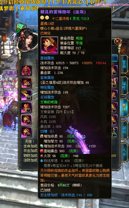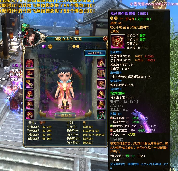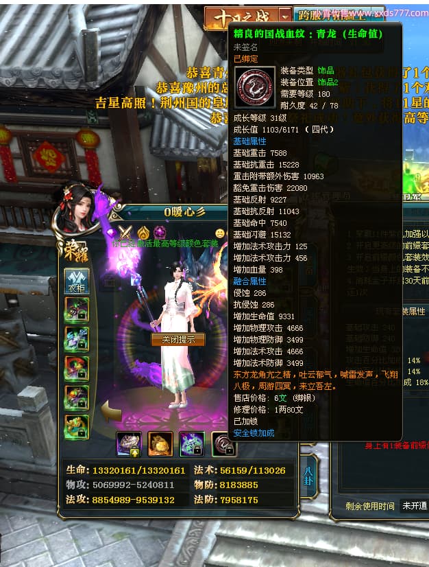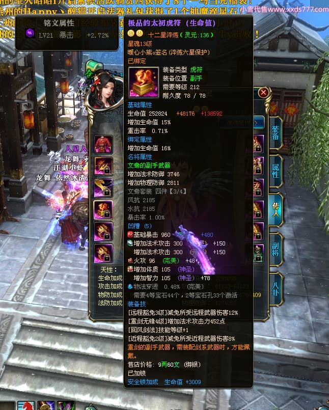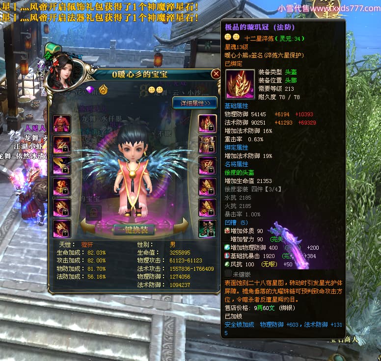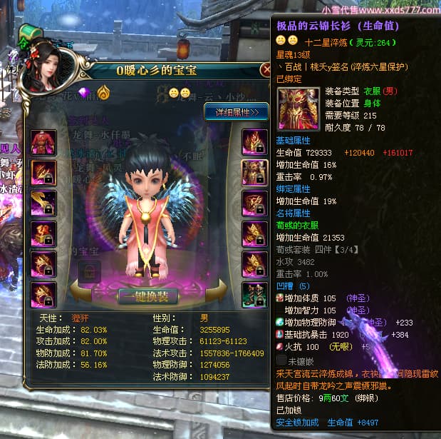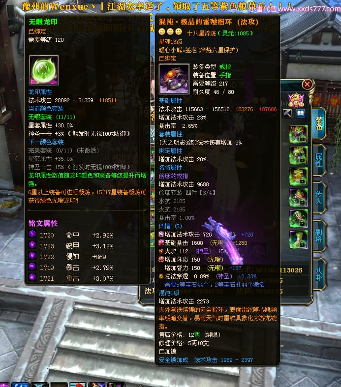 编号W24675 0暖心彡 龙舞九州 江州 本国排名64名 13773W战力 人物黄金史诗紫12X(1件18X4件15X5件混沌) 传人精良紫12XX 马普通橙10X 精良紫15披风 人物星魂16级 传人星魂13级 副将星魂6级 马星魂11级 人物铭刻15级 点亮7件14星其余12星 马铭刻15级 点亮10星 人物绿龙印 马黄龙印 六等单双属性神圣完美无暇石头 蓝黄孔 花榜号