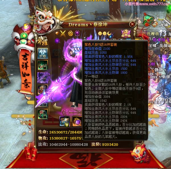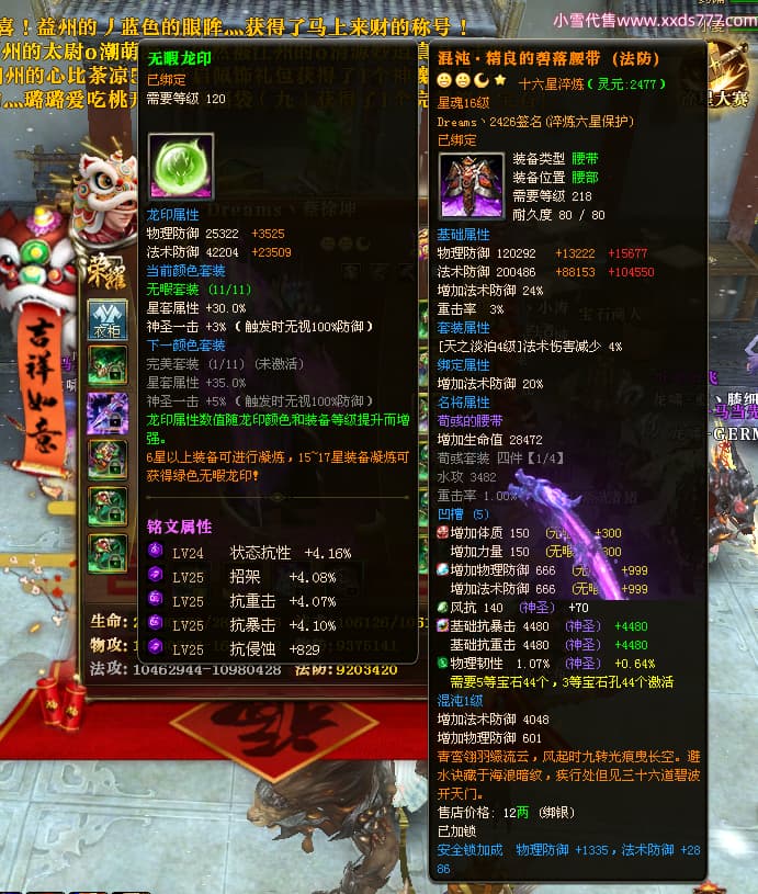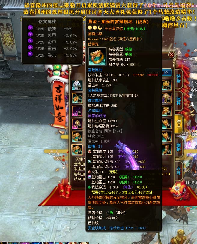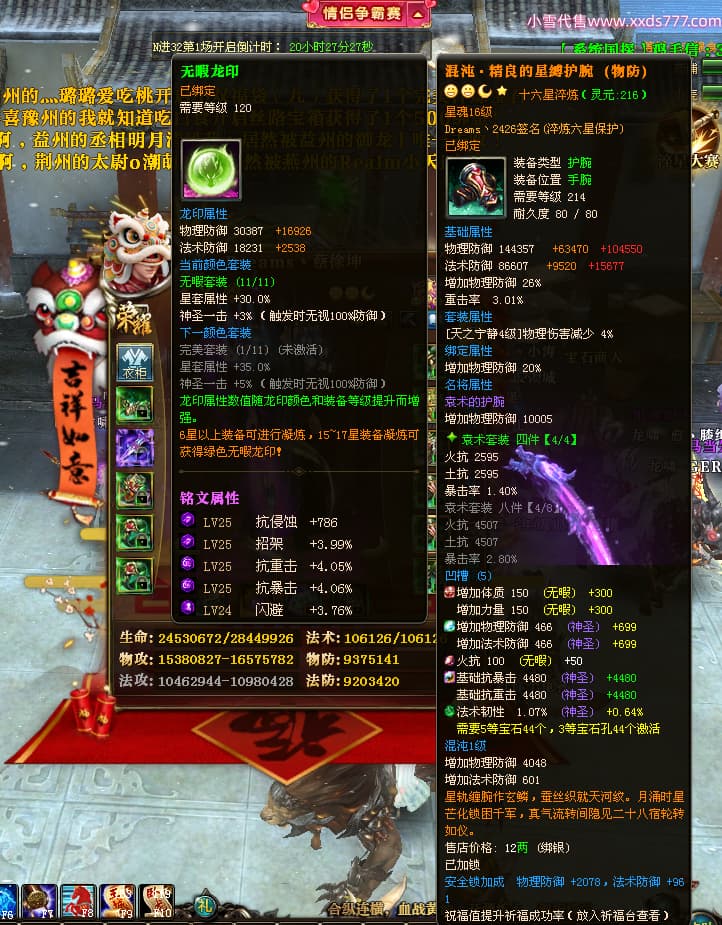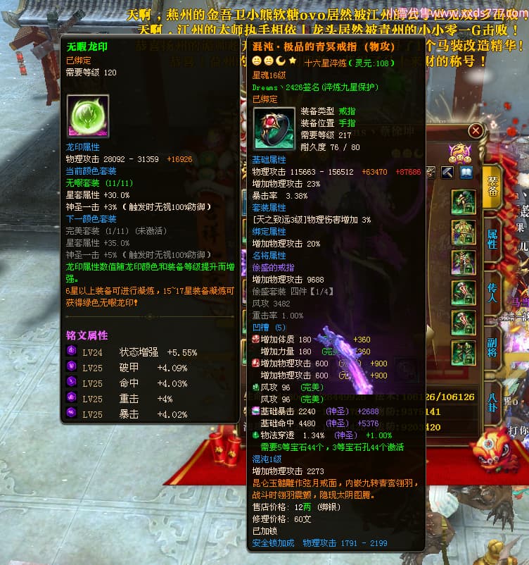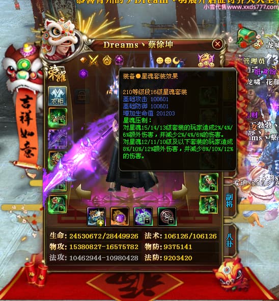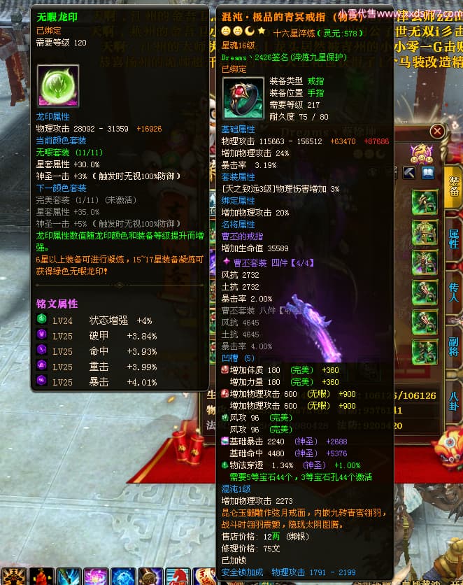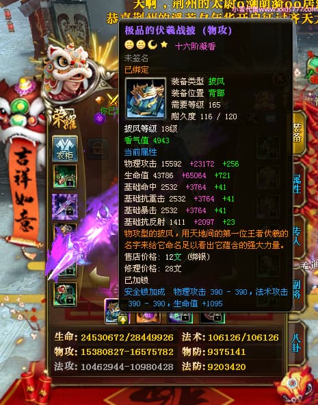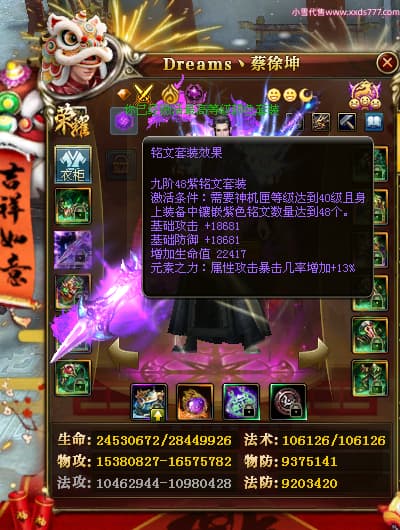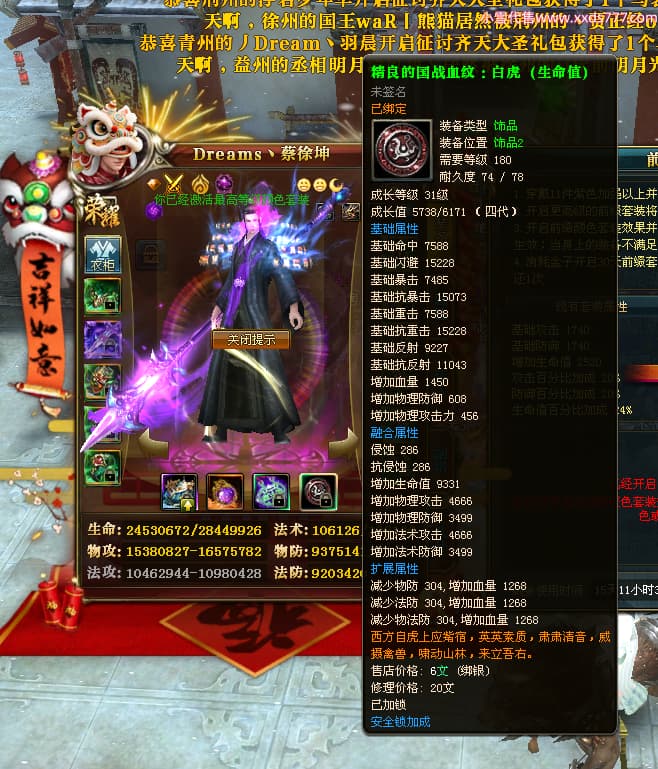 编号X24852 Dreams丶蔡徐坤 龙啸风云 益州 世界排名56名 26899W战力 人物黄金精良橙16X(1件17X9件混沌) 传人黄金普通橙15X 副将史诗紫15X 马黄金加强橙12X 极品紫16披风 人物星魂16级 传人星魂16级 副将星魂9级 马星魂16级 人物铭刻1件17级7件16级其余15级 人物点亮16星 马铭刻12级 点亮12星 人物绿龙印(1件紫龙印) 马绿龙印 六等单双属性神圣完美优秀石头 黄绿孔