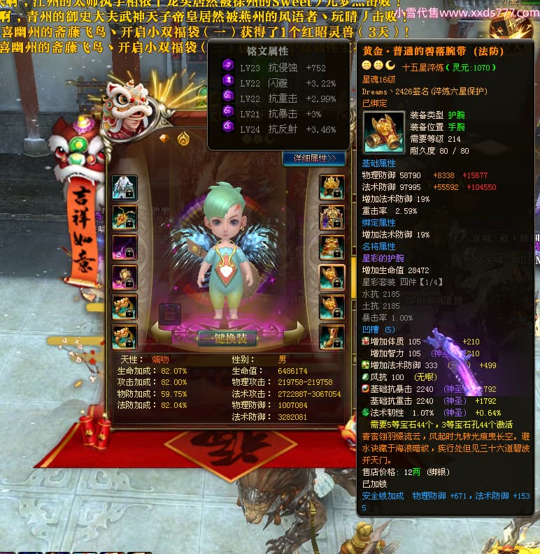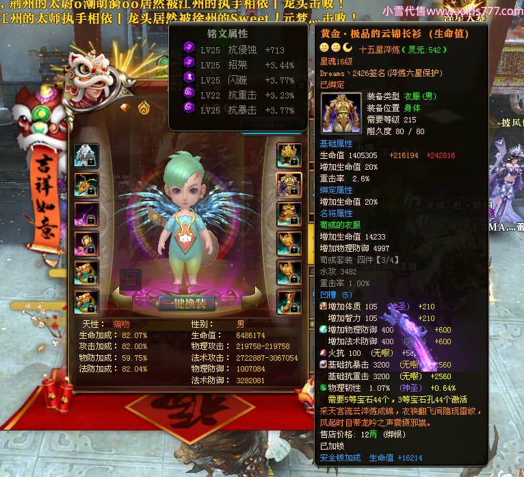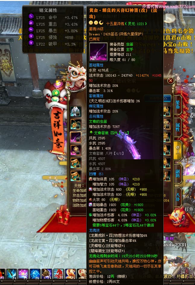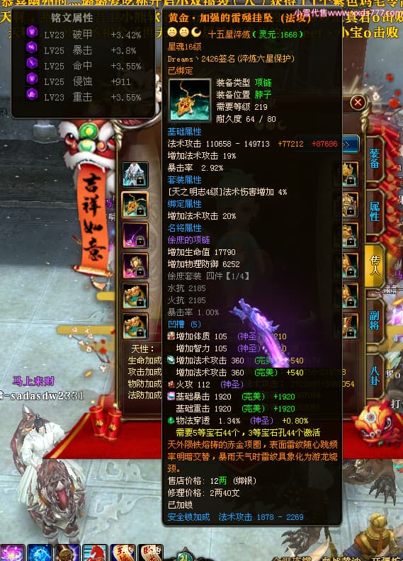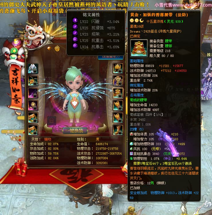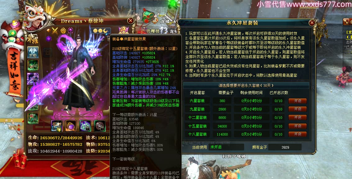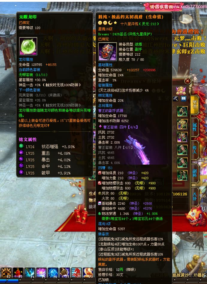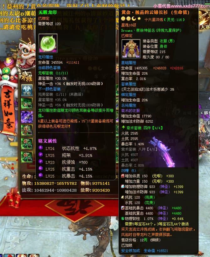 编号X24852 Dreams丶蔡徐坤 龙啸风云 益州 世界排名56名 26899W战力 人物黄金精良橙16X(1件17X9件混沌) 传人黄金普通橙15X 副将史诗紫15X 马黄金加强橙12X 极品紫16披风 人物星魂16级 传人星魂16级 副将星魂9级 马星魂16级 人物铭刻1件17级7件16级其余15级 人物点亮16星 马铭刻12级 点亮12星 人物绿龙印(1件紫龙印) 马绿龙印 六等单双属性神圣完美优秀石头 黄绿孔