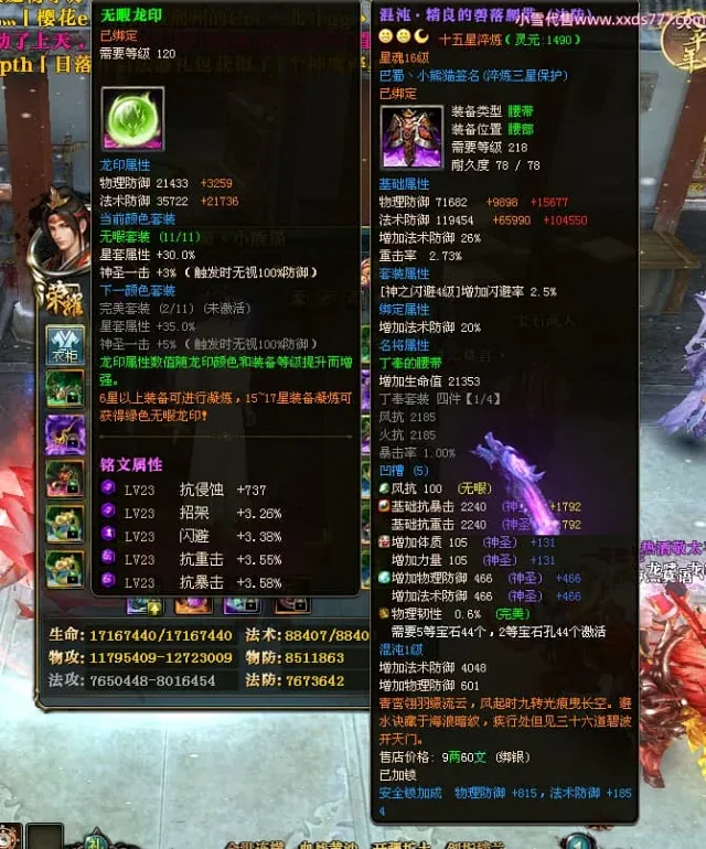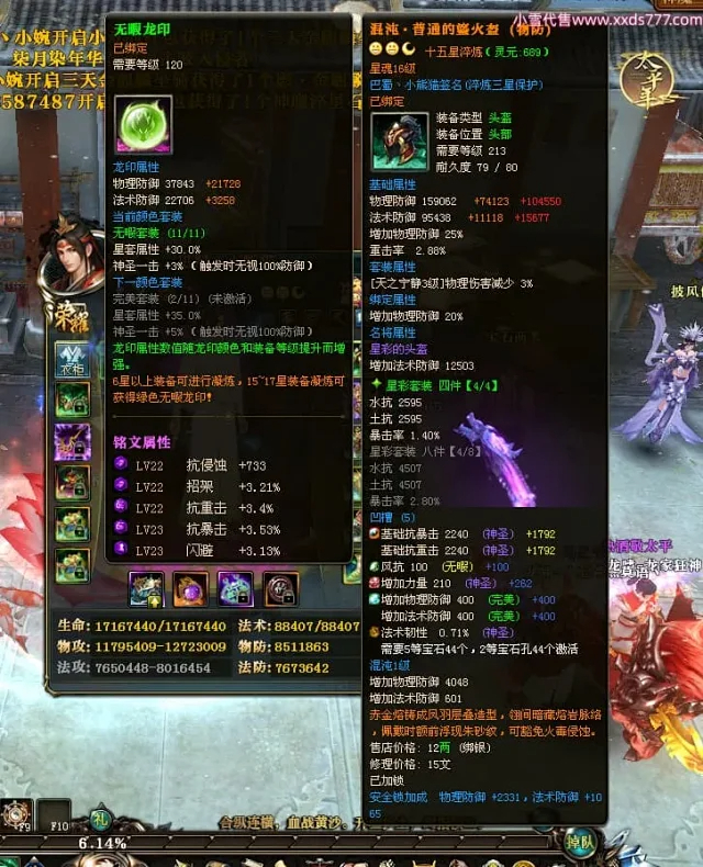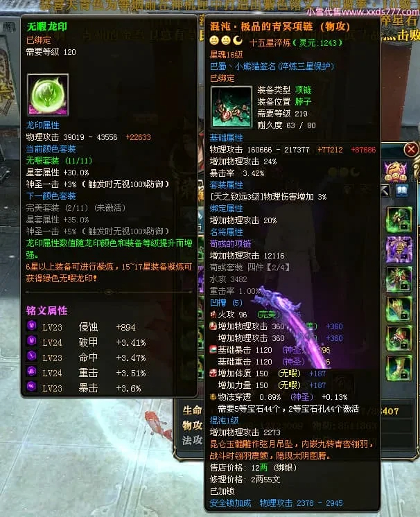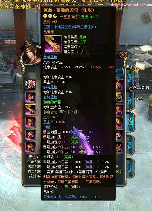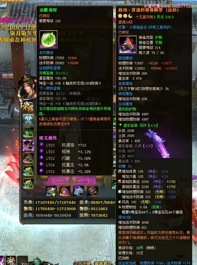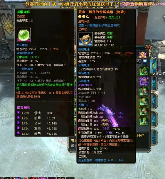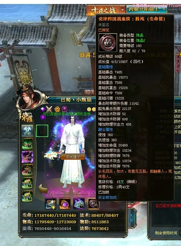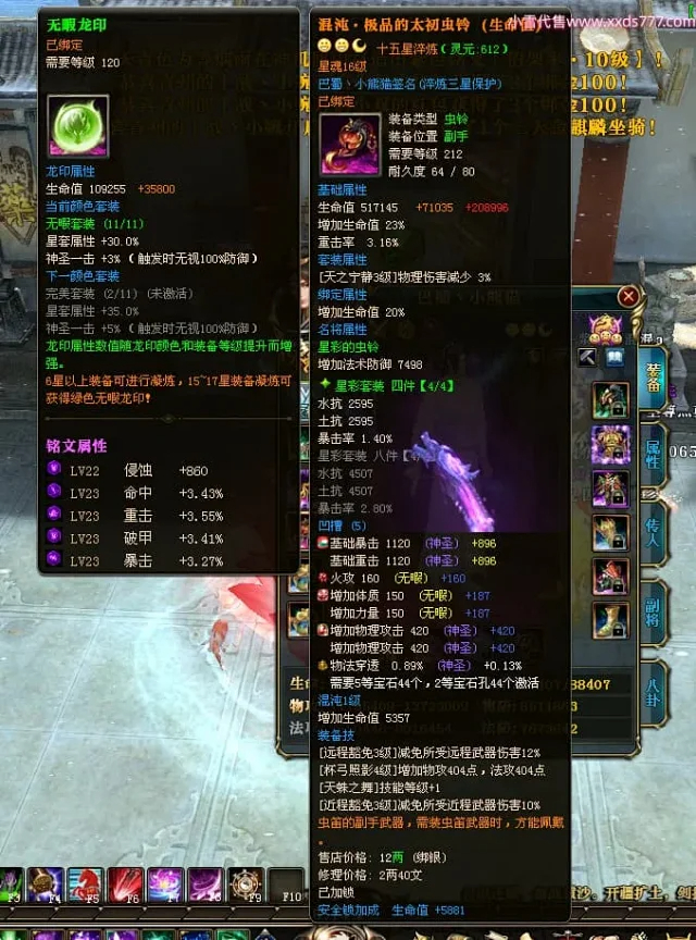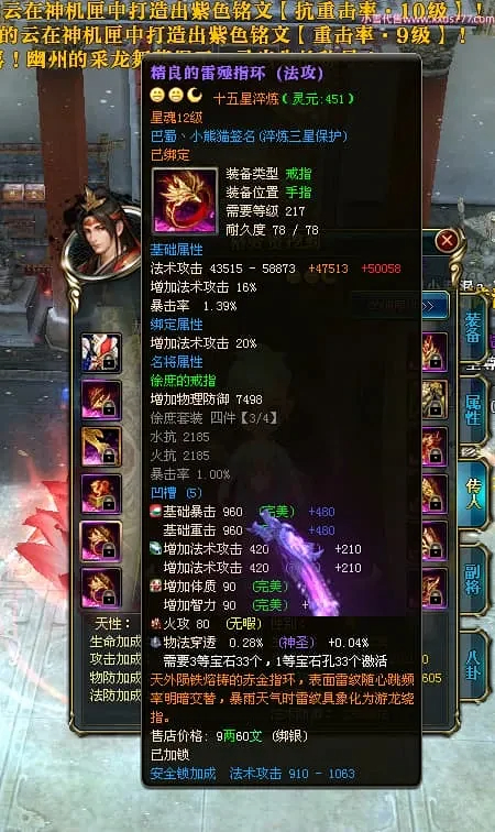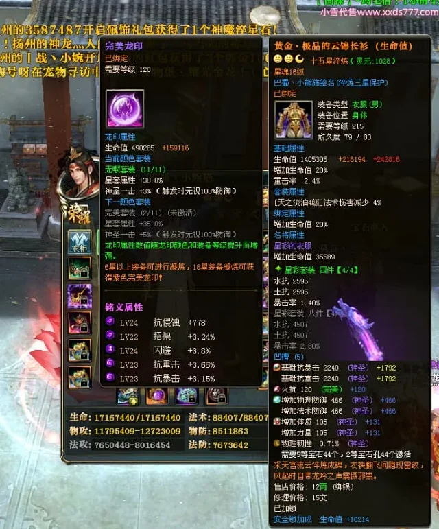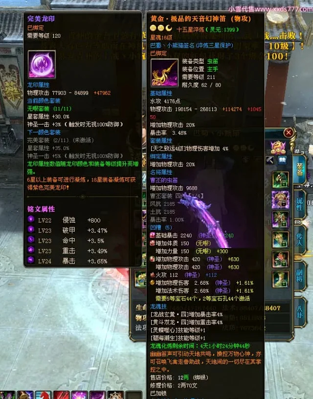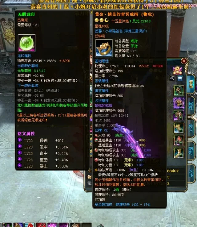 编号X24697 巴蜀丶小熊猫 龙啸风云 江州 本国排名39名 18055W战力 人物黄金普通橙15X(5件混沌) 传人精良紫15X 副将精良紫12X 马普通橙12X 精良紫15披风 人物星魂16级 传人星魂10级 副将星魂6级 马星魂12级 人物铭刻15级 人物点亮16星 马铭刻4件14级其余12级 点亮12星 人绿龙印(2件紫龙印) 马黄龙印 五六等单双属性神圣完美优秀石头 黄蓝孔 已开5次永久15星套