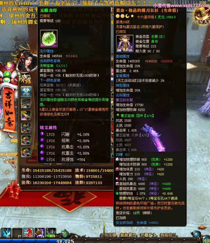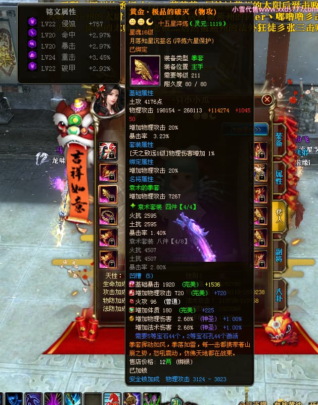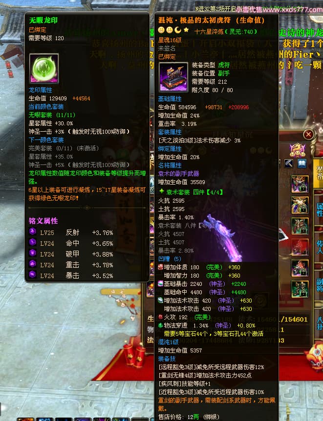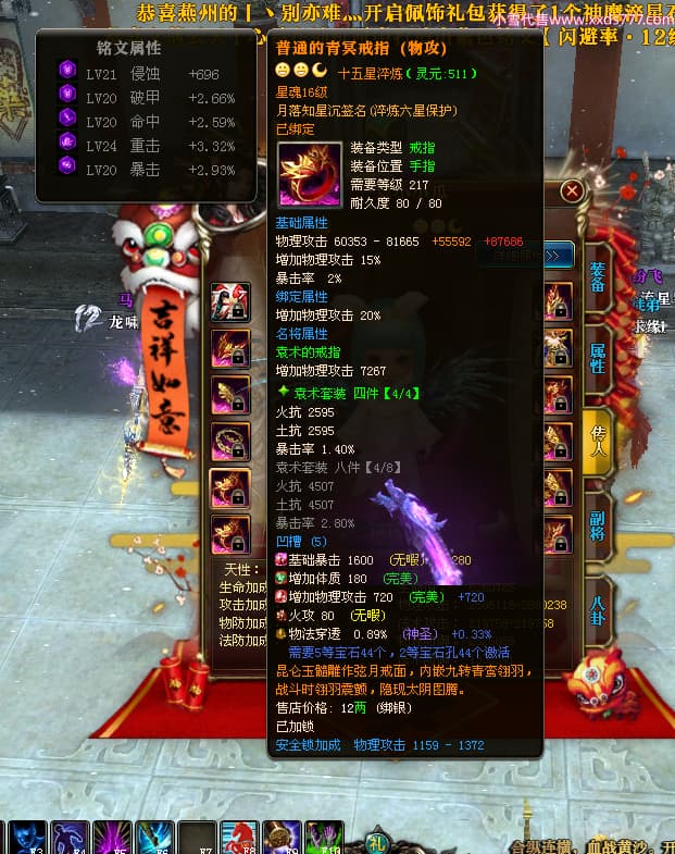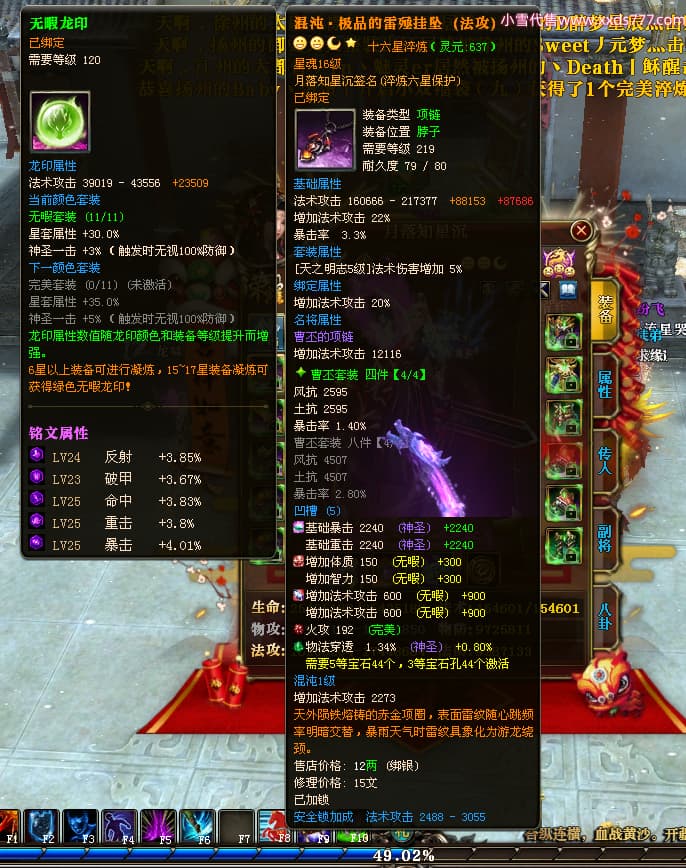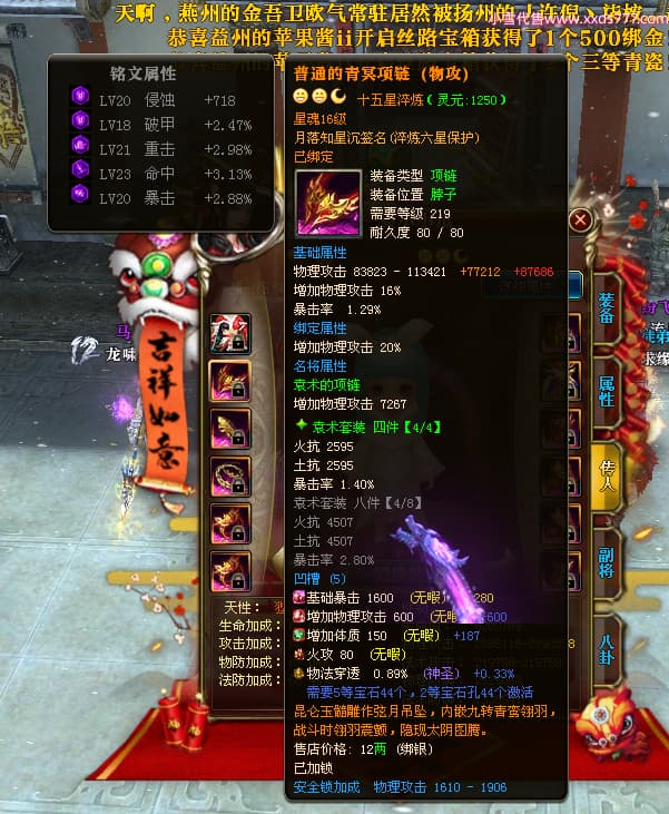 编号X24871 月落知星沉 龙啸风云 扬州 世界排名57名 26702W战力 人物黄金普通橙15X(9件混沌) 传人普通橙15X 副将史诗紫15X 马加强橙13X 极品紫16披风 人物星魂16级 传人星魂16级 副将星魂6级 马星魂16级 人物铭刻1件16级其余15级 点亮16星 马铭刻2件15级其余14级 点亮14星 人物绿龙印 马黄龙印 六等单双属性神圣完美无暇石头 黄绿孔 已开完永久15星套 已开完永久18星套