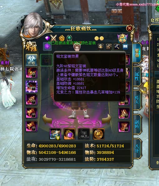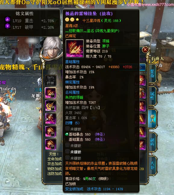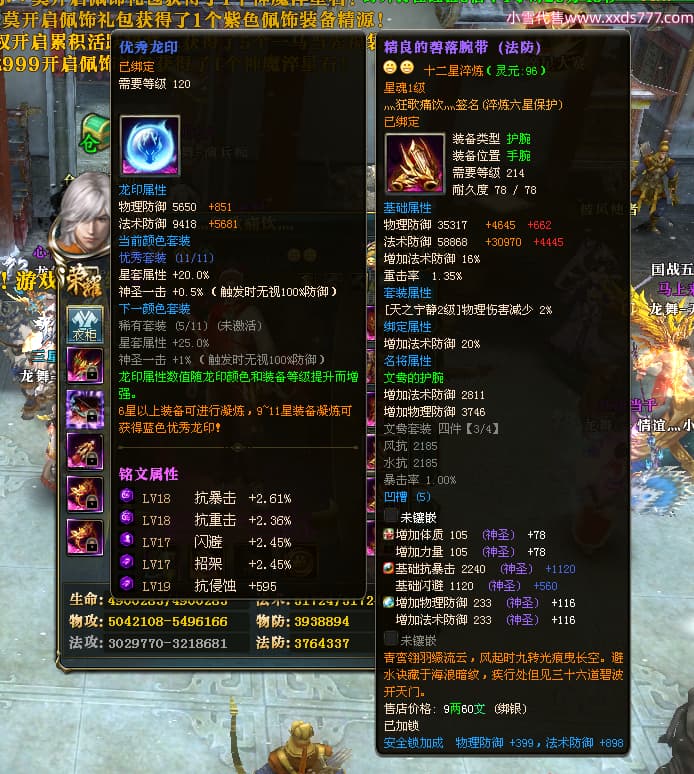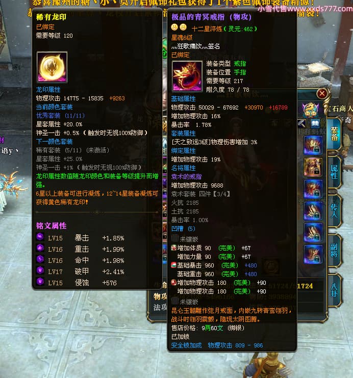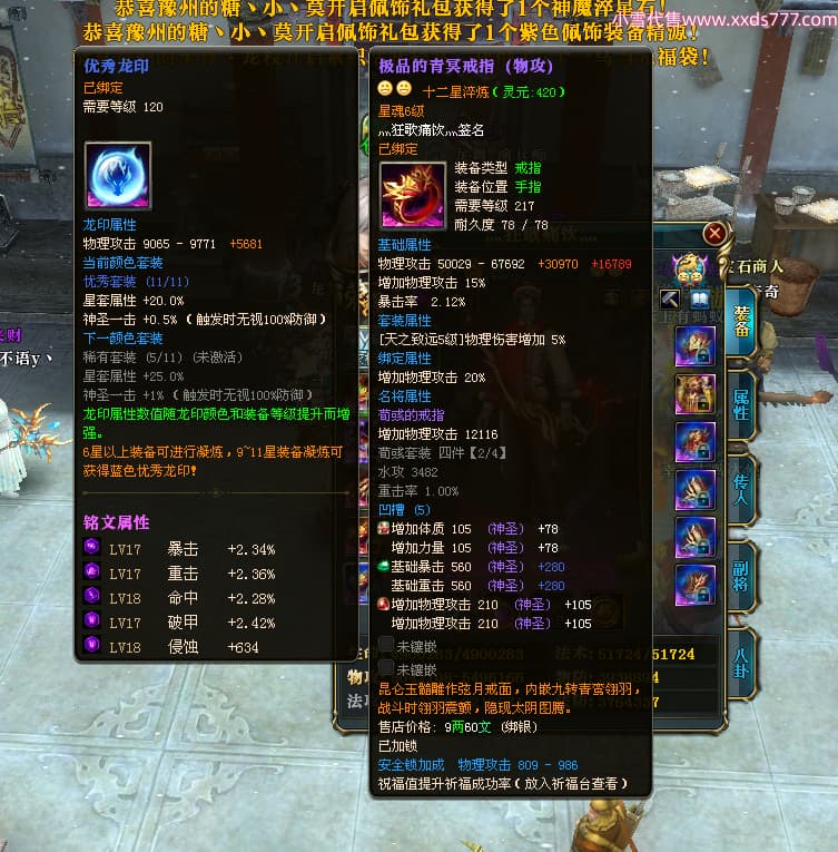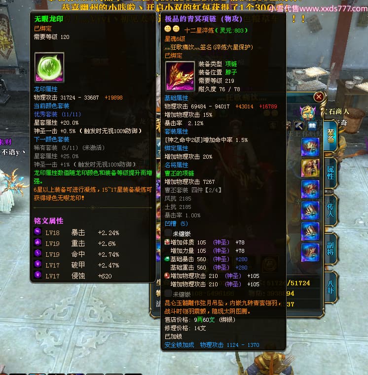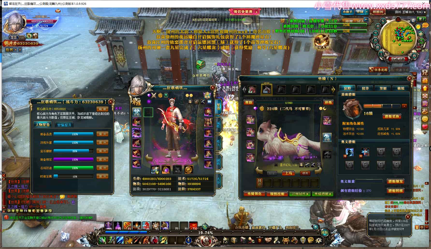 编号W24917 灬狂歌痛饮灬 龙舞九州 扬州 6323W战力 人物精良紫12X(1件18X) 传人精良紫12X 副将精良紫12X 马精良紫9X 马星魂3级 人物铭刻12级 点亮2件14星其余12星 马铭刻9级 点亮10星 人物蓝龙印(3件黄龙印1件紫龙印) 马白龙印 五等单双属性神圣完美无暇石头 蓝白孔 可以转移百分百安全