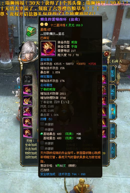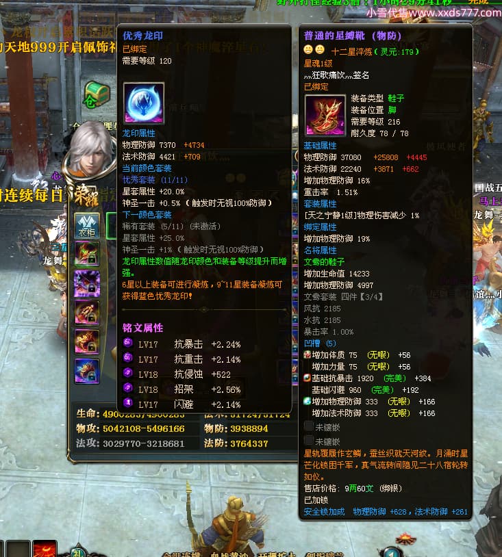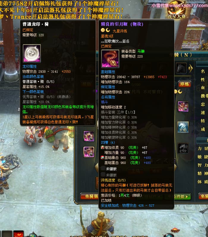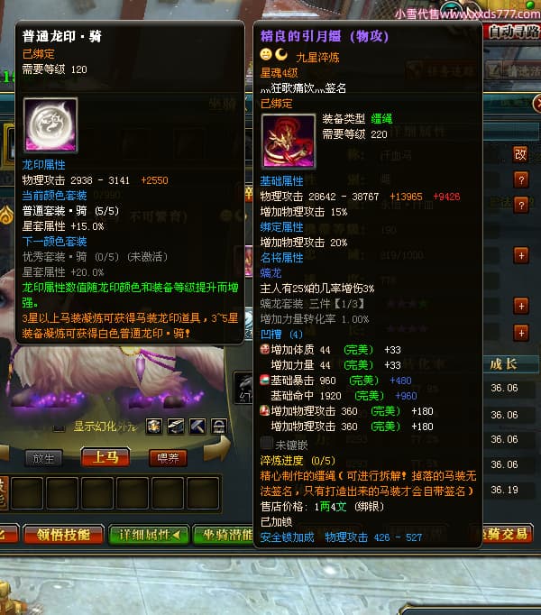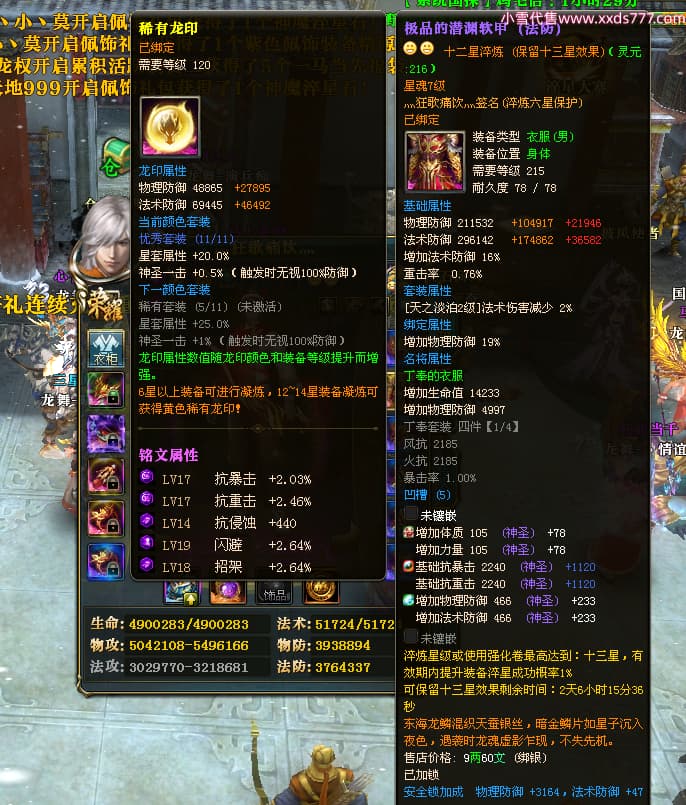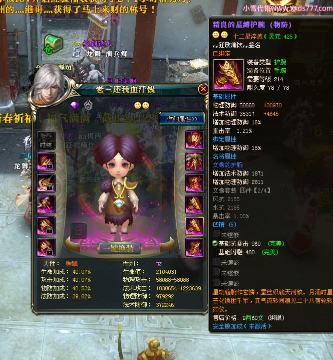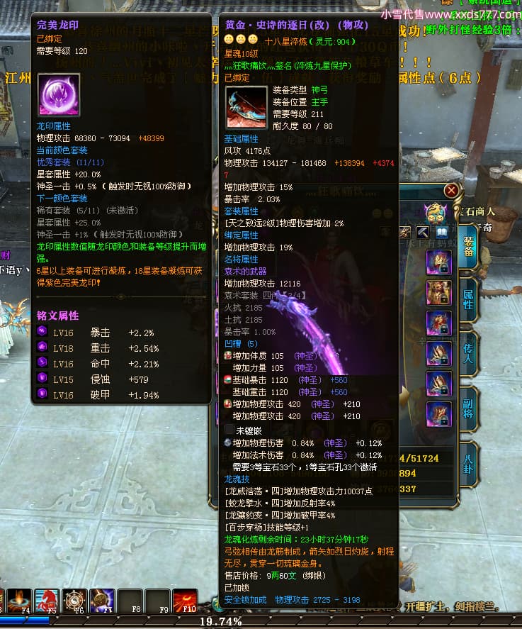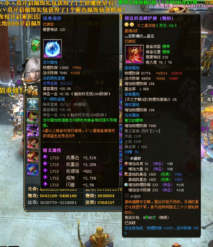 编号W24917 灬狂歌痛饮灬 龙舞九州 扬州 6323W战力 人物精良紫12X(1件18X) 传人精良紫12X 副将精良紫12X 马精良紫9X 马星魂3级 人物铭刻12级 点亮2件14星其余12星 马铭刻9级 点亮10星 人物蓝龙印(3件黄龙印1件紫龙印) 马白龙印 五等单双属性神圣完美无暇石头 蓝白孔 可以转移百分百安全