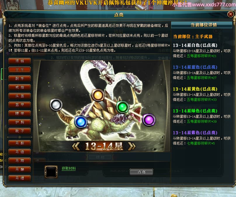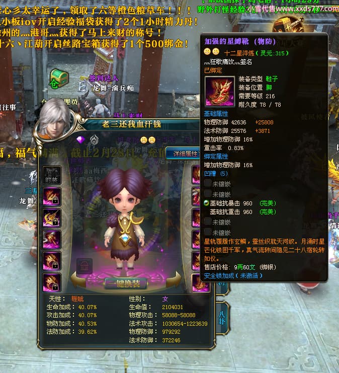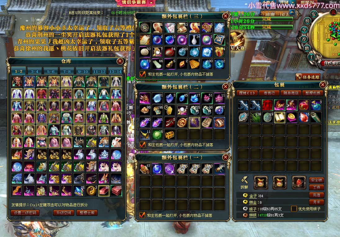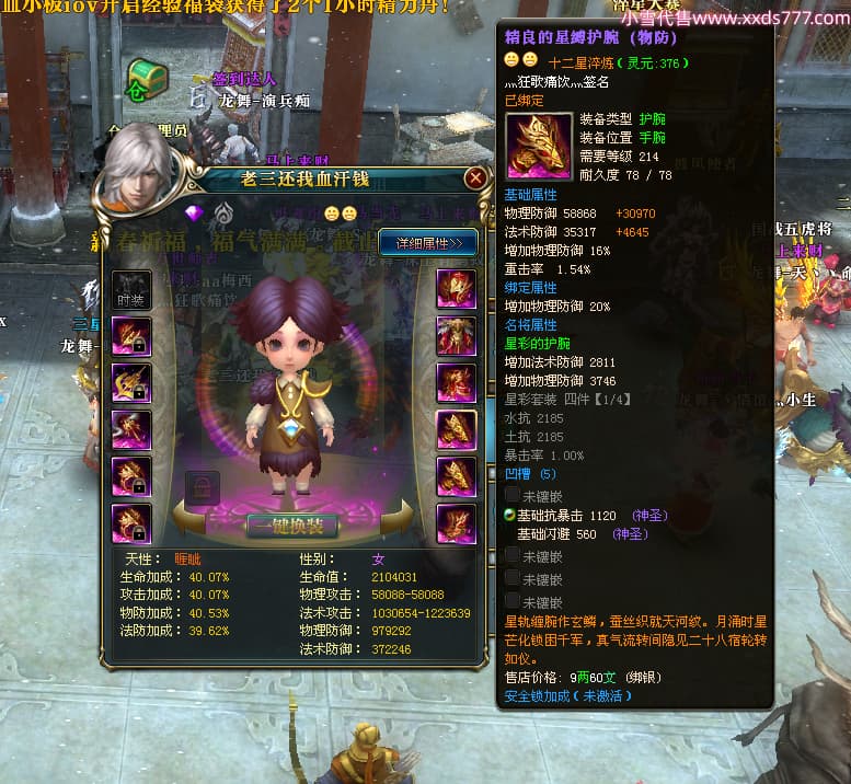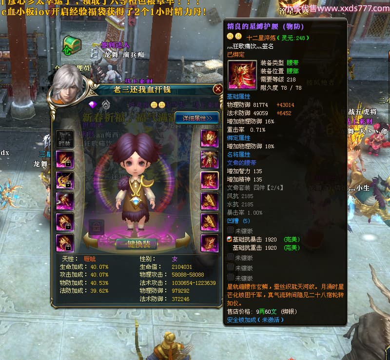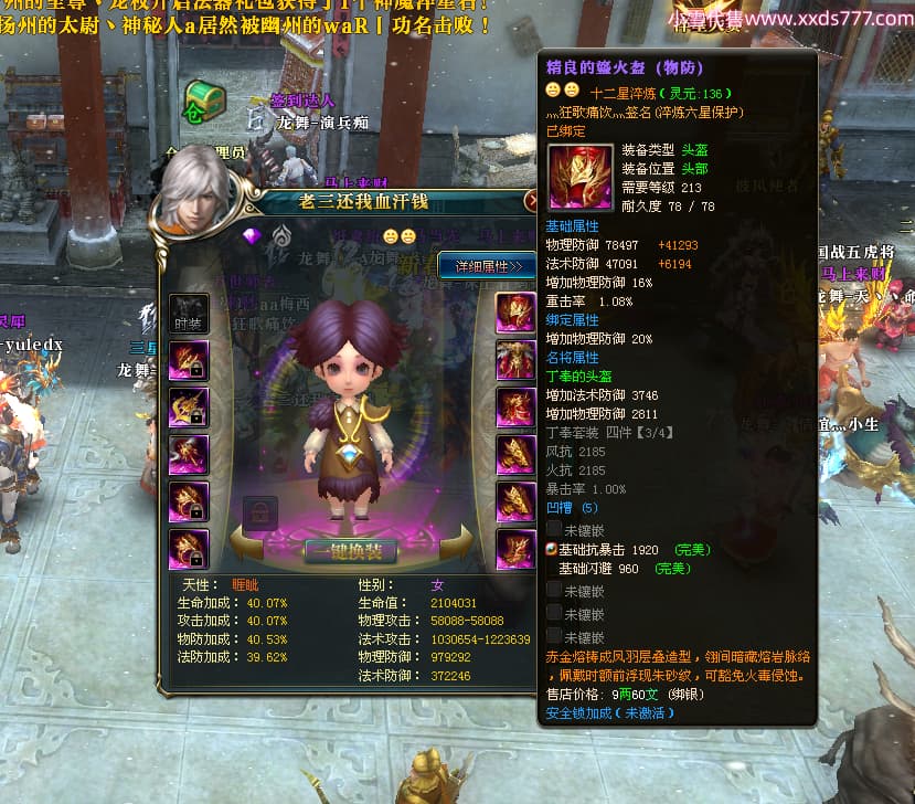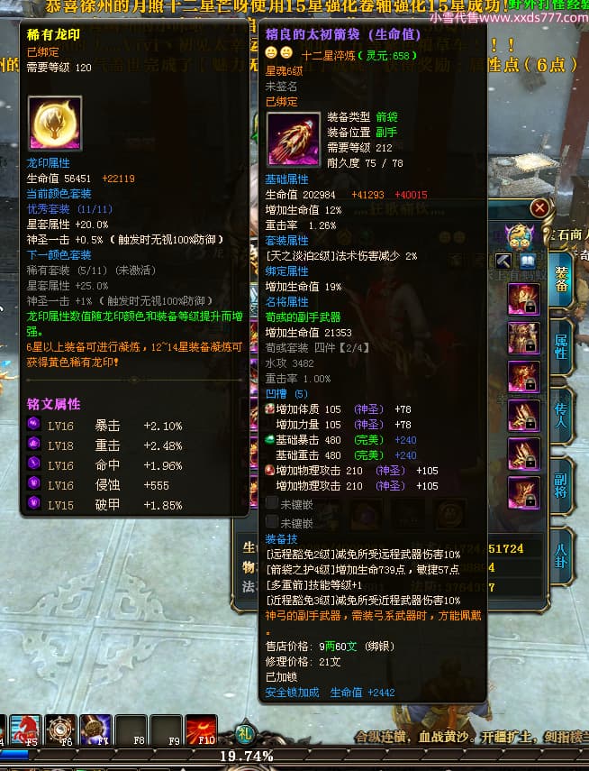 编号W24917 灬狂歌痛饮灬 龙舞九州 扬州 6323W战力 人物精良紫12X(1件18X) 传人精良紫12X 副将精良紫12X 马精良紫9X 马星魂3级 人物铭刻12级 点亮2件14星其余12星 马铭刻9级 点亮10星 人物蓝龙印(3件黄龙印1件紫龙印) 马白龙印 五等单双属性神圣完美无暇石头 蓝白孔 可以转移百分百安全
