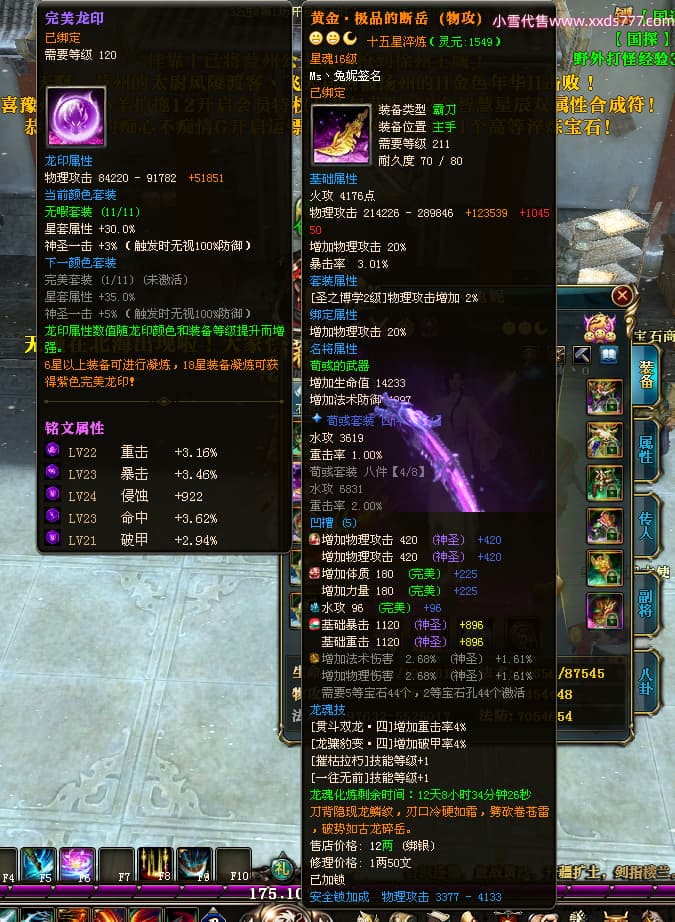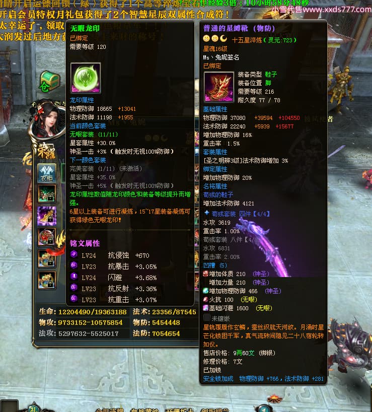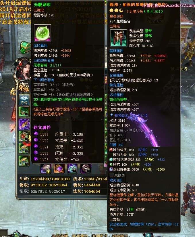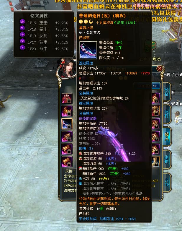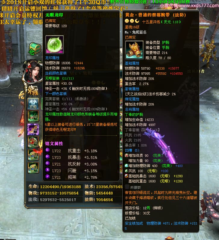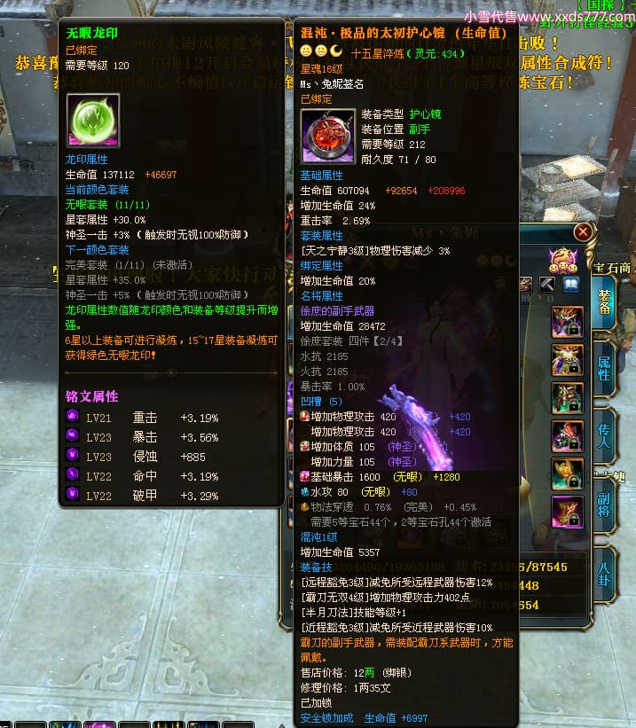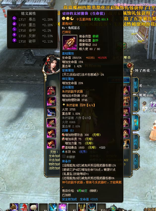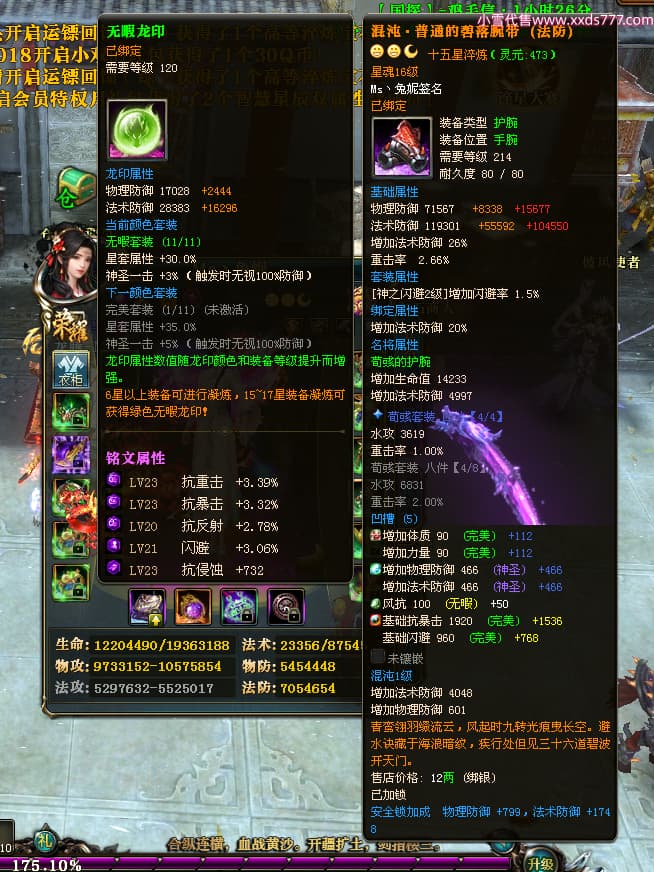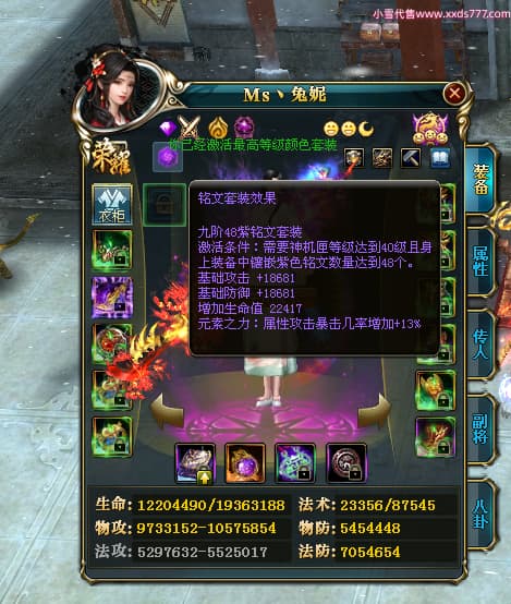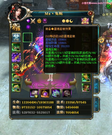 编号T24920 Ms丶兔妮 龙腾问鼎 江州 本国排名46名 14965W战力 人物黄金普通橙15X(5件混沌) 传人史诗紫12X 副将精良紫12X 马史诗紫10X 精良紫14披风 人物星魂16级 传人星魂7级 副将星魂6级 马星魂8级 人物铭刻15级 点亮4件16星其余14星 马铭刻3件13级其余12级 点亮12星 人物绿龙印(1件紫龙印) 马蓝龙印(1件黄龙印) 六等单双属性完美神圣石头 黄蓝孔