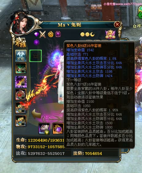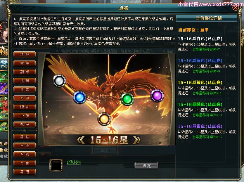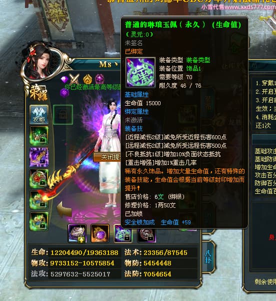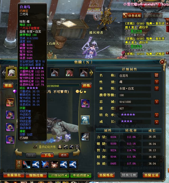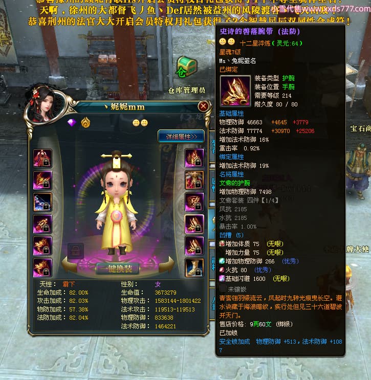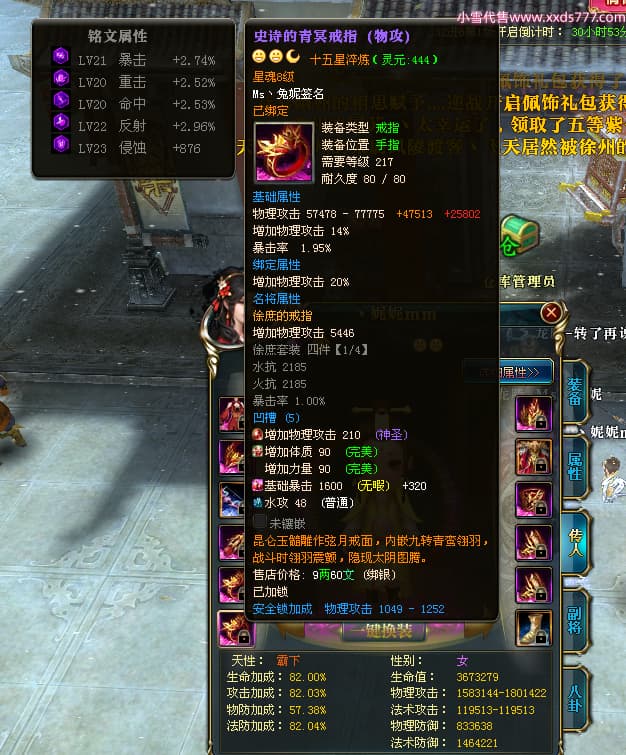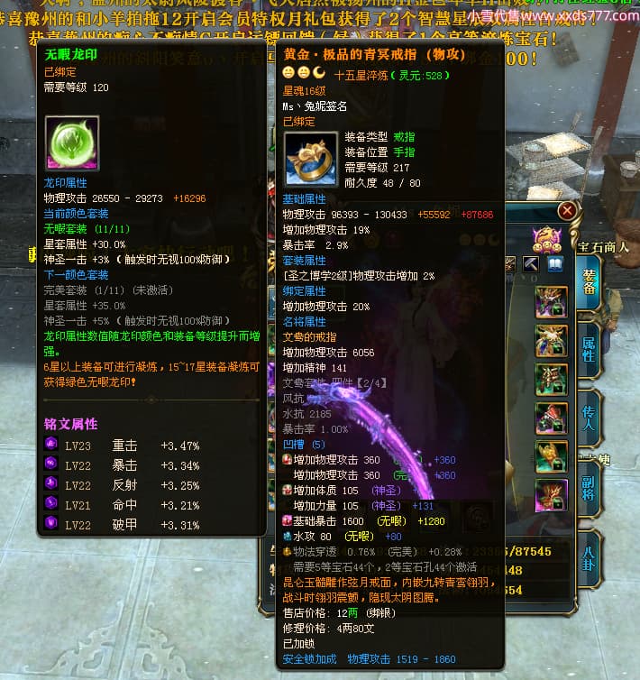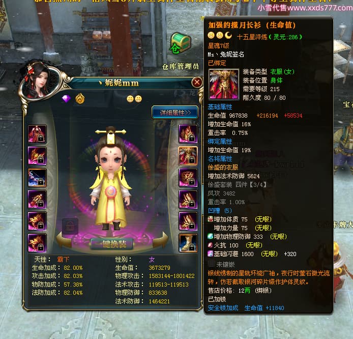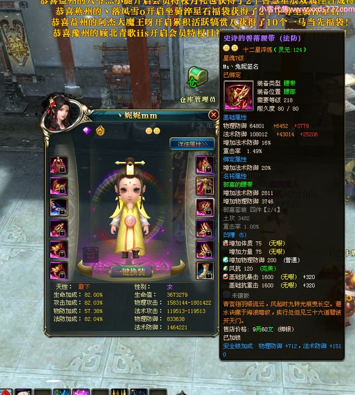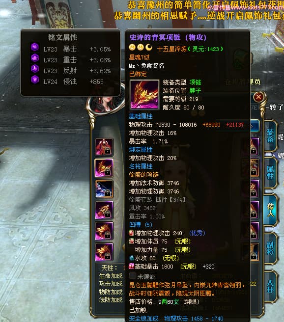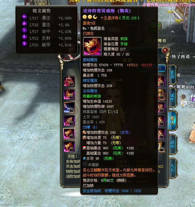 编号T24920 Ms丶兔妮 龙腾问鼎 江州 本国排名46名 14965W战力 人物黄金普通橙15X(5件混沌) 传人史诗紫12X 副将精良紫12X 马史诗紫10X 精良紫14披风 人物星魂16级 传人星魂7级 副将星魂6级 马星魂8级 人物铭刻15级 点亮4件16星其余14星 马铭刻3件13级其余12级 点亮12星 人物绿龙印(1件紫龙印) 马蓝龙印(1件黄龙印) 六等单双属性完美神圣石头 黄蓝孔