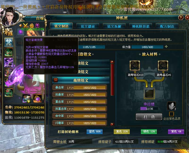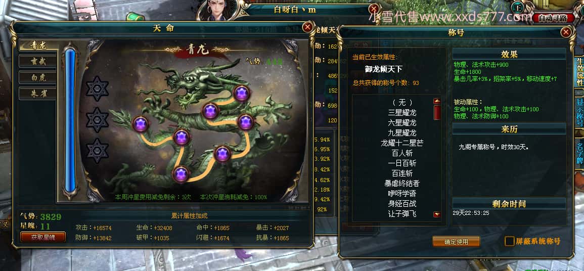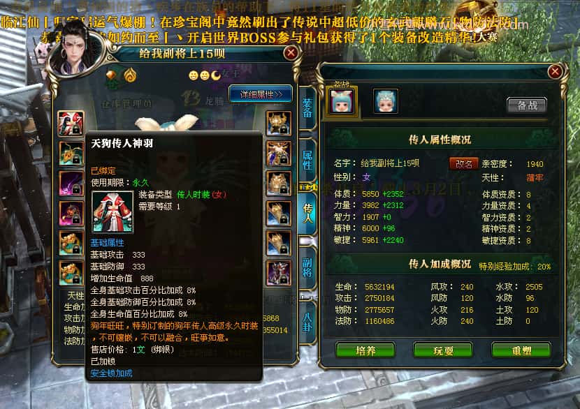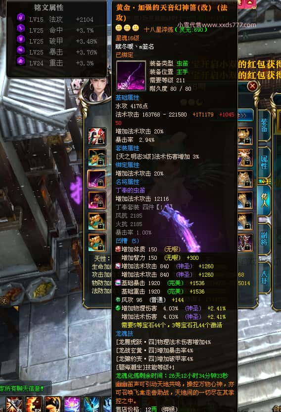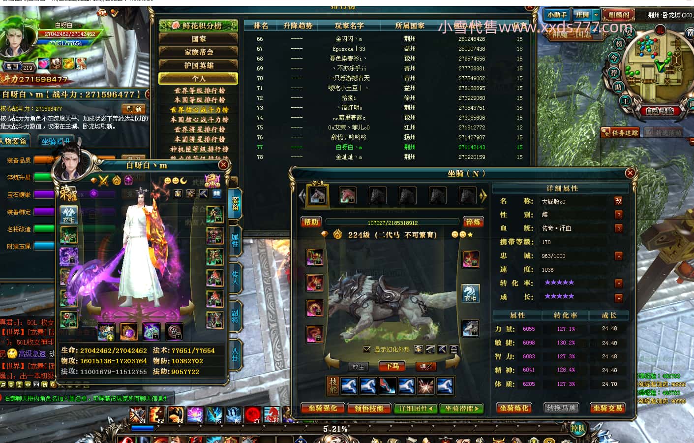 编号T24930 白呀白丶m 龙腾问鼎 荆州 世界排名76名 27159W战力 人物黄金极品橙16X(2件18X 10件混沌) 传人黄金普通橙15X(武器衣服18X) 副将精良紫12X 马加强橙13X(4疾行) 极品紫16披风 人物星魂16级 传人星魂16级 副将星魂6级 马星魂16级 人物铭刻2件18级其余16级 人物主手点亮18衣服18点亮绿色 其余16星 马铭刻13级 点亮14星 人绿龙印(1件紫龙印) 马黄龙印(2件绿) 五六等单双属性神圣完美无暇石头 黄绿孔 已开完了永久15星套 可以转移百分百安全 国婚时装