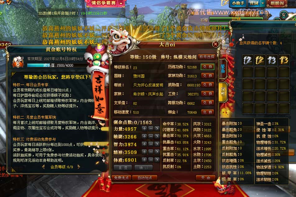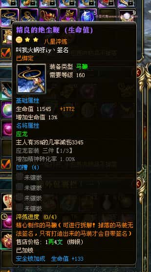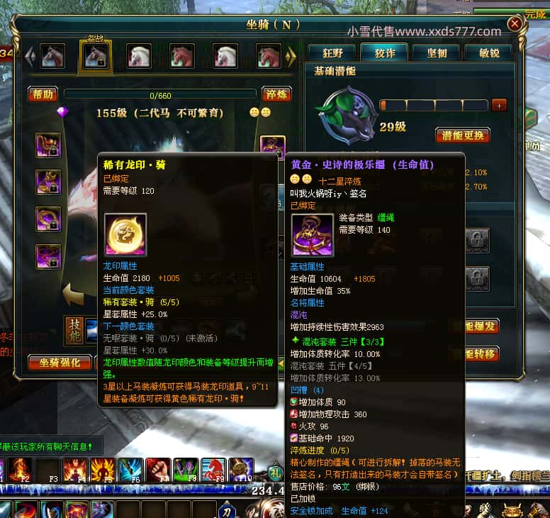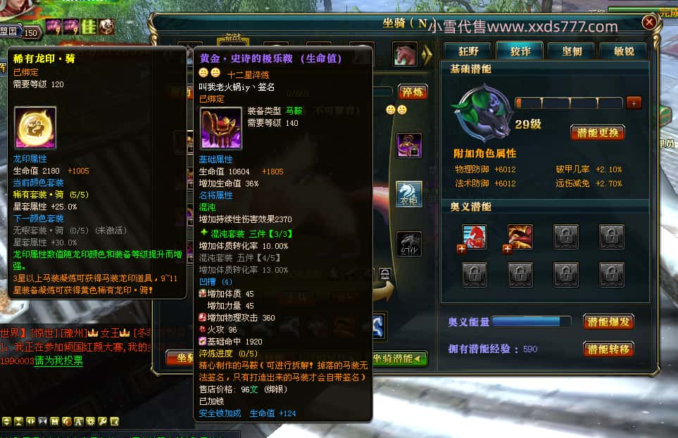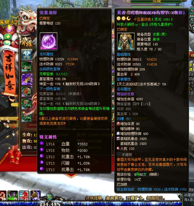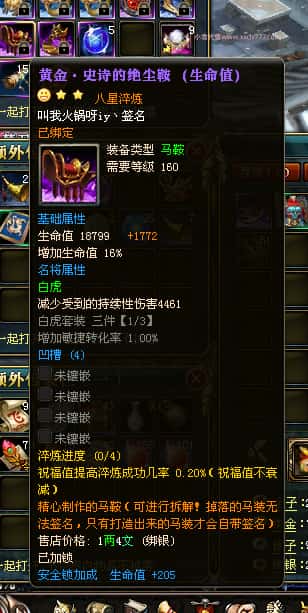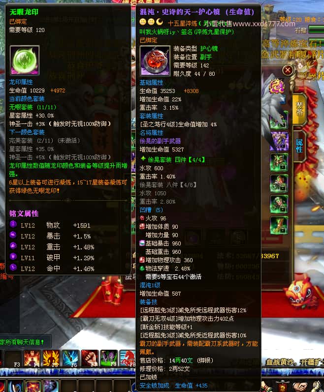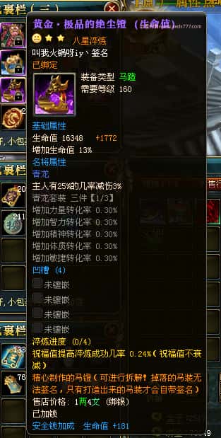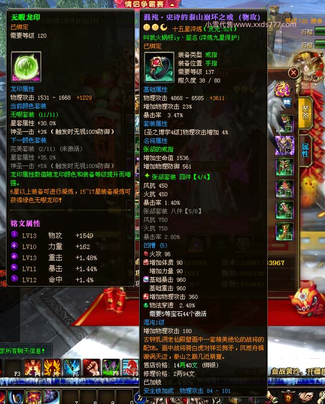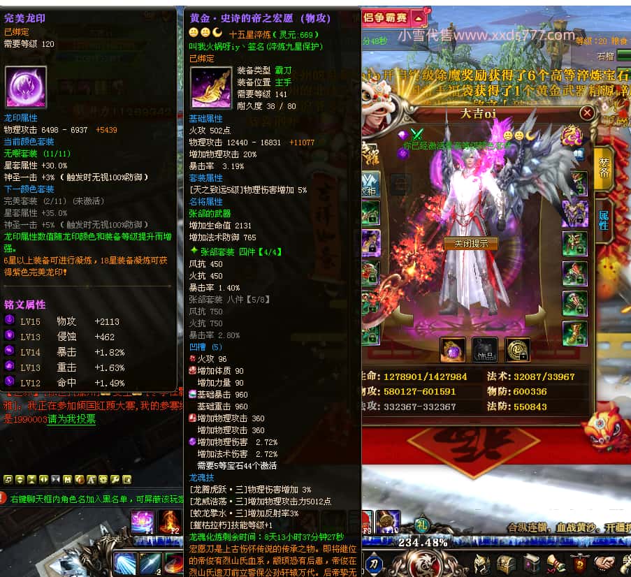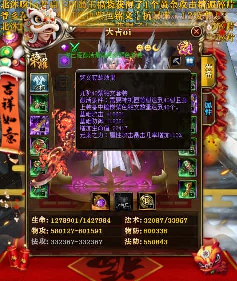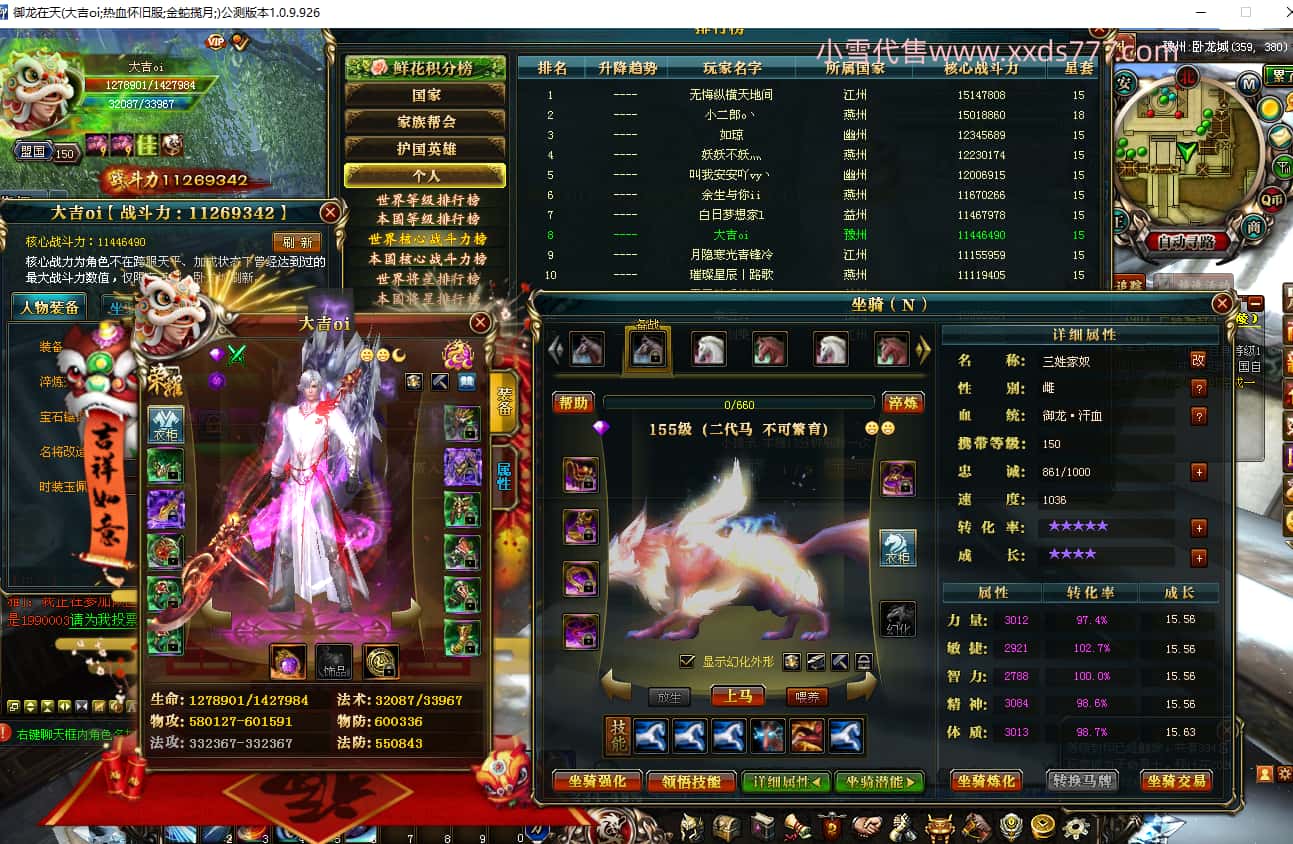 编号J24932 大吉oi 金蛇揽月 豫州 世界排第8名 1126W战力 人物黄金史诗紫15X(8件混沌) 马黄金史诗紫12X 龙魂190级 人物2件紫+9件绿龙印 马黄龙印 6666等单双属性石头 已开3次永久15星套 可以转移百分百安全