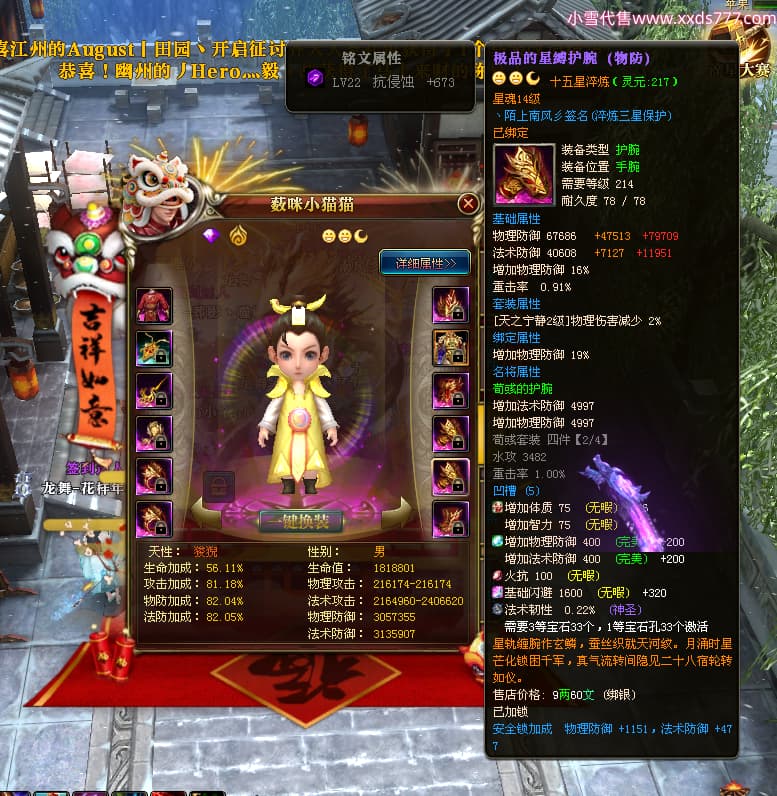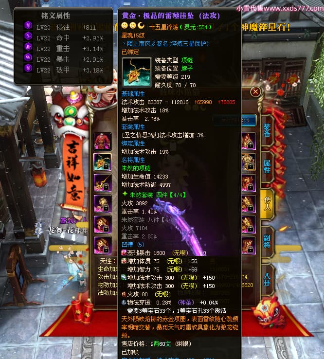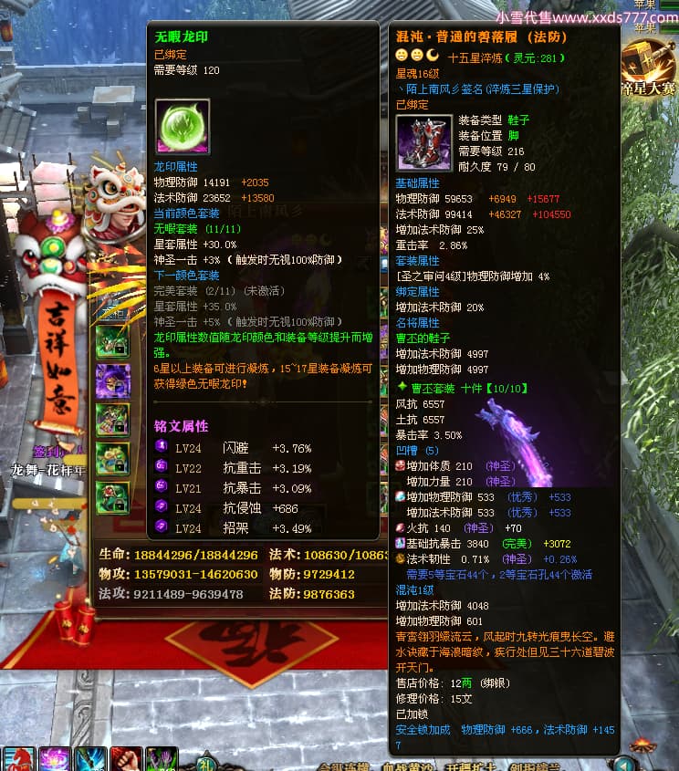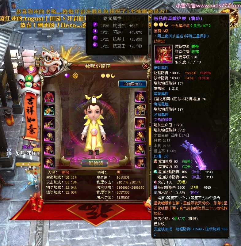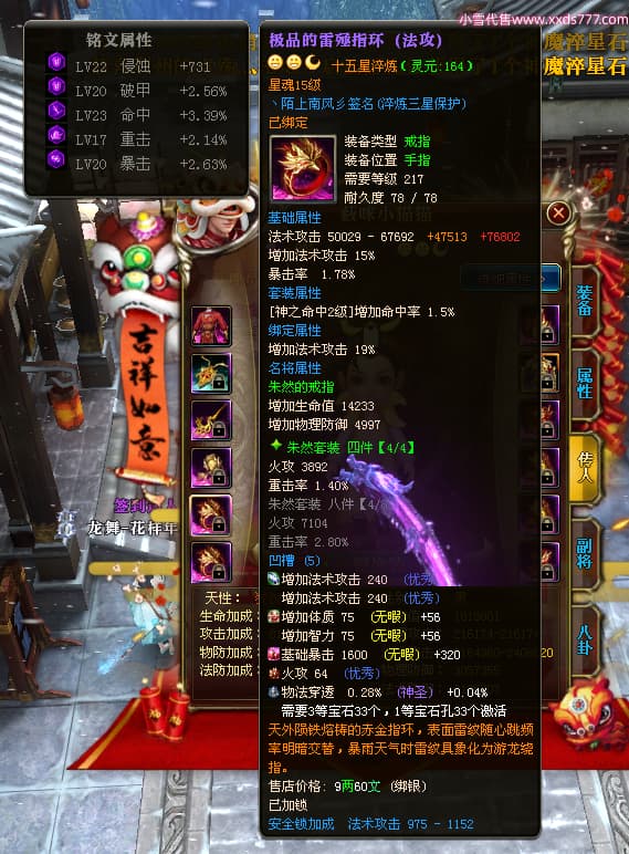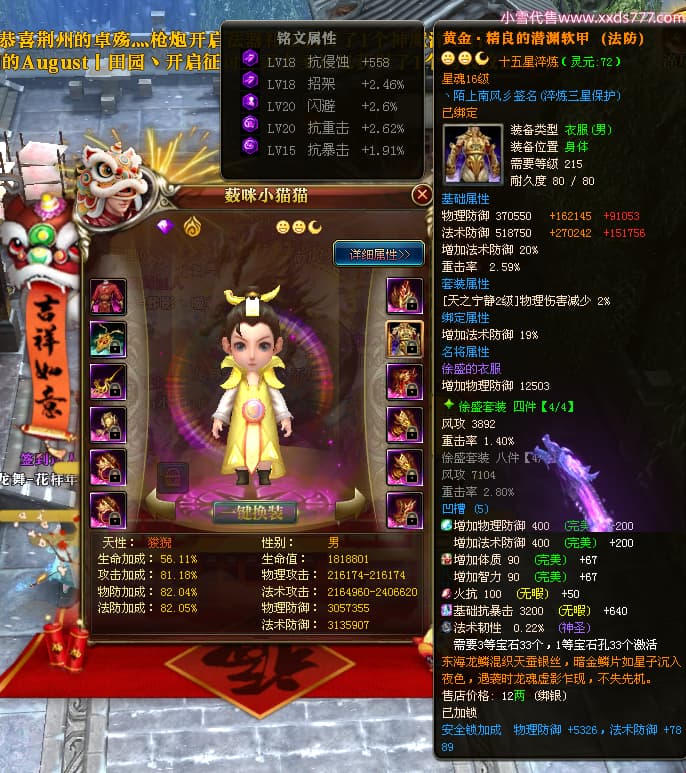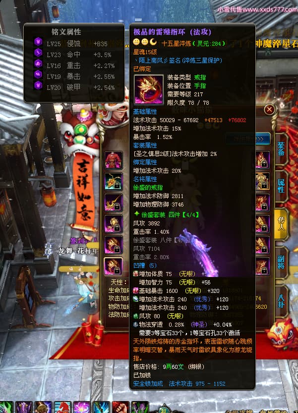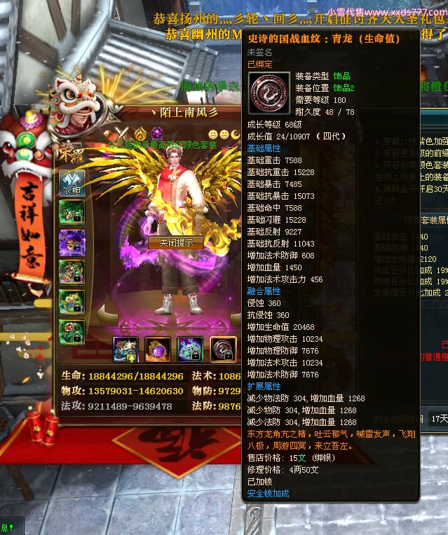 编号W24945 丶陌上南风彡 龙舞九州 扬州 本国排名10名 21056W战力 人物黄金极品橙15X(8件混沌) 传人极品紫15X 副将极品紫12X 马加强橙12X 极品紫15披风 人物星魂16级 传人星魂14级 副将星魂6级 马星魂16级 人物铭刻2件16级其余15级 点亮16星 马铭刻14级 点亮12星 人物绿龙印(2件紫龙印) 马黄龙印 六等单双属性神圣完美无暇石头 黄蓝孔