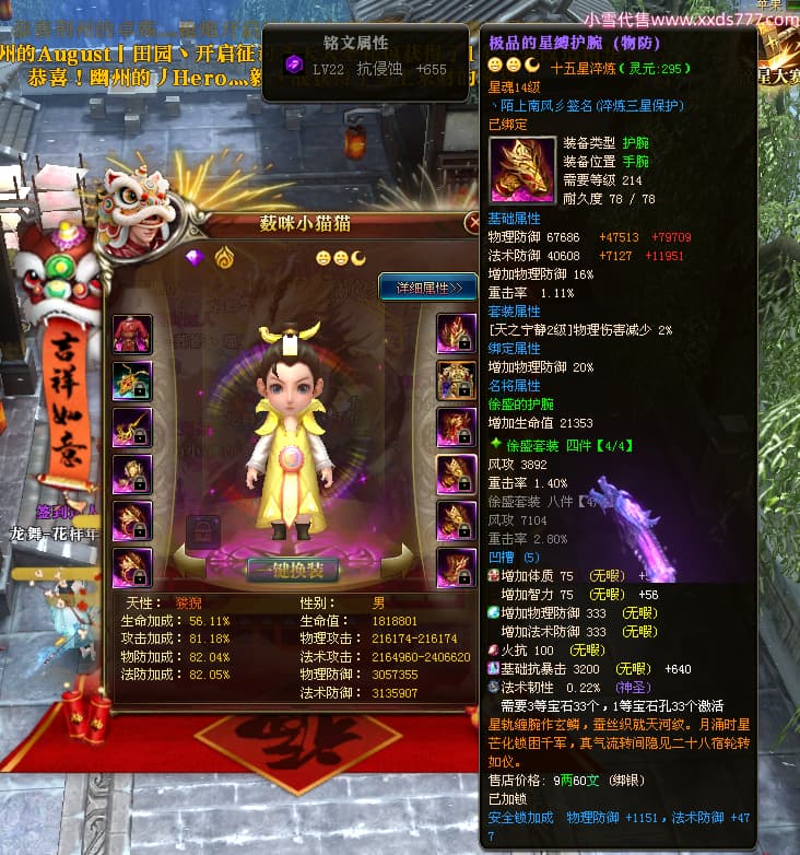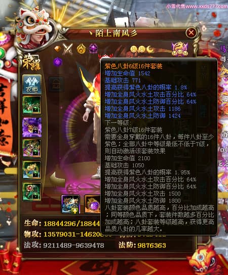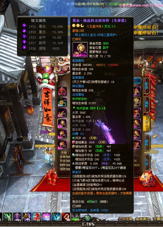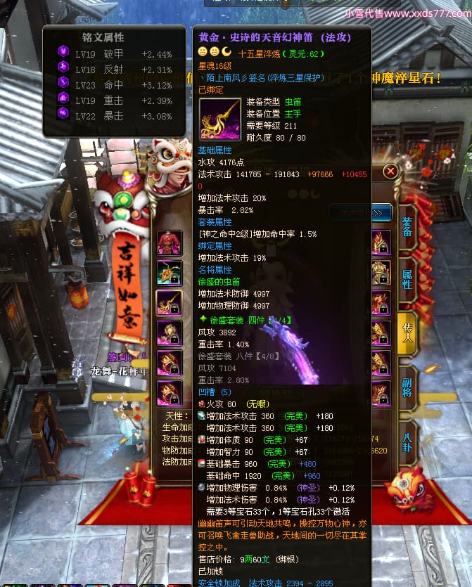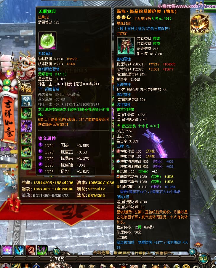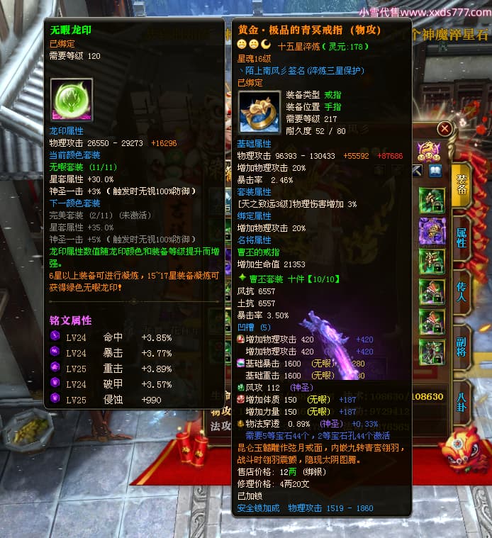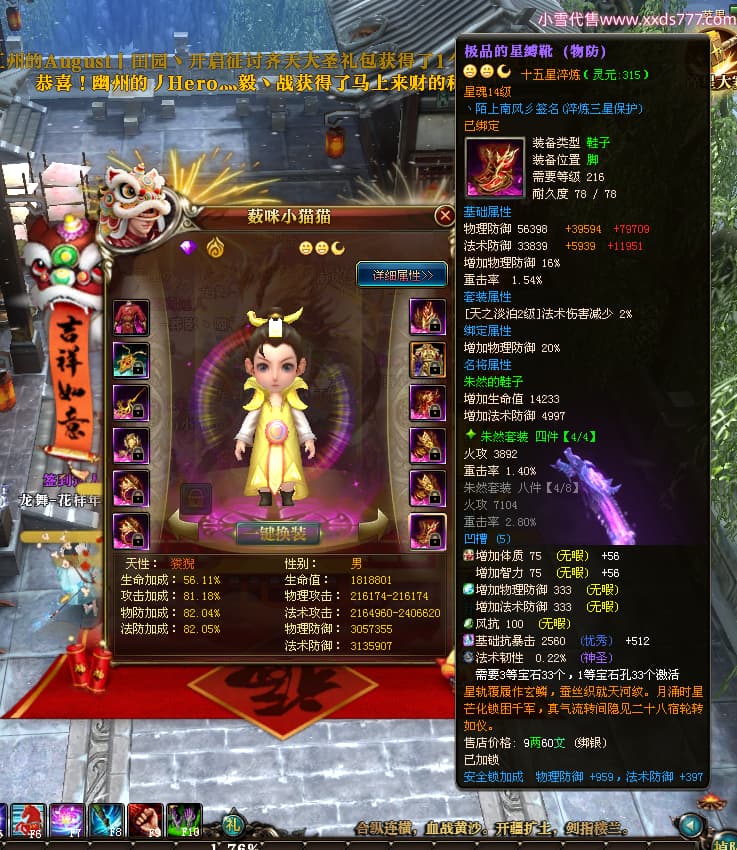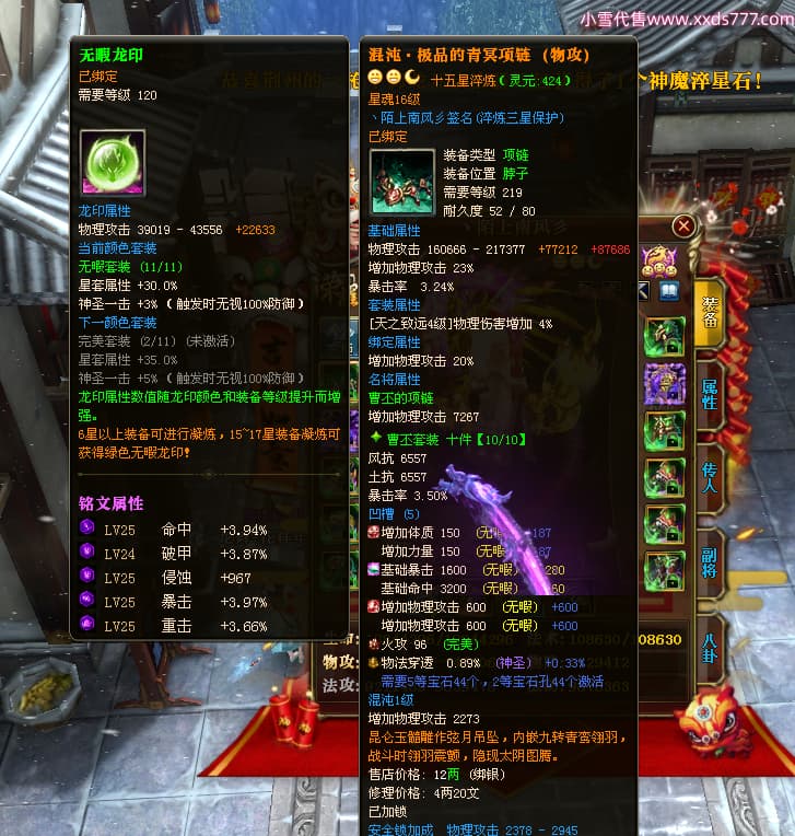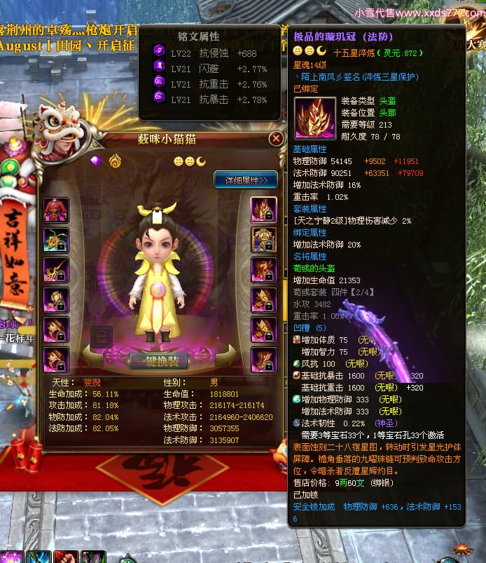 编号W24945 丶陌上南风彡 龙舞九州 扬州 本国排名10名 21056W战力 人物黄金极品橙15X(8件混沌) 传人极品紫15X 副将极品紫12X 马加强橙12X 极品紫15披风 人物星魂16级 传人星魂14级 副将星魂6级 马星魂16级 人物铭刻2件16级其余15级 点亮16星 马铭刻14级 点亮12星 人物绿龙印(2件紫龙印) 马黄龙印 六等单双属性神圣完美无暇石头 黄蓝孔