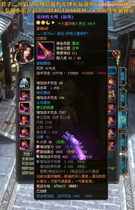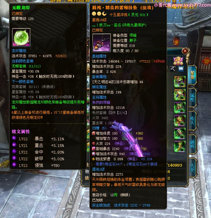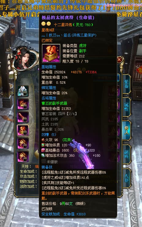 编号Z24953 灬丨妖刀se丶 逐鹿天下 扬州 本国排名29名 14931W战力 人物黄金史诗紫12X(1件18X6件15X5件混沌) 传人精良紫12X 副将精良紫12X 马史诗紫12X 精良紫15披风 人物星魂16级 传人星魂6级 副将星魂6级 马星魂10级 人物铭刻4件15级其余14级 人物点亮3件16星其余14星 马铭刻12级 点亮12星 人绿龙印 马黄龙印 六等单双属性神圣完美无暇石头 蓝黄孔 已开启永久15星套