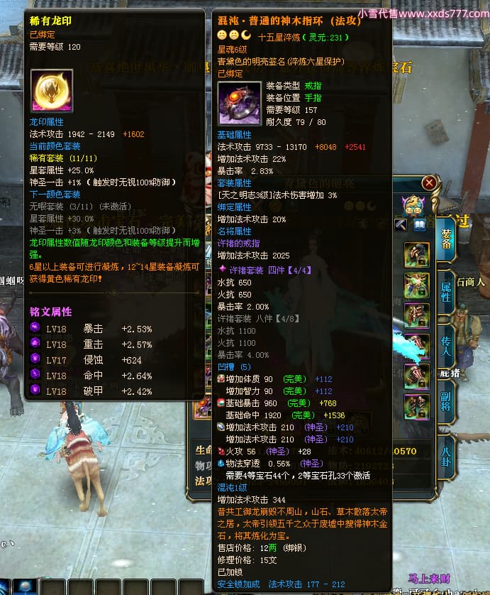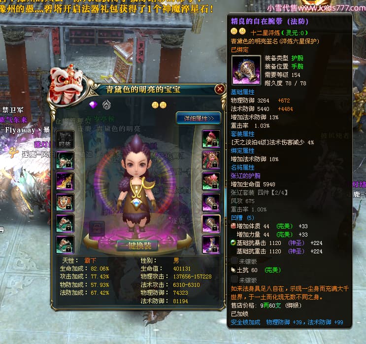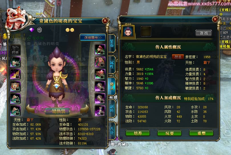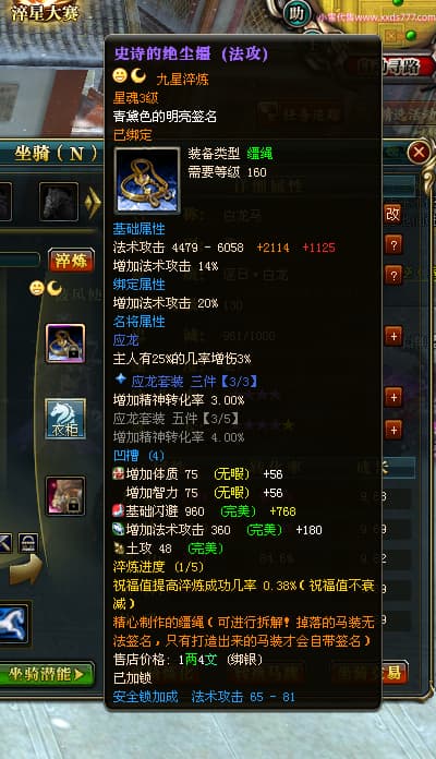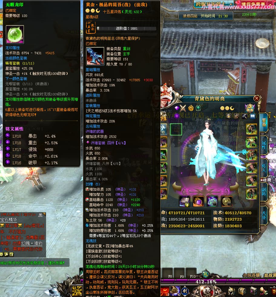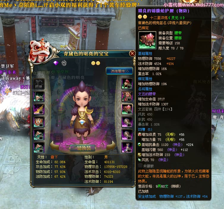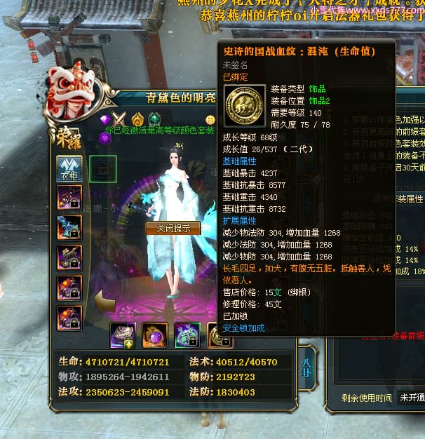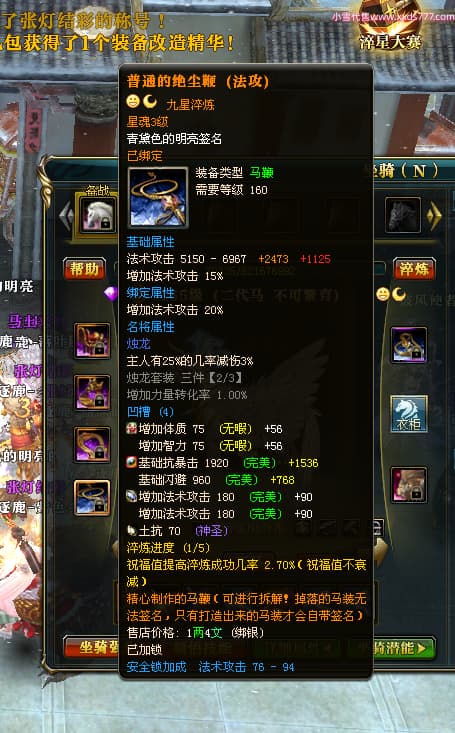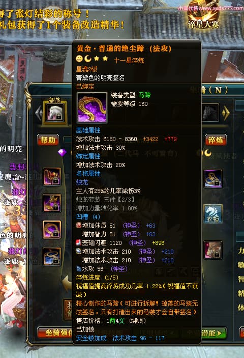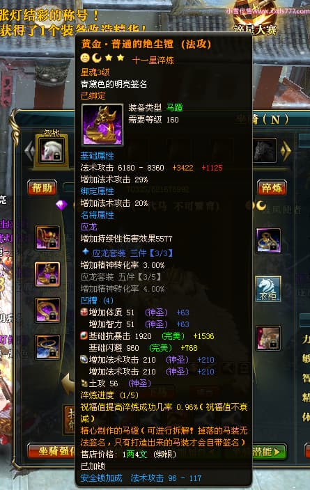 编号Z24955 青黛色的明亮 逐鹿天下 幽州 160级 3882W战力 人物黄金史诗紫15X(9件混沌) 传人精良紫12X 马普通橙9X 人物星魂6级 人物铭刻12级 马铭刻12级 点亮10星 人物黄龙印(3件绿龙印) 五六等单双属性神圣完美无瑕石头 蓝黄孔