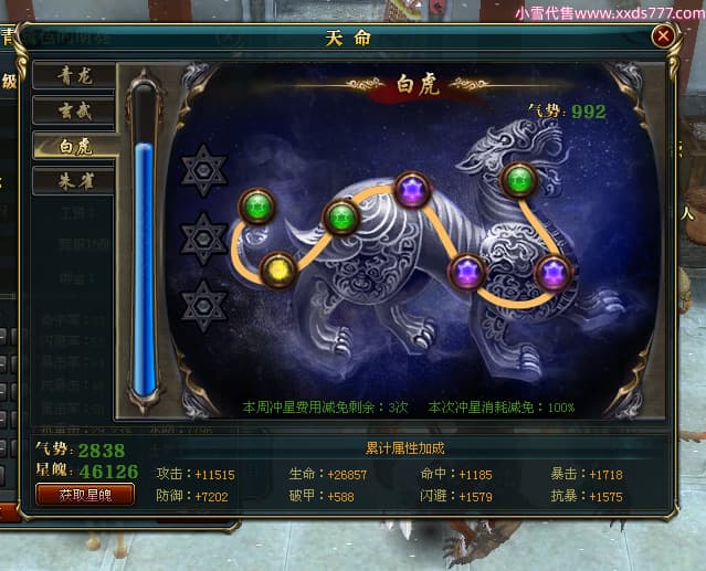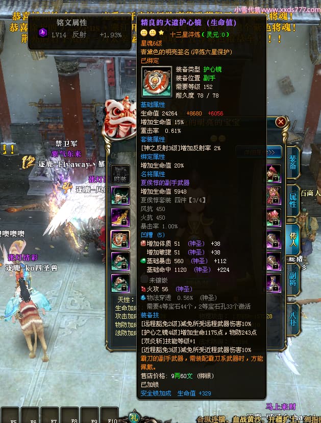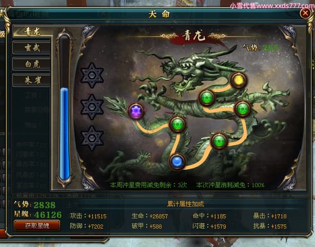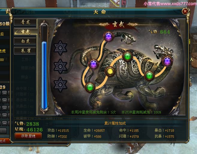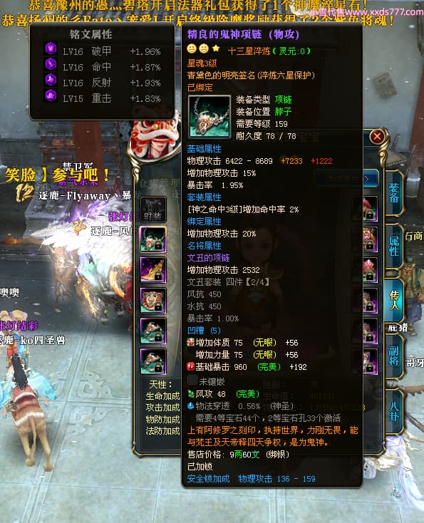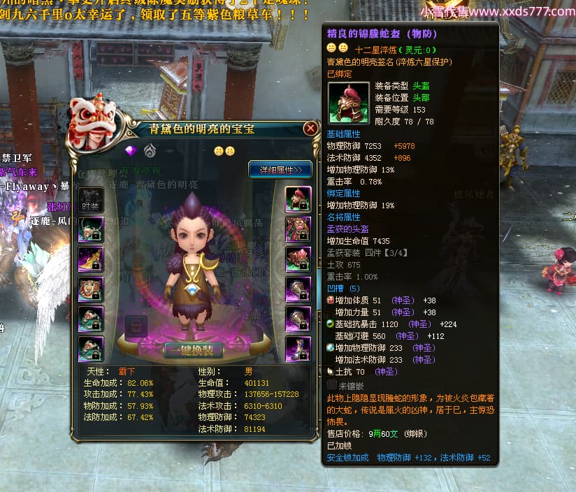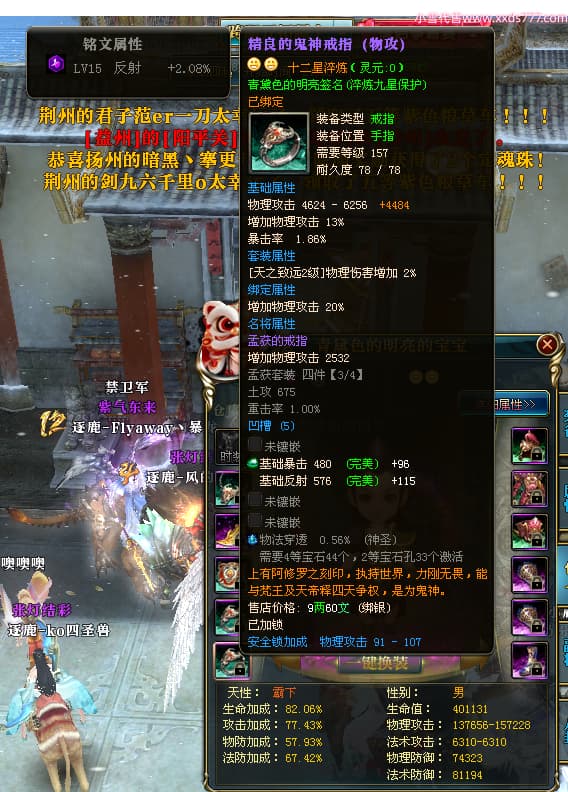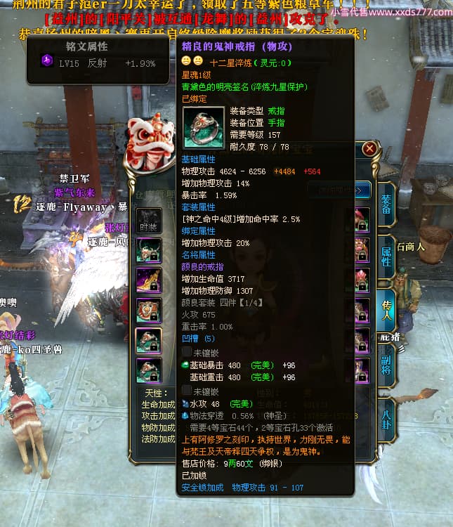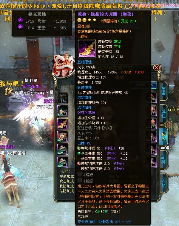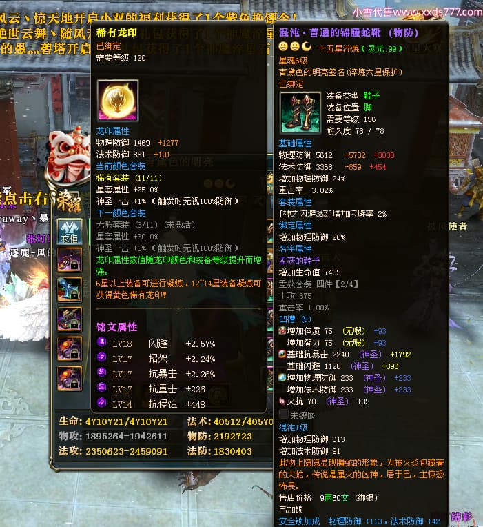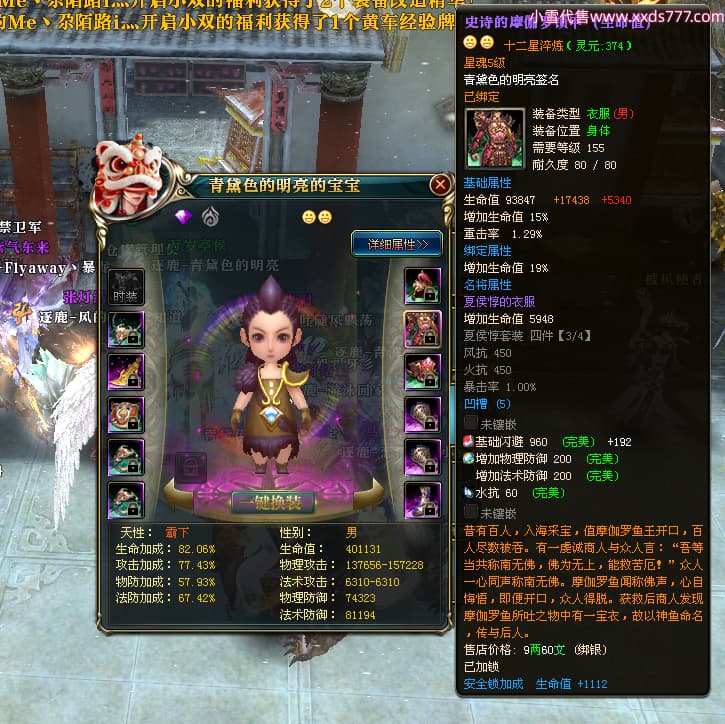 编号Z24955 青黛色的明亮 逐鹿天下 幽州 160级 3882W战力 人物黄金史诗紫15X(9件混沌) 传人精良紫12X 马普通橙9X 人物星魂6级 人物铭刻12级 马铭刻12级 点亮10星 人物黄龙印(3件绿龙印) 五六等单双属性神圣完美无瑕石头 蓝黄孔
