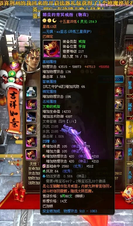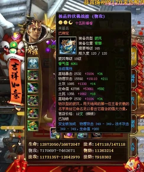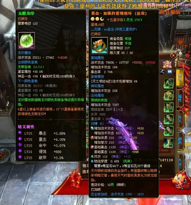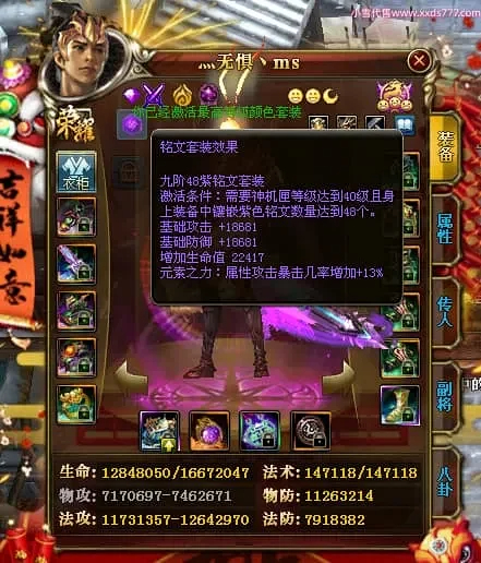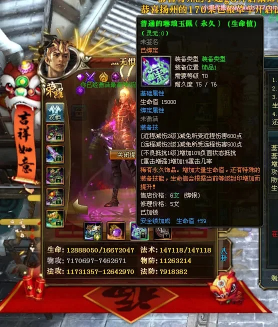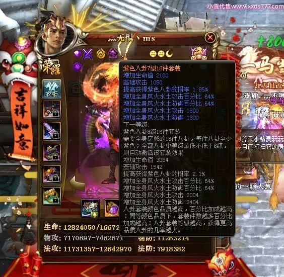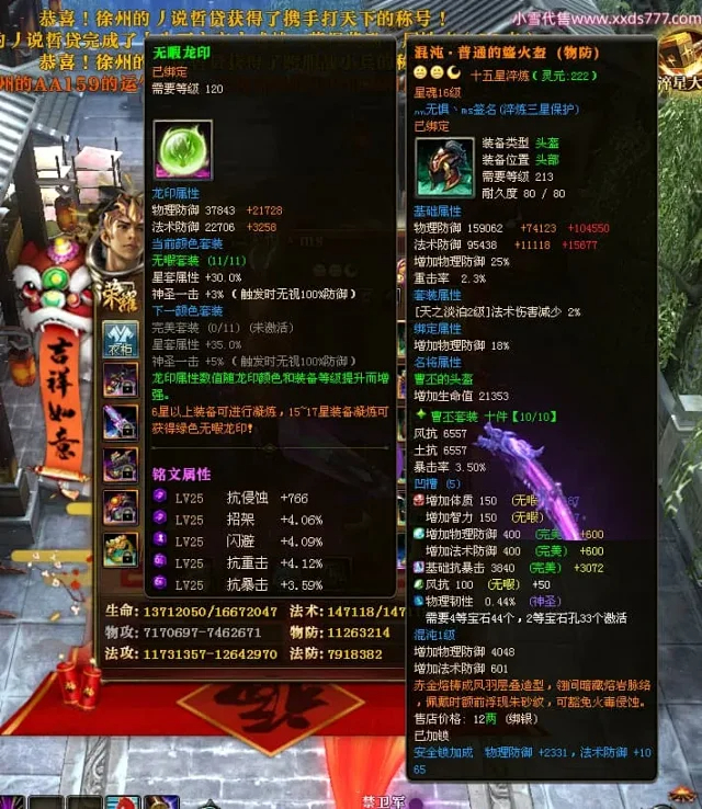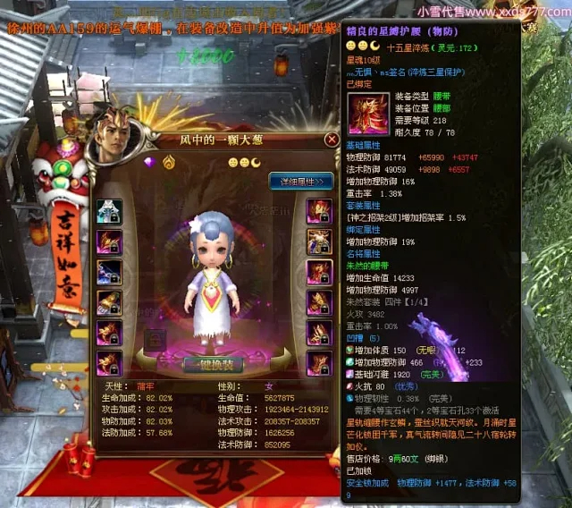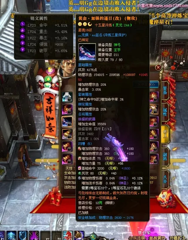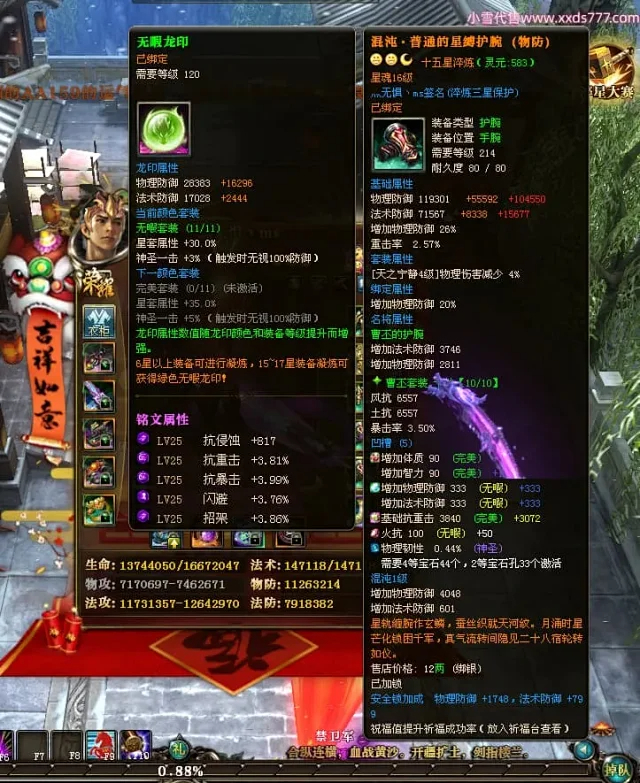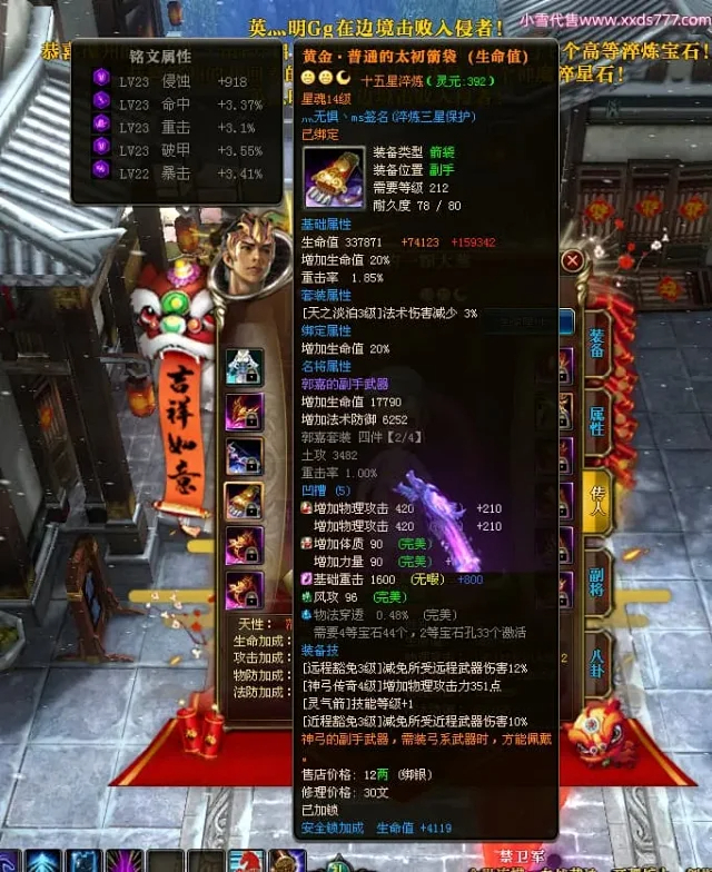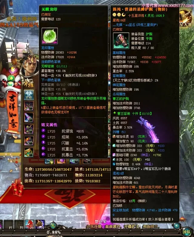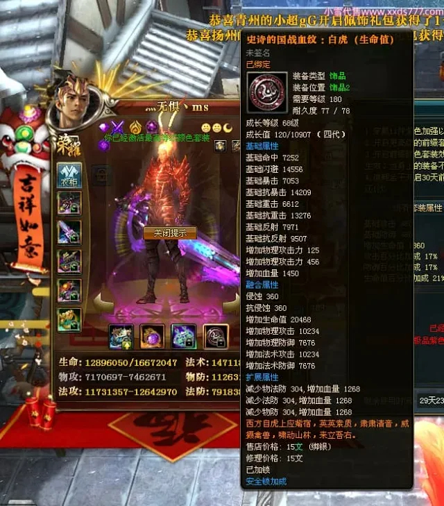 编号Z24863 灬无惧丶ms 逐鹿天下 豫州 本国排名第19名 18826W战力 人物黄金普通橙15X(7件混沌) 传人精良紫15X 副将精良紫15X 马普通橙12X 极品紫15披风 人物星魂16级 传人9级 副将6级 马星魂13级 人物铭刻15级 点亮16星 马铭刻12级 点亮12星 人物绿龙印 马黄龙印 五六等单双属性神圣完美无暇石头 黄蓝孔