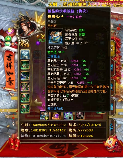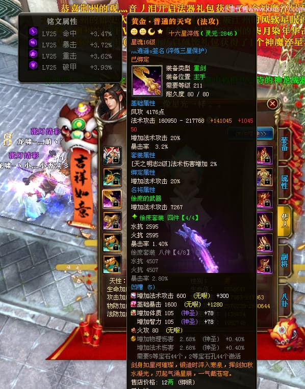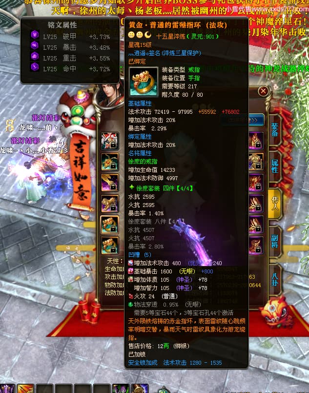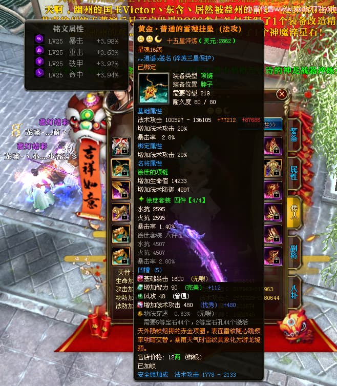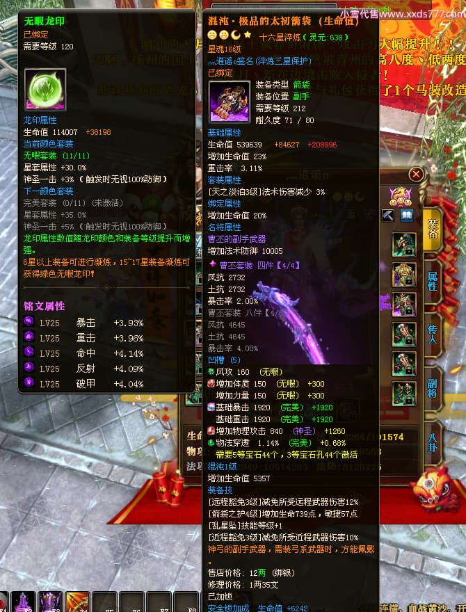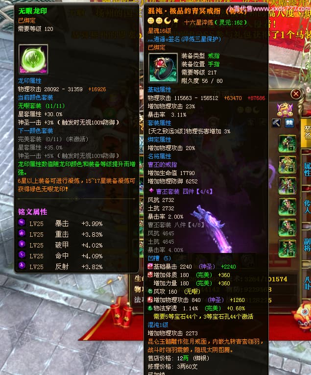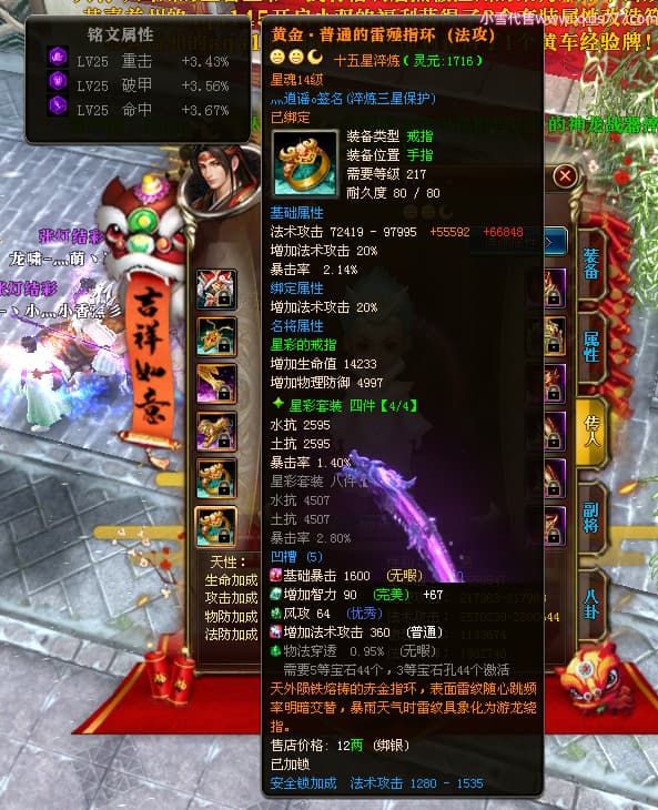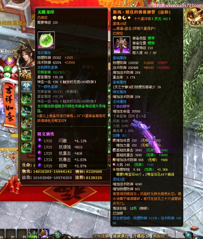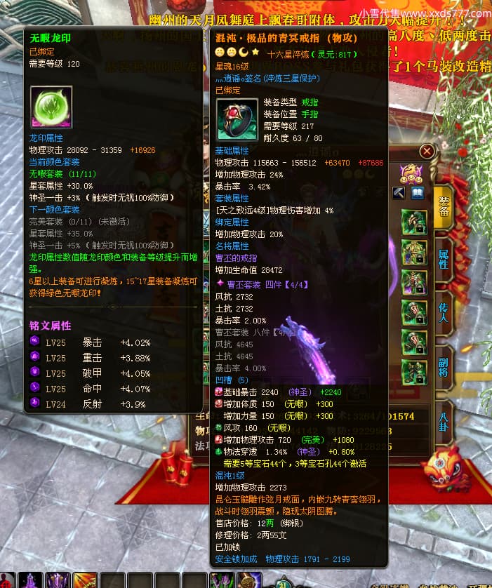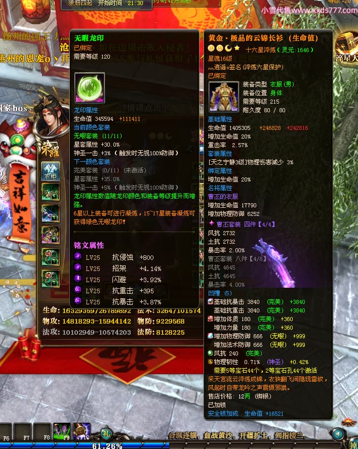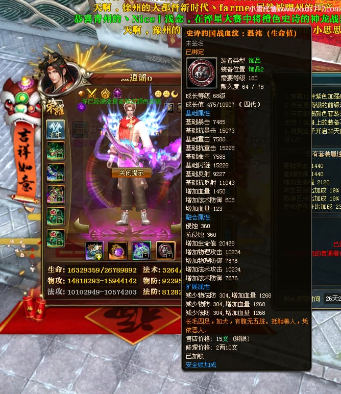 编号X24998 灬逍谣o 龙啸风云 青州 本国排名91名 24178W战力 人物黄金精良橙16X(1件18X9件混沌) 传人史诗紫15X 副将史诗紫15X 马黄金普通橙13X 极品紫16披风 人物星魂16级 传人星魂12级 副将星魂6级 马星魂16级 人物铭刻1件17级其余16级 点亮16星 马铭刻13级 点亮14星 人物绿龙印 马绿龙印 六等单双属性神圣完美无暇石头 黄绿孔