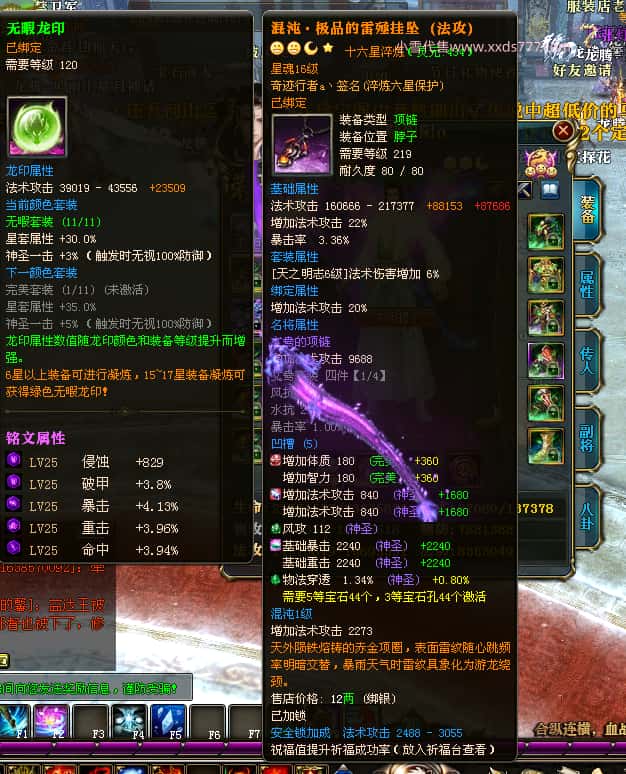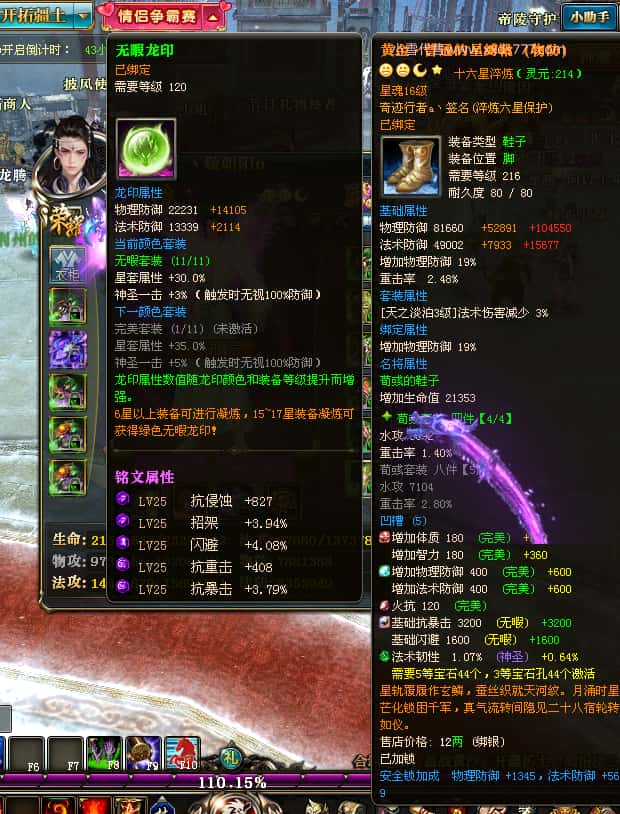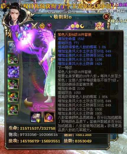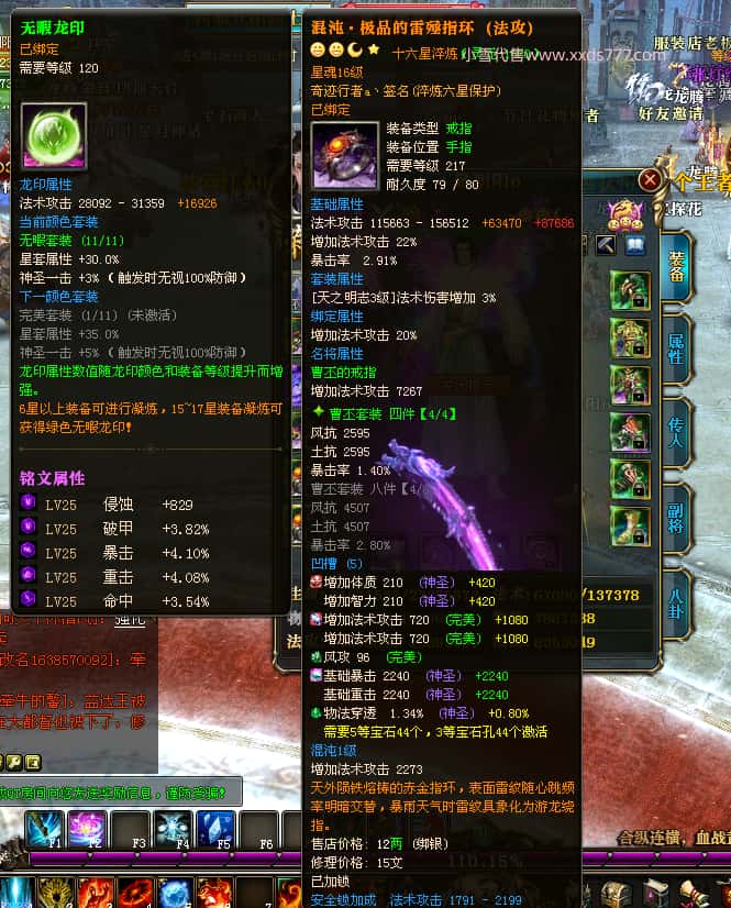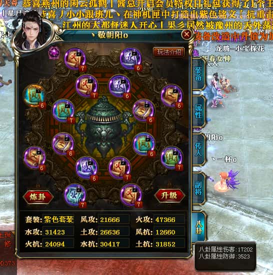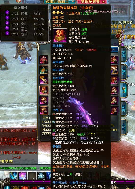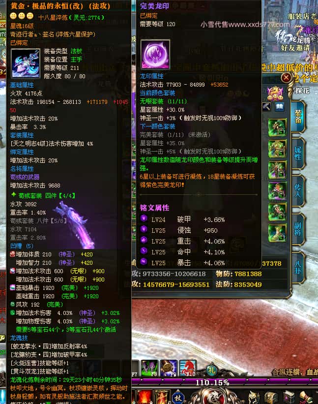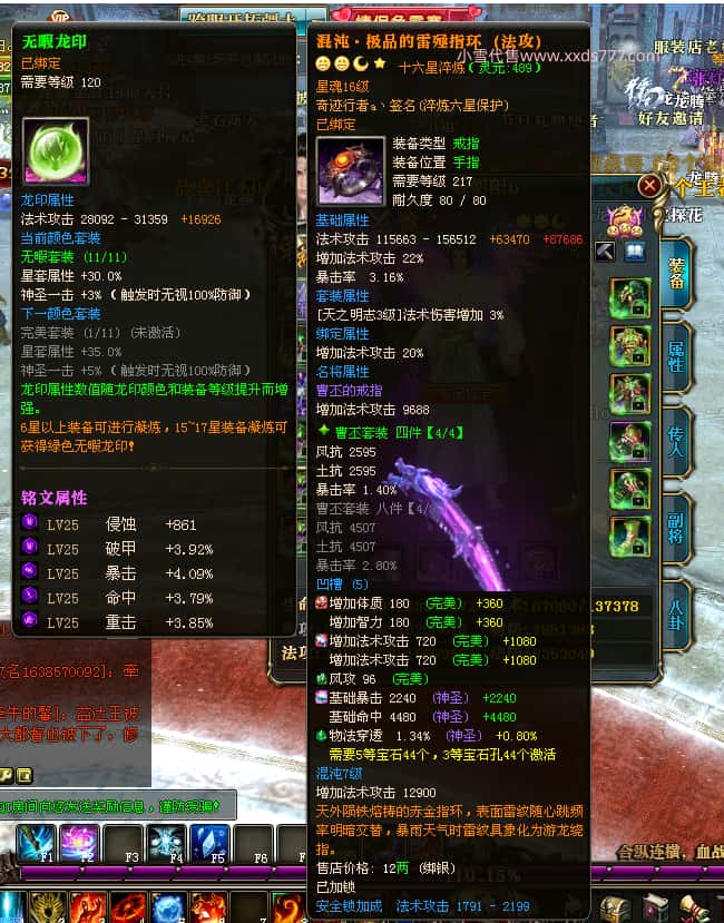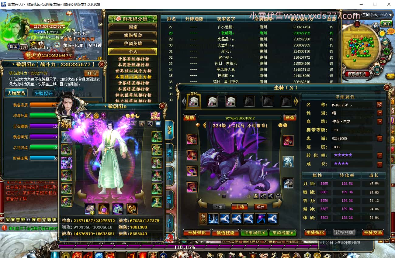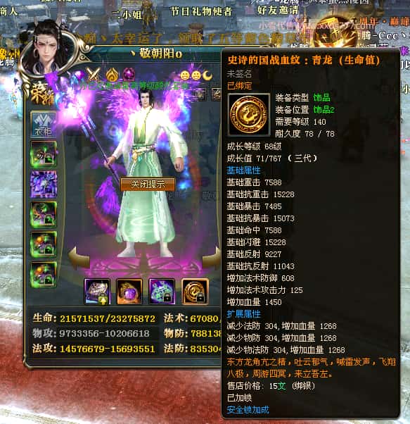 编号T25016 丶敬朝阳o 龙腾问鼎 荆州 本国排名第28名 23032W战力 人物黄金极品橙15X(武器18X 8件混沌) 传人极品紫15X 副将极品紫13X 马加强橙12X 极品紫15披风 人物星魂16级 传人15级 副将6级 马星魂16级 人物铭刻(主手18级,项链/副手/盔甲16级,剩下的15级) 点亮16星 马铭刻2件14级3件13级 点亮12星 人物1件紫+10件绿龙印 马黄龙印 五六等单双属性神圣完美无瑕石头 绿黄孔 已经开完永久15星套 可以转移百分百安全