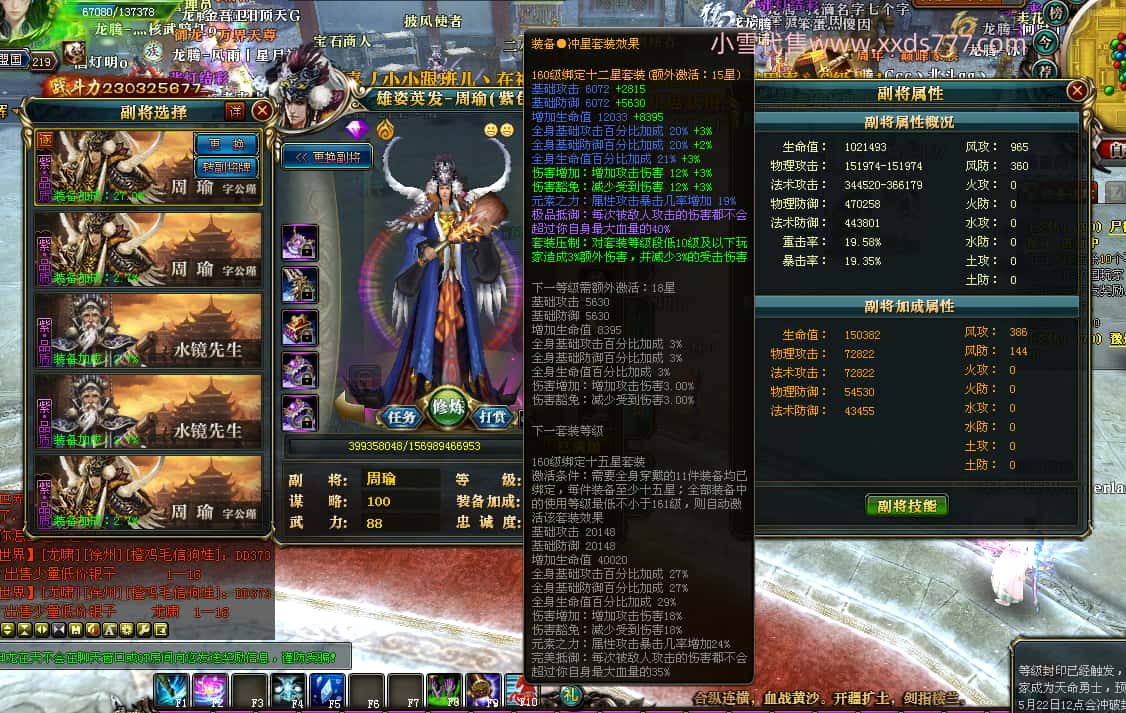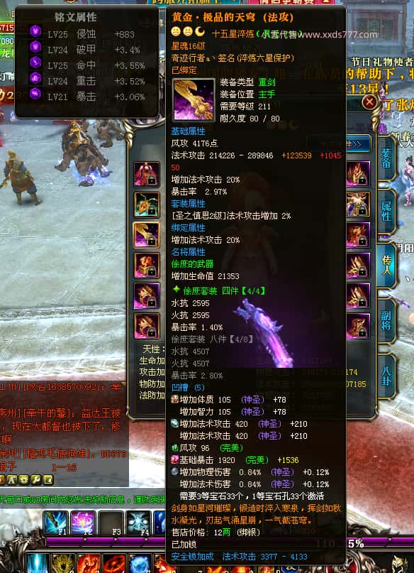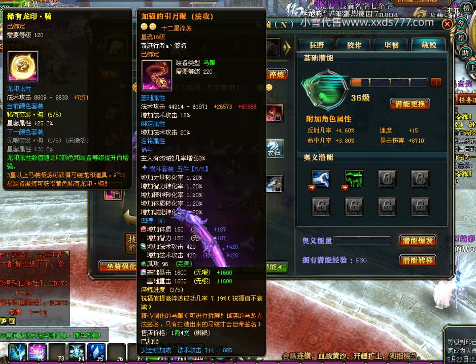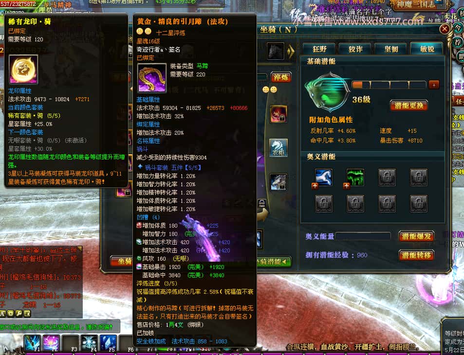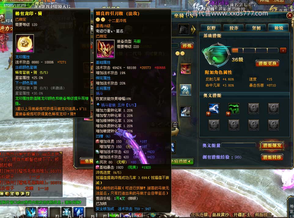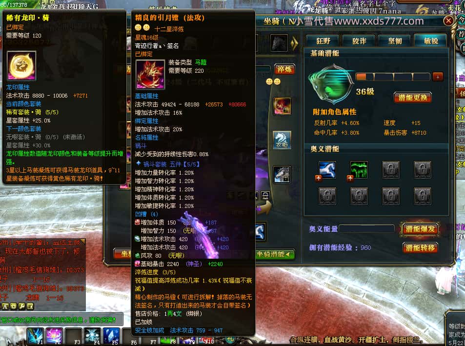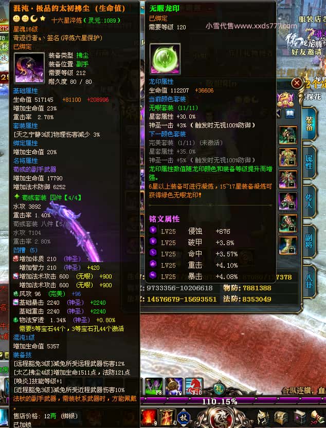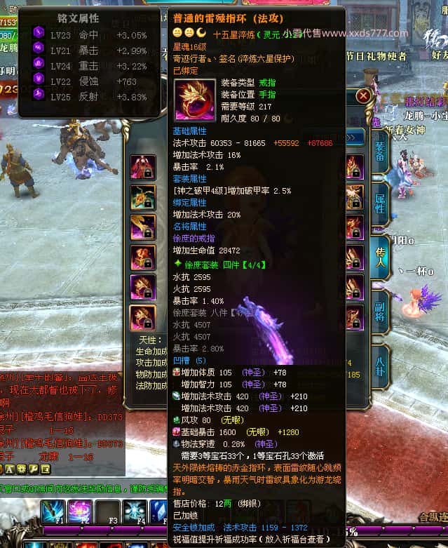 编号T25016 丶敬朝阳o 龙腾问鼎 荆州 本国排名第28名 23032W战力 人物黄金极品橙15X(武器18X 8件混沌) 传人极品紫15X 副将极品紫13X 马加强橙12X 极品紫15披风 人物星魂16级 传人15级 副将6级 马星魂16级 人物铭刻(主手18级,项链/副手/盔甲16级,剩下的15级) 点亮16星 马铭刻2件14级3件13级 点亮12星 人物1件紫+10件绿龙印 马黄龙印 五六等单双属性神圣完美无瑕石头 绿黄孔 已经开完永久15星套 可以转移百分百安全