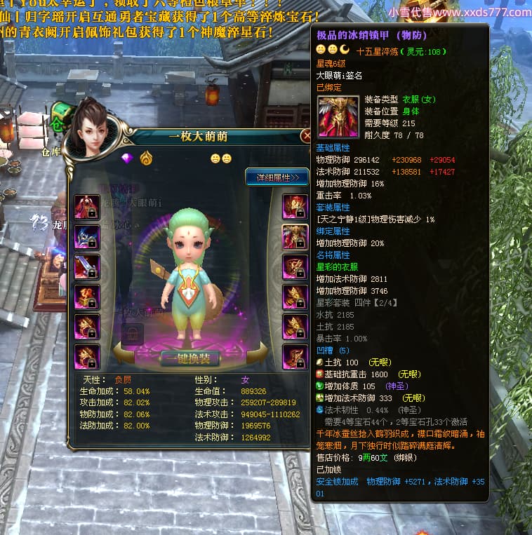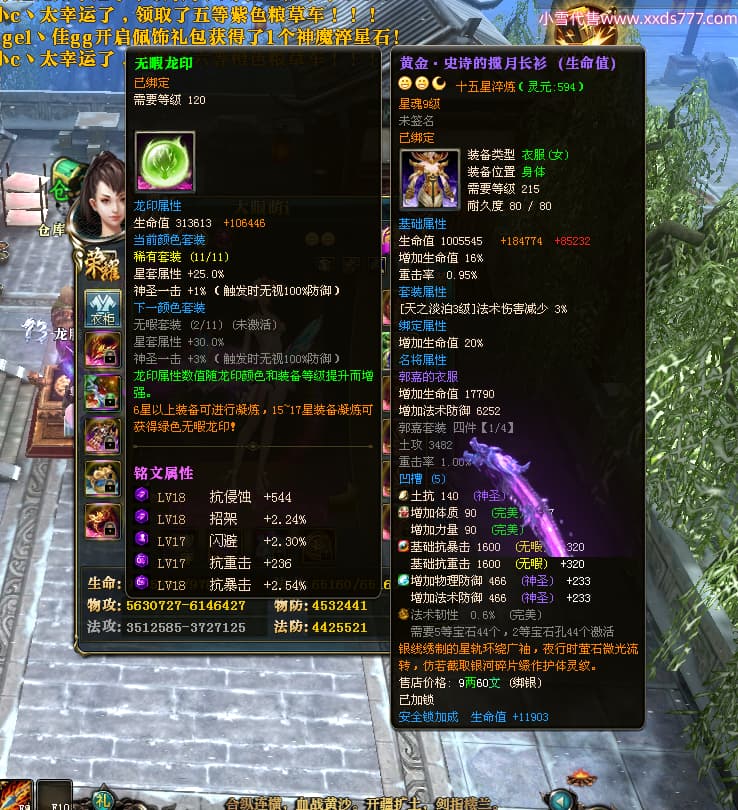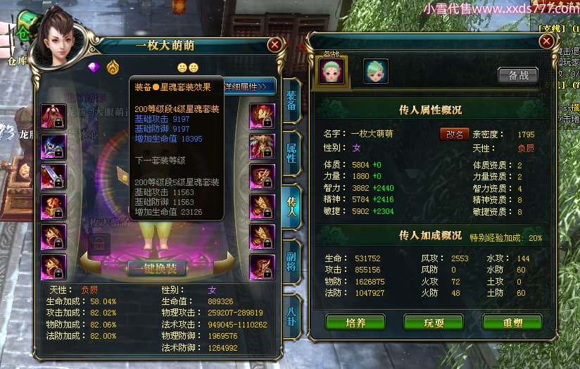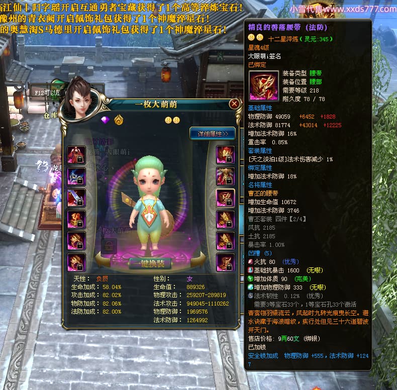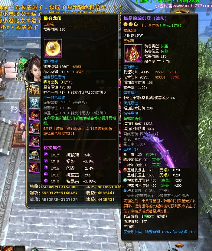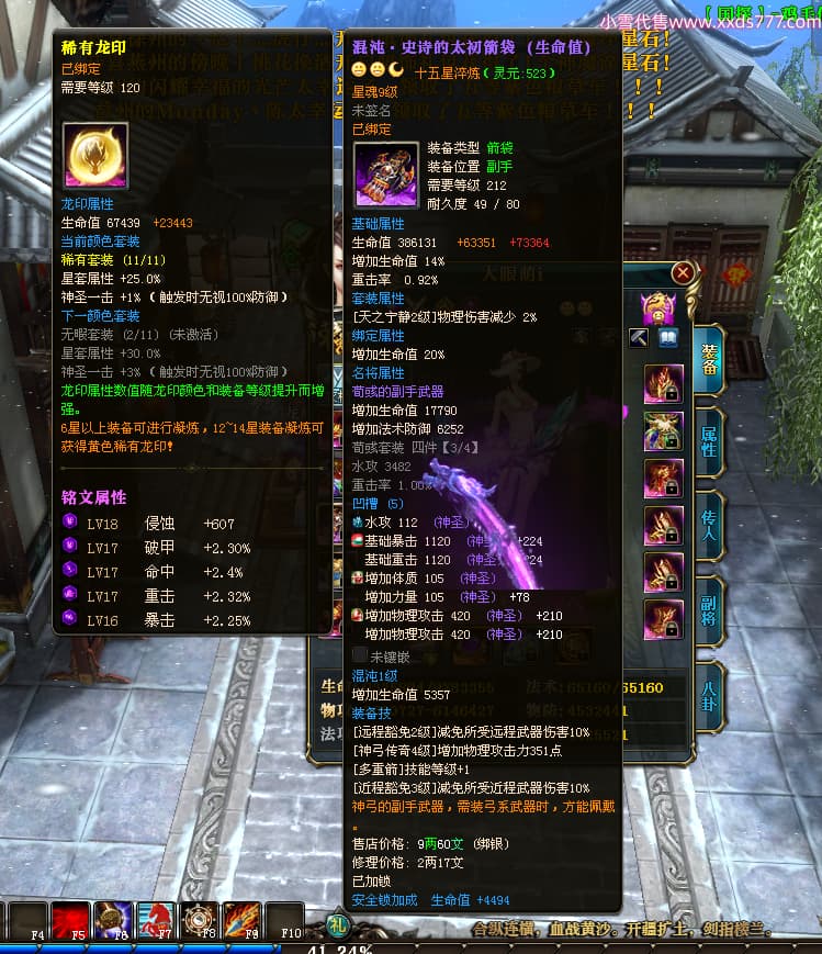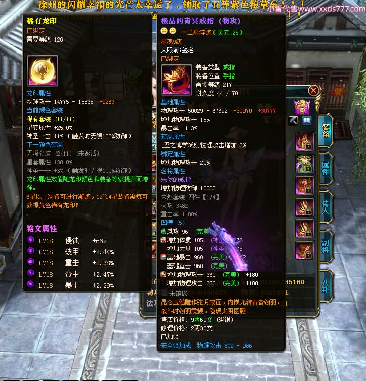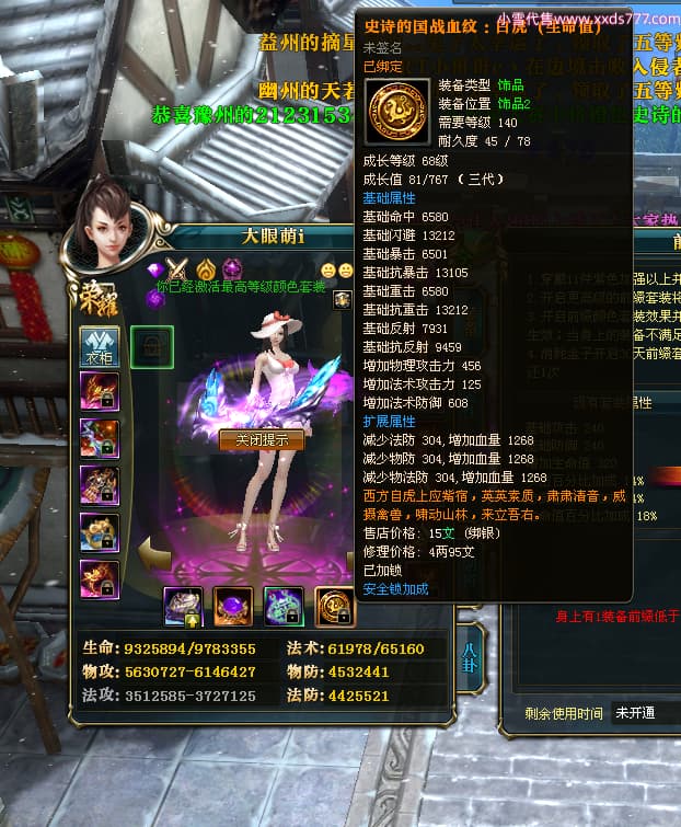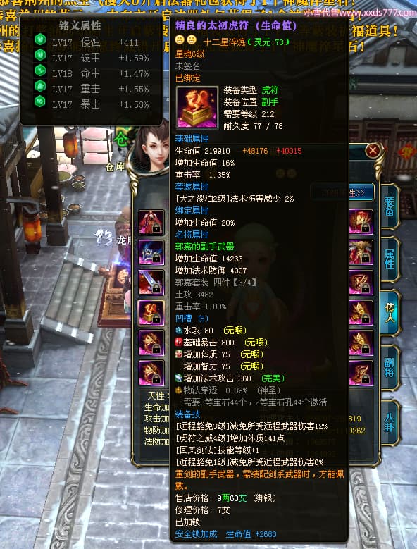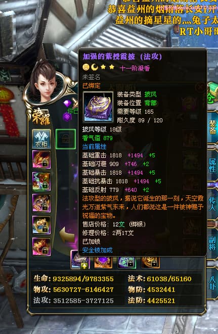 编号T25017 大眼萌i 龙腾问鼎 豫州 本国排名72名 8059W战力 人物史诗紫12X(4件15X) 传人精良紫12X 副将精良紫12X 马极品紫9X 加强紫11披风 人物星魂9级 传人星魂4级 马星魂3级 人物铭刻1件13级其余12级 点亮12星 马铭刻12级 点亮10星 人物黄龙印(2件绿龙印) 马蓝龙印 五等单双属性完美无暇神圣石头 白孔 可以转移百分百安全