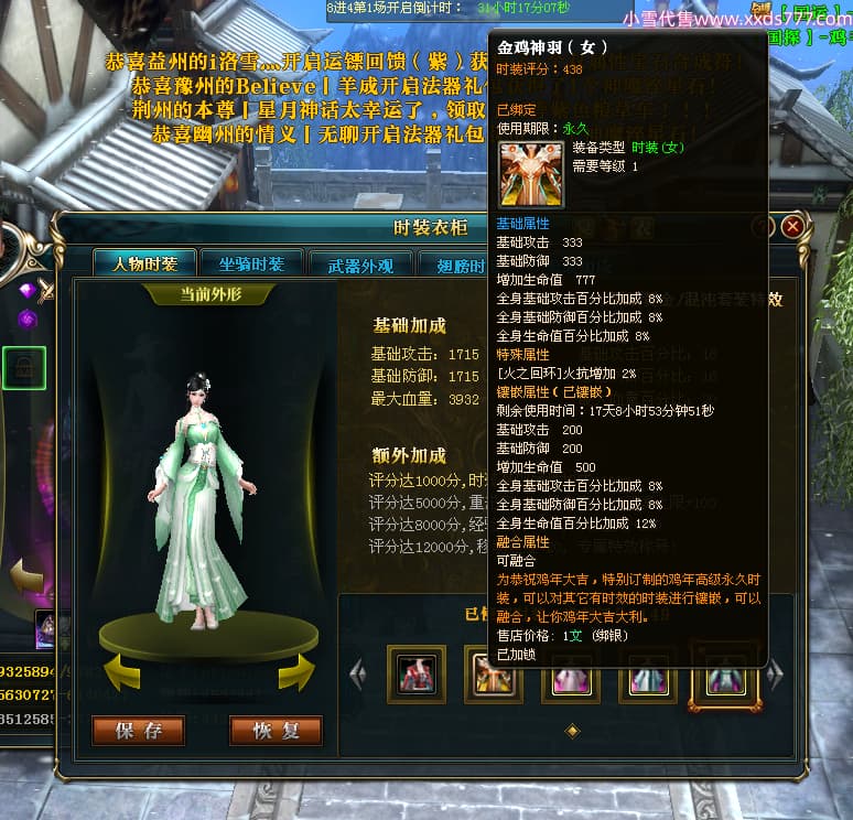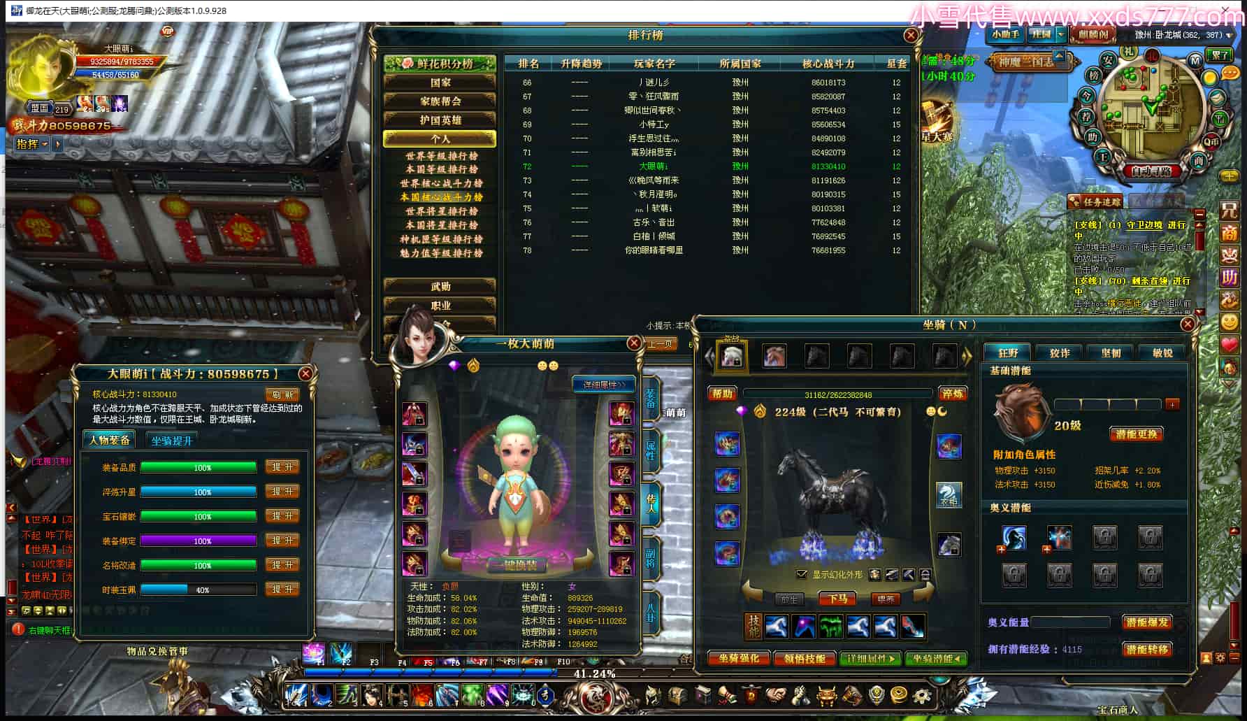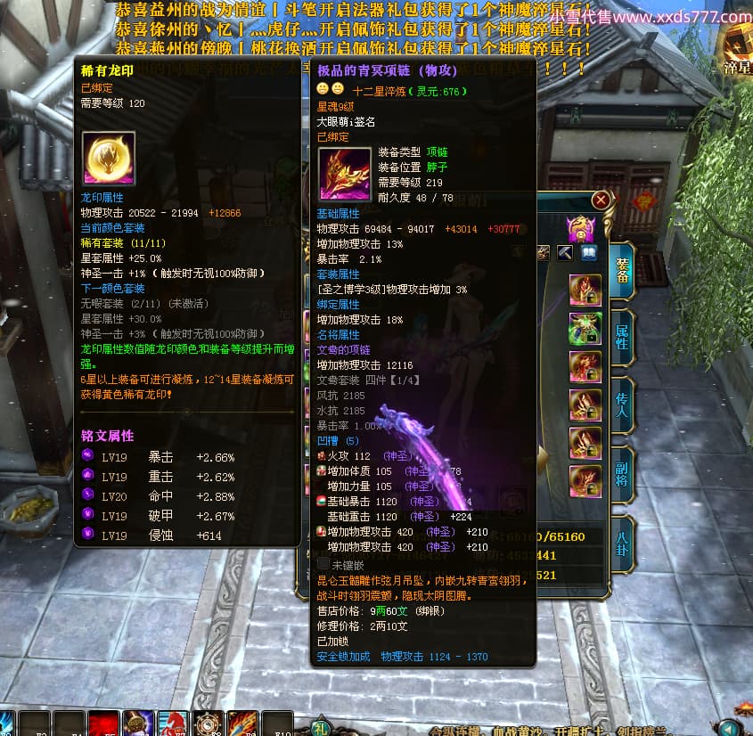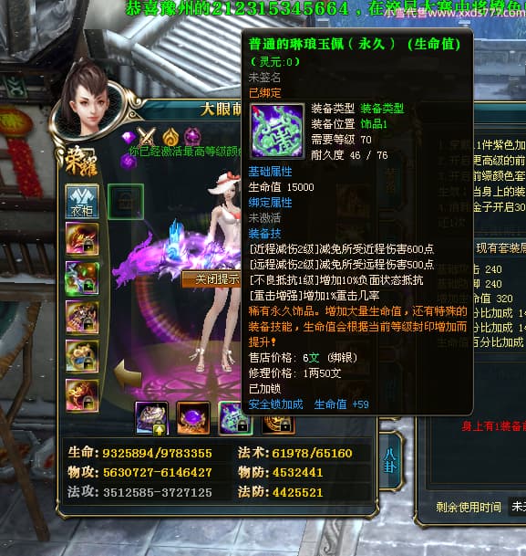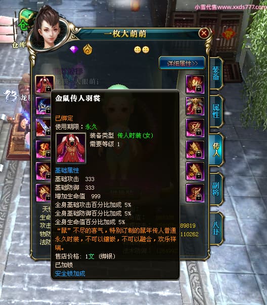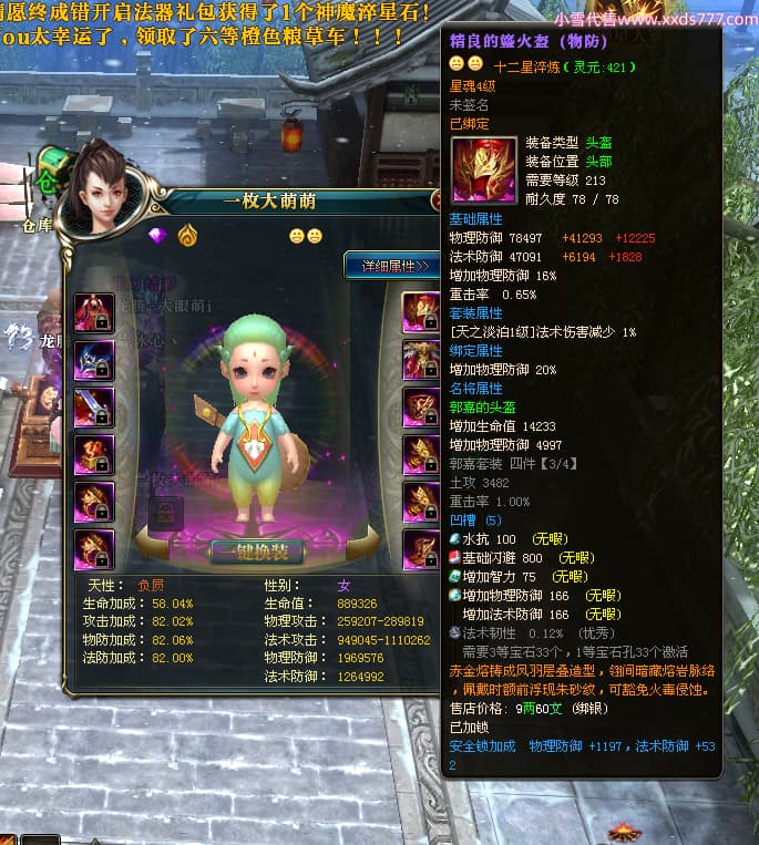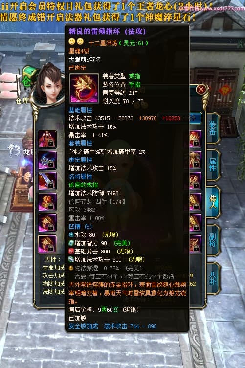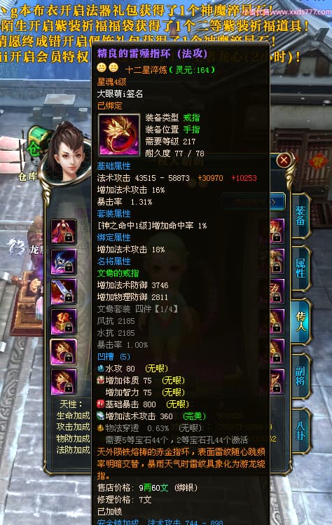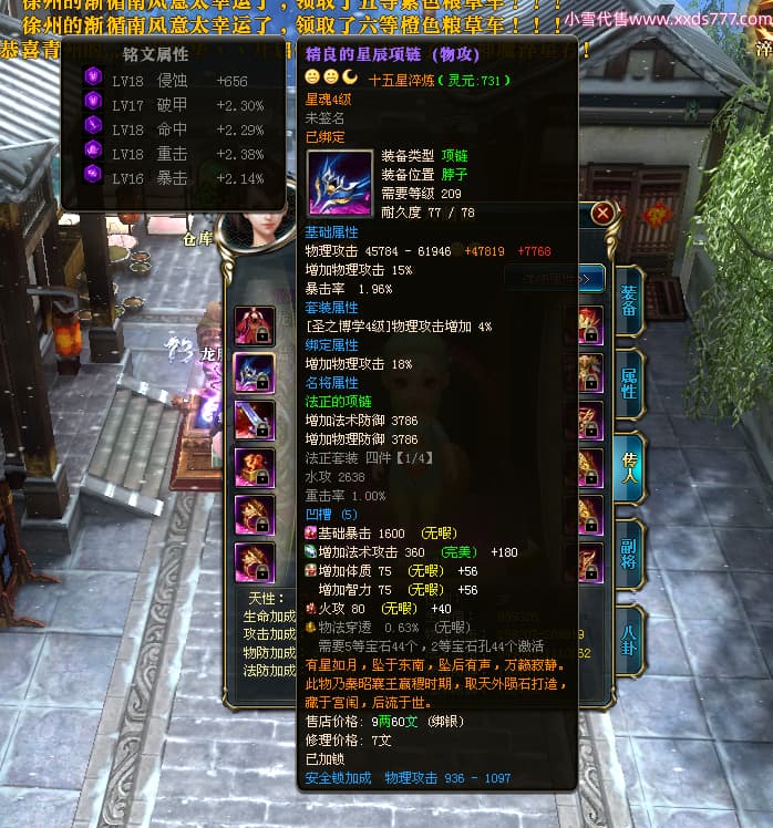 编号T25017 大眼萌i 龙腾问鼎 豫州 本国排名72名 8059W战力 人物史诗紫12X(4件15X) 传人精良紫12X 副将精良紫12X 马极品紫9X 加强紫11披风 人物星魂9级 传人星魂4级 马星魂3级 人物铭刻1件13级其余12级 点亮12星 马铭刻12级 点亮10星 人物黄龙印(2件绿龙印) 马蓝龙印 五等单双属性完美无暇神圣石头 白孔 可以转移百分百安全