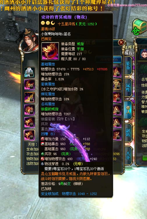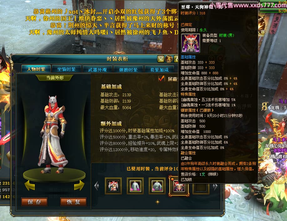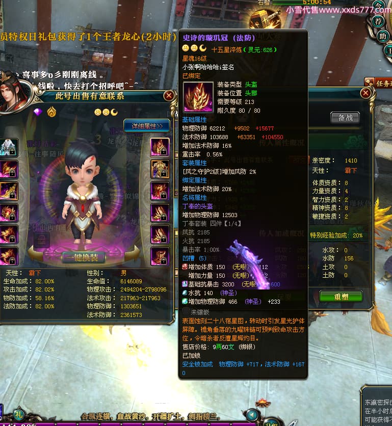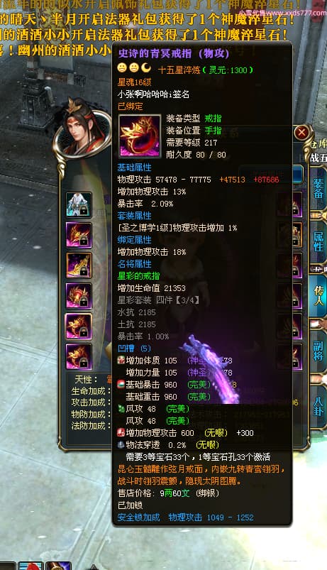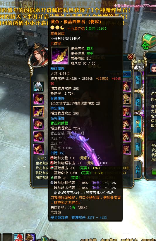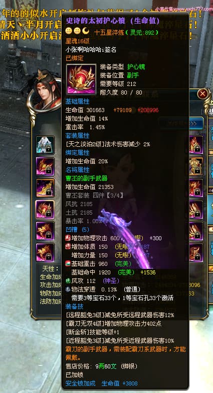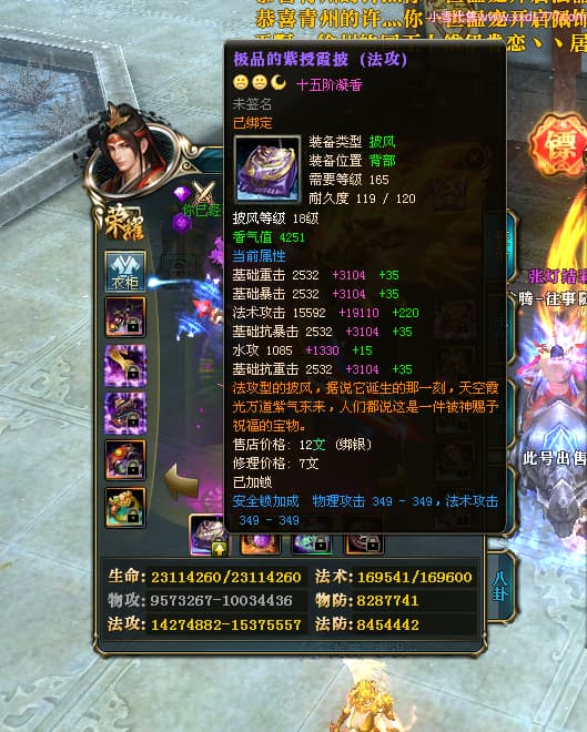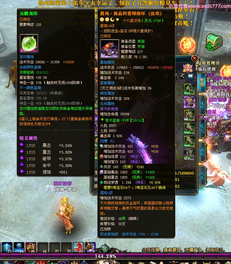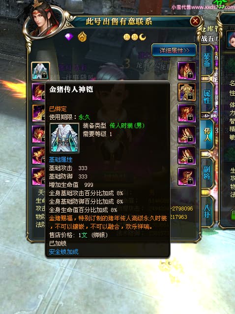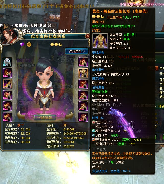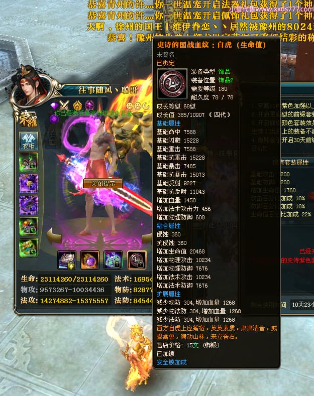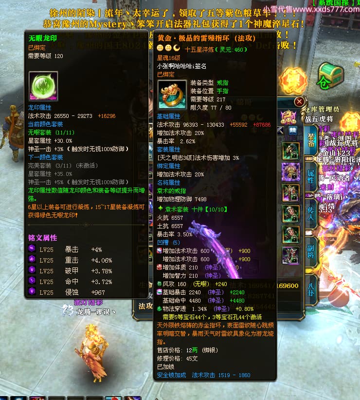 编号T25024 往事随风丶聪哥 龙腾问鼎 燕州 本国排名21名 22791W战力 人物黄金极品橙15X(1件18X8件混沌) 传人史诗紫15X 副将精良紫12X 马加强橙12X 极品紫15披风 人物星魂16级 传人星魂16级 副将星魂6级 马星魂16级 人物铭刻2件16级其余15级 人物点亮16星 马铭刻15级 点亮1件14星其余12星 人物绿龙印(3件紫龙印) 马黄龙印 六等单双属性完美无暇神圣石头 黄绿孔 已开完永久15星套 可以转移百分百安全