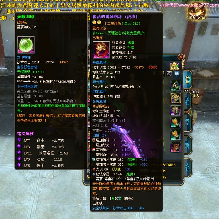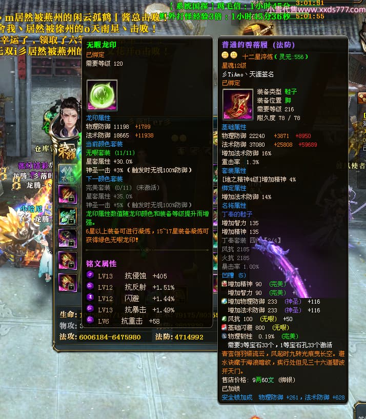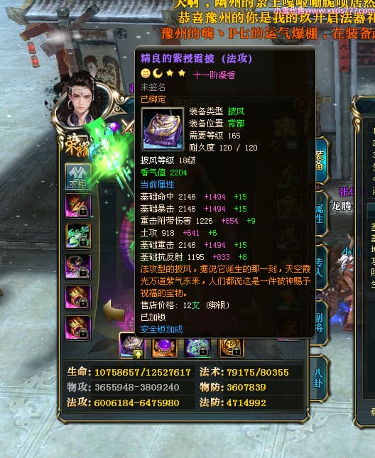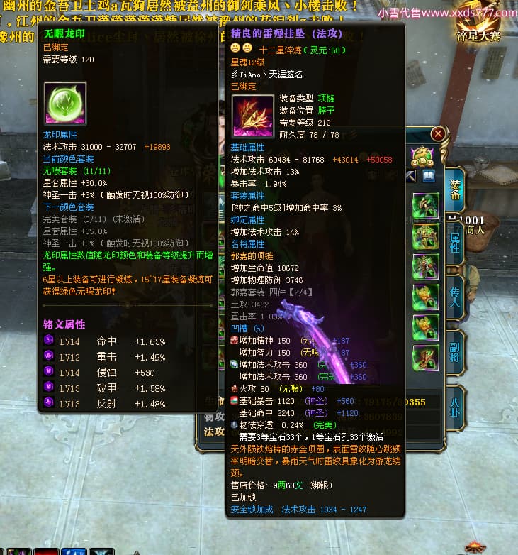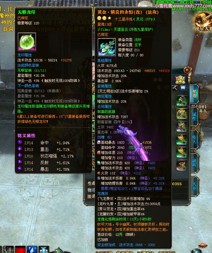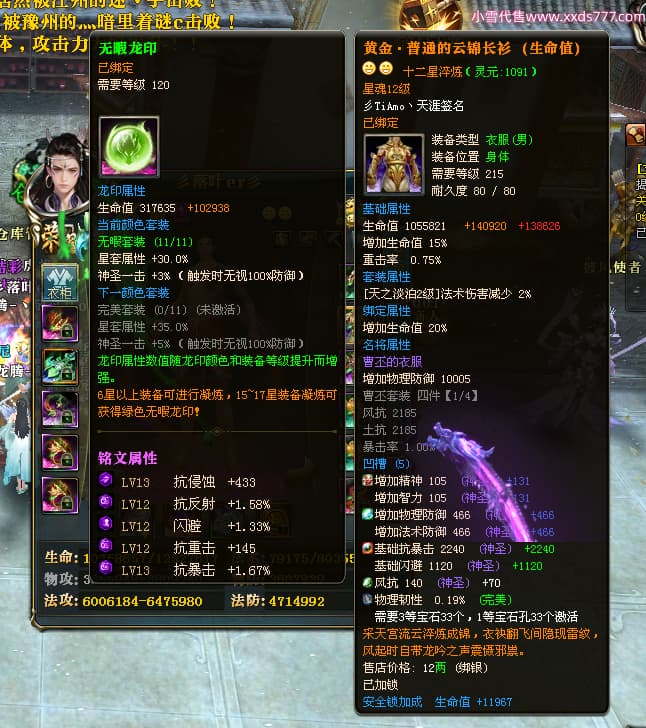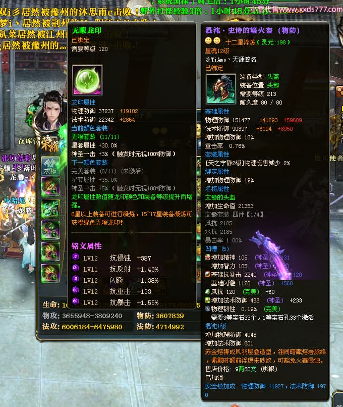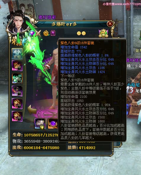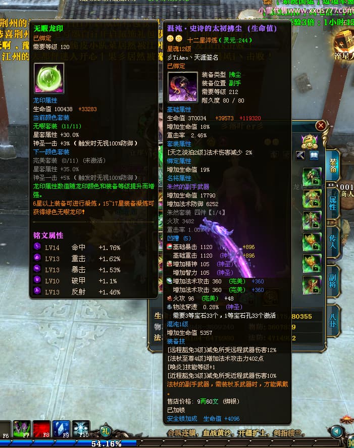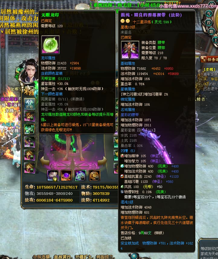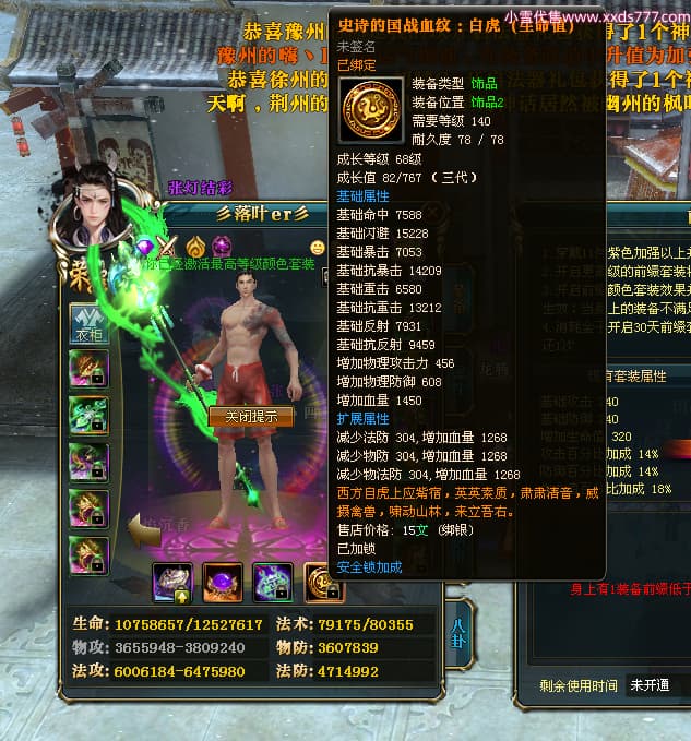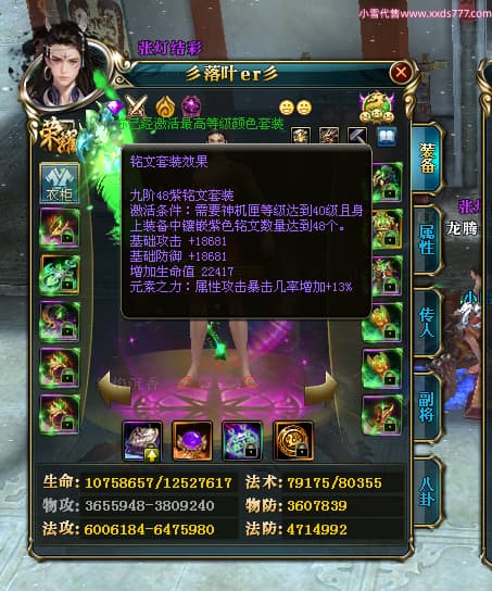 编号T25034 彡落叶er彡 龙腾问鼎 荆州 8458W战力 人物史诗紫12X(3件混沌) 传人精良紫12X 副将加强紫12X 马极品紫9X 精良紫11披风 人物星魂12级 传人星魂6级 副将星魂3级 马星魂7级 人物铭刻2件15级3件13级其余12级 点亮2件14星其余12星 马铭刻12级 点亮10星 人物绿龙印 马蓝龙印 五等单双属性完美神圣石头 黄蓝孔