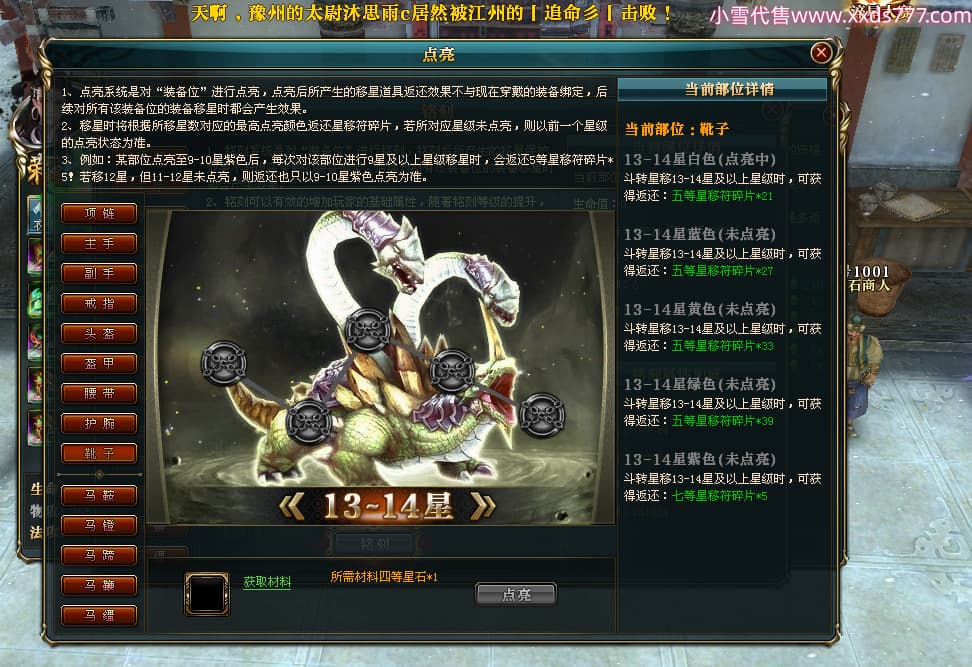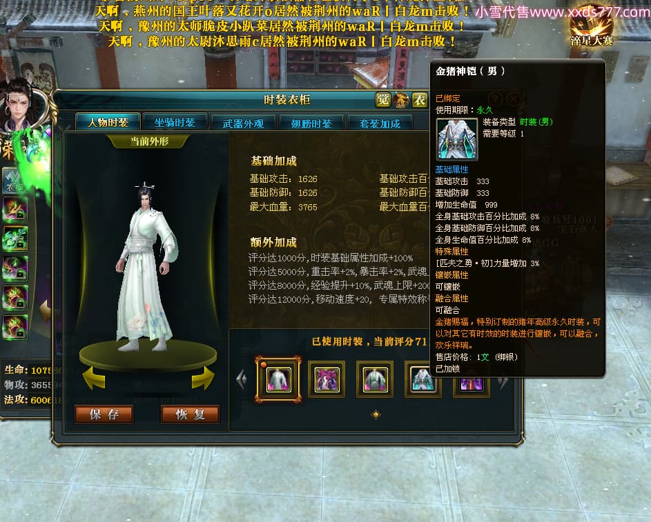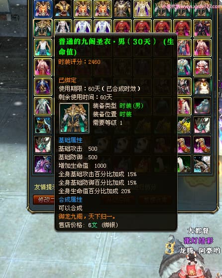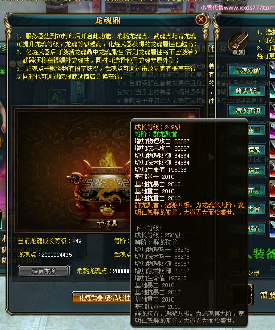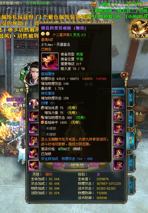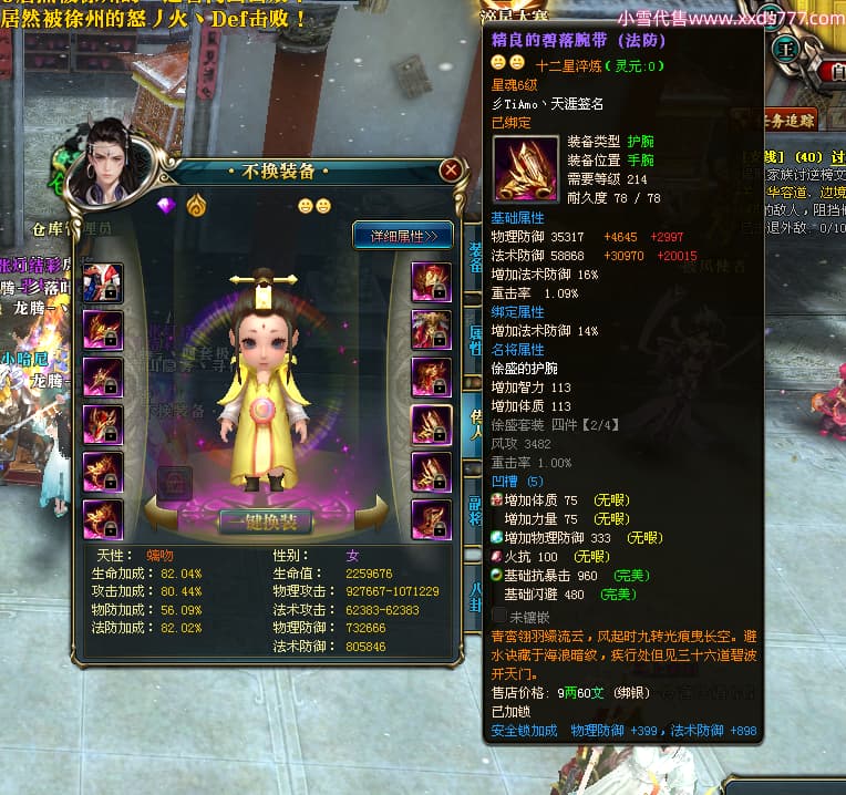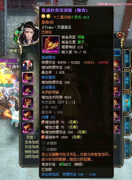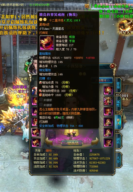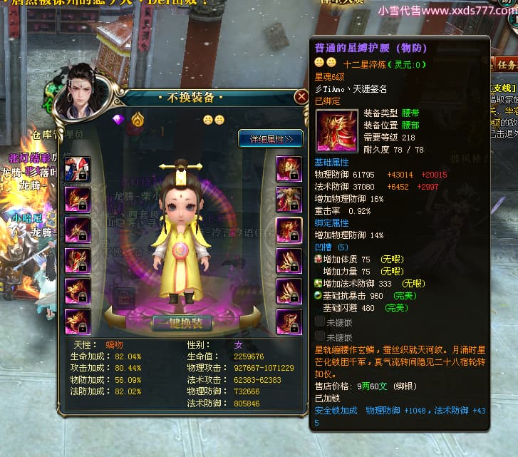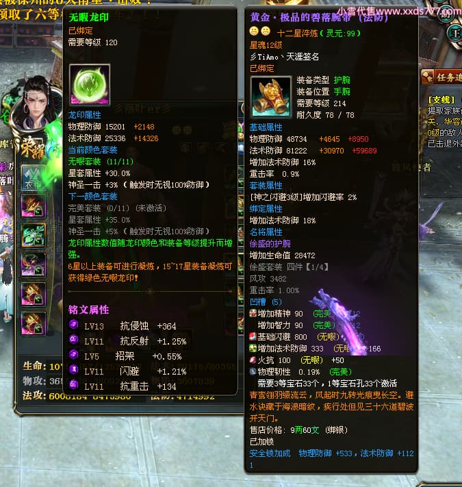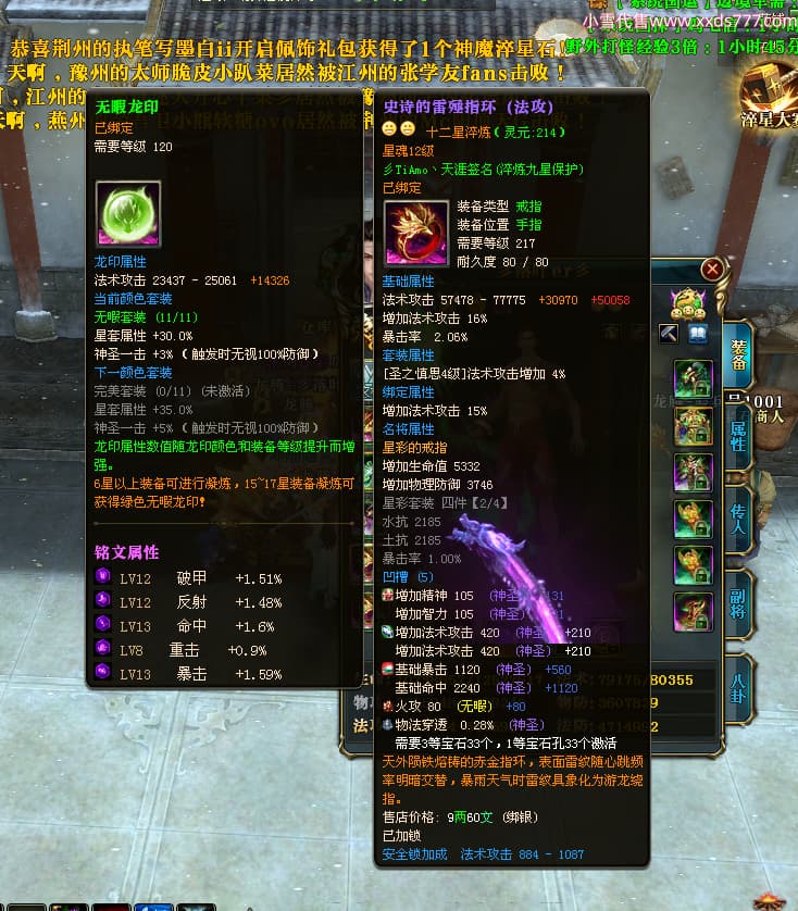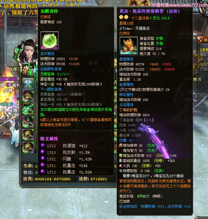 编号T25034 彡落叶er彡 龙腾问鼎 荆州 8458W战力 人物史诗紫12X(3件混沌) 传人精良紫12X 副将加强紫12X 马极品紫9X 精良紫11披风 人物星魂12级 传人星魂6级 副将星魂3级 马星魂7级 人物铭刻2件15级3件13级其余12级 点亮2件14星其余12星 马铭刻12级 点亮10星 人物绿龙印 马蓝龙印 五等单双属性完美神圣石头 黄蓝孔