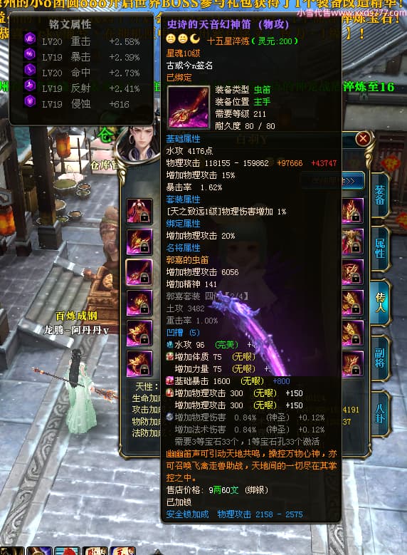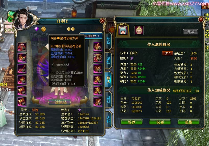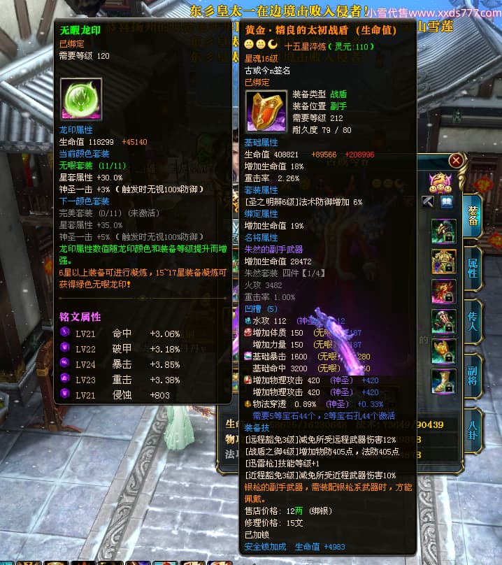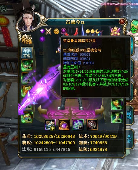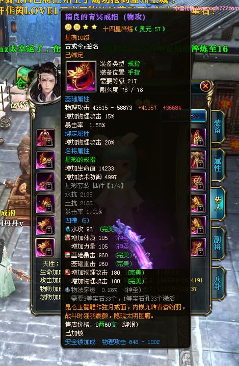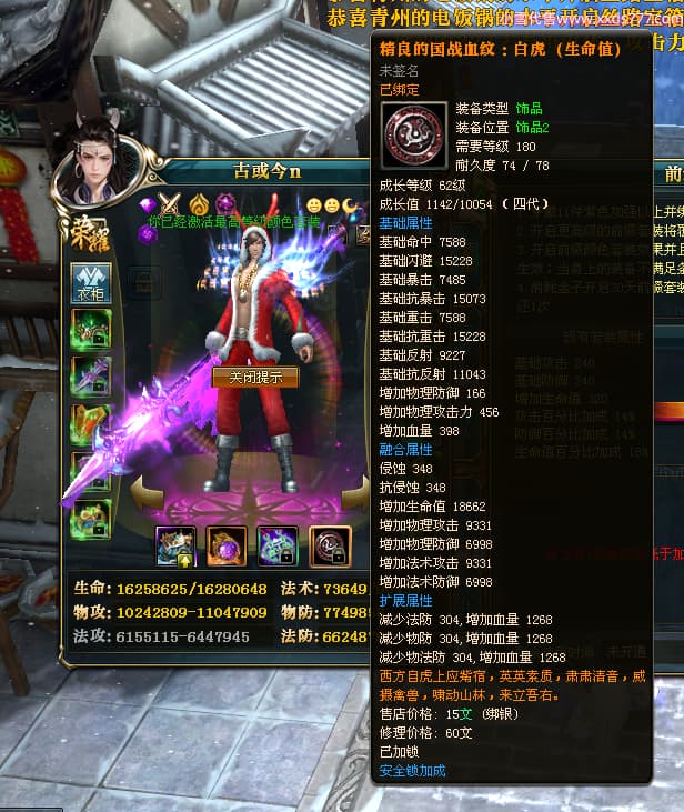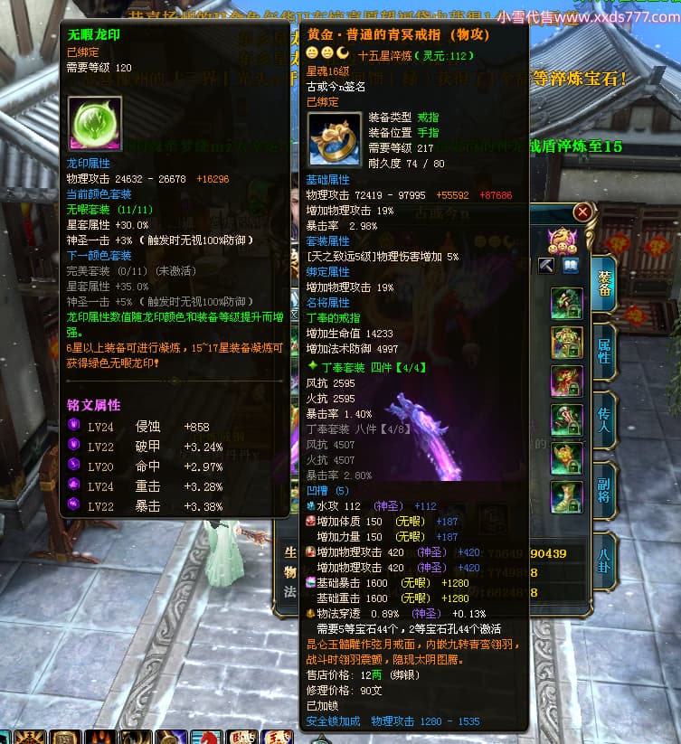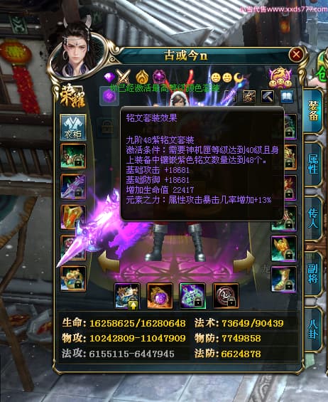 编号T25038 古或今n 龙腾问鼎 扬州 本国排名第24名 15662W战力 人物黄金史诗紫15X(4件混沌) 传人精良紫12X 副将精良紫12X 马史诗紫10X 精良紫14披风 人物星魂16级 传人星魂9级 副将星魂6级 马星魂10级 人物铭刻3件16级其余15级 点亮7件16星其余14星 马铭刻12级 点亮10星 人物绿龙印 马黄龙印 五六等单双属性神圣完美无瑕石头 黄蓝孔