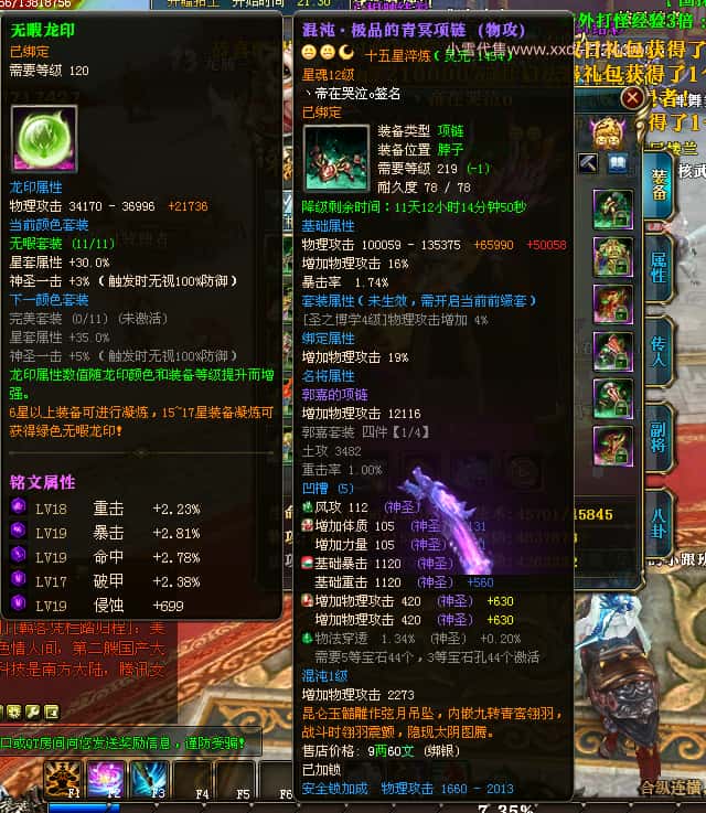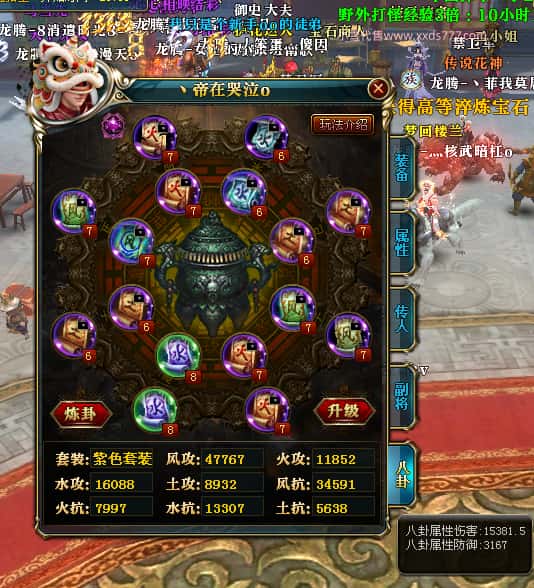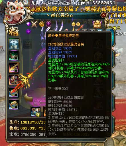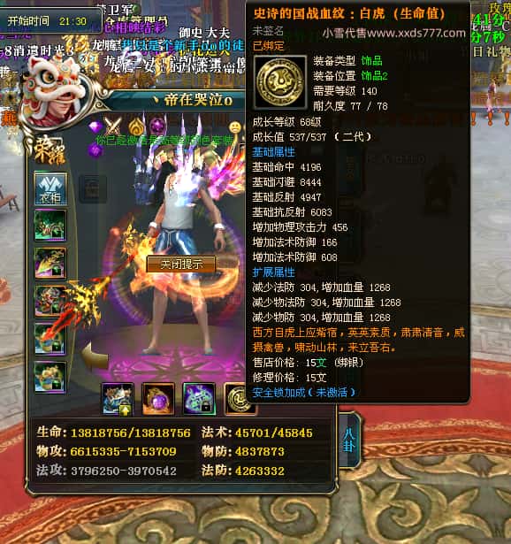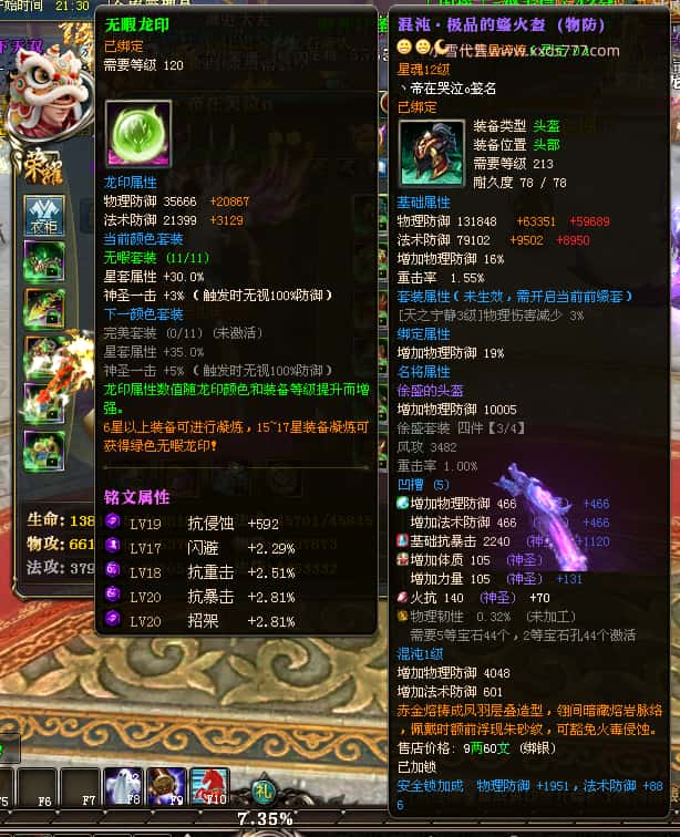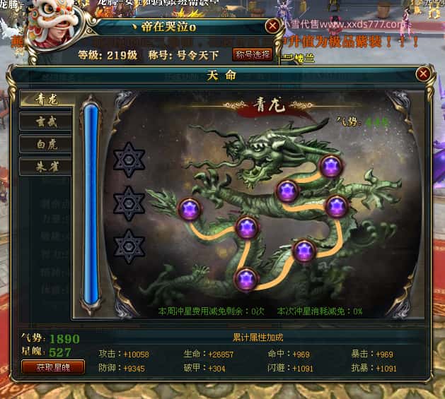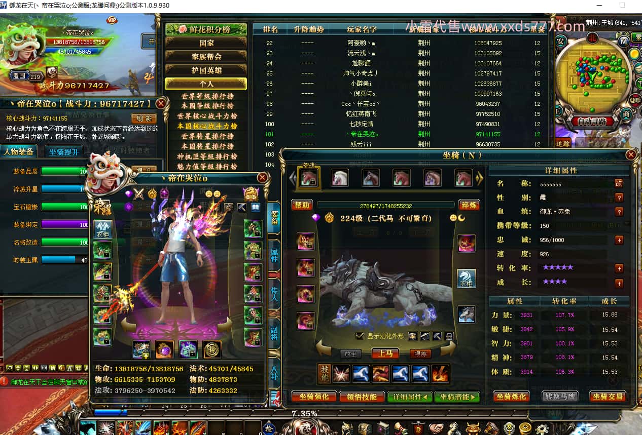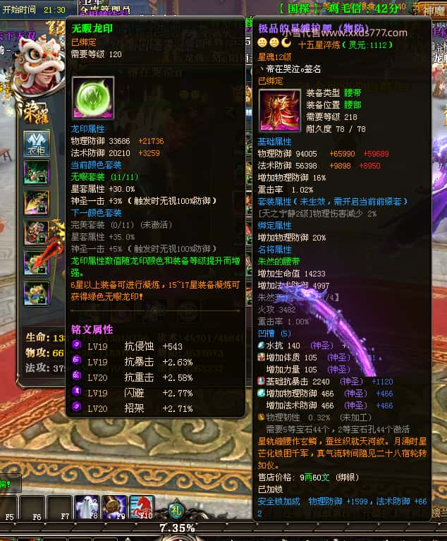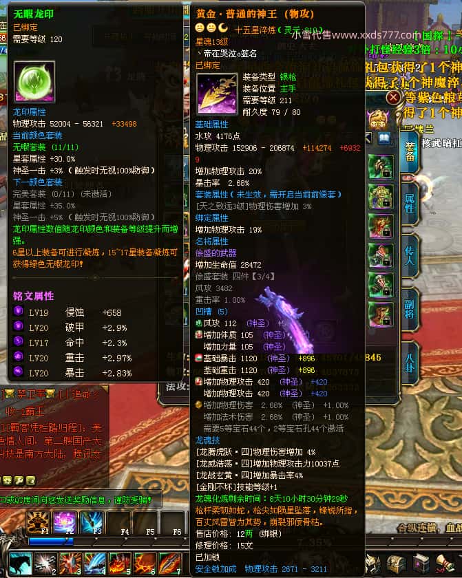 编号T25114 丶帝在哭泣o 龙腾问鼎 荆州 本国排第101名 9671W战力 人物精良紫12X(10件15X 5件混沌) 传人普通紫12X 副将精良紫12X 马精良紫9X 人物星魂12级 传人6级 副将3级 马星魂7级 人物星魂主手/盔甲15级,副手14级剩下的12级 点亮2件14星 剩下的12星 马铭刻12级 点亮10星 人物绿龙印 马黄龙印 五等单双属性神圣完美无瑕石头