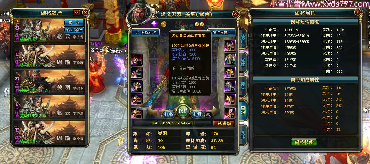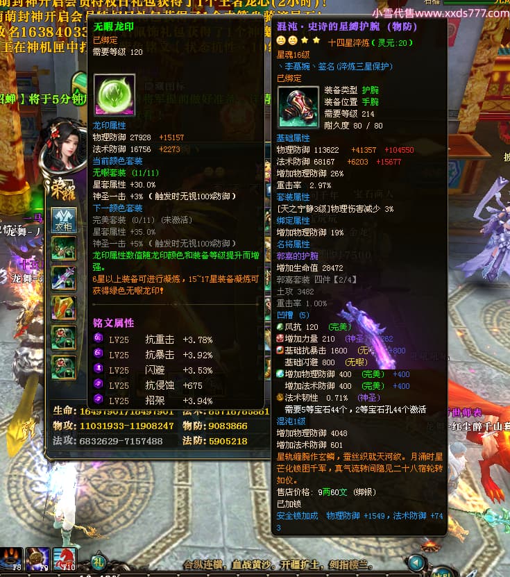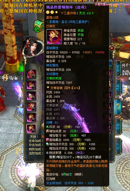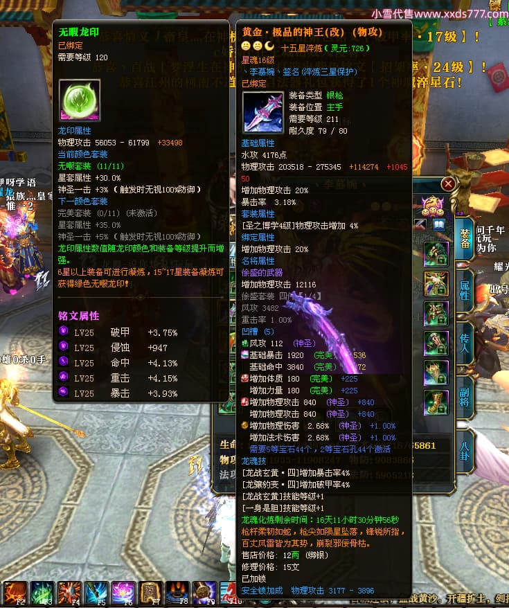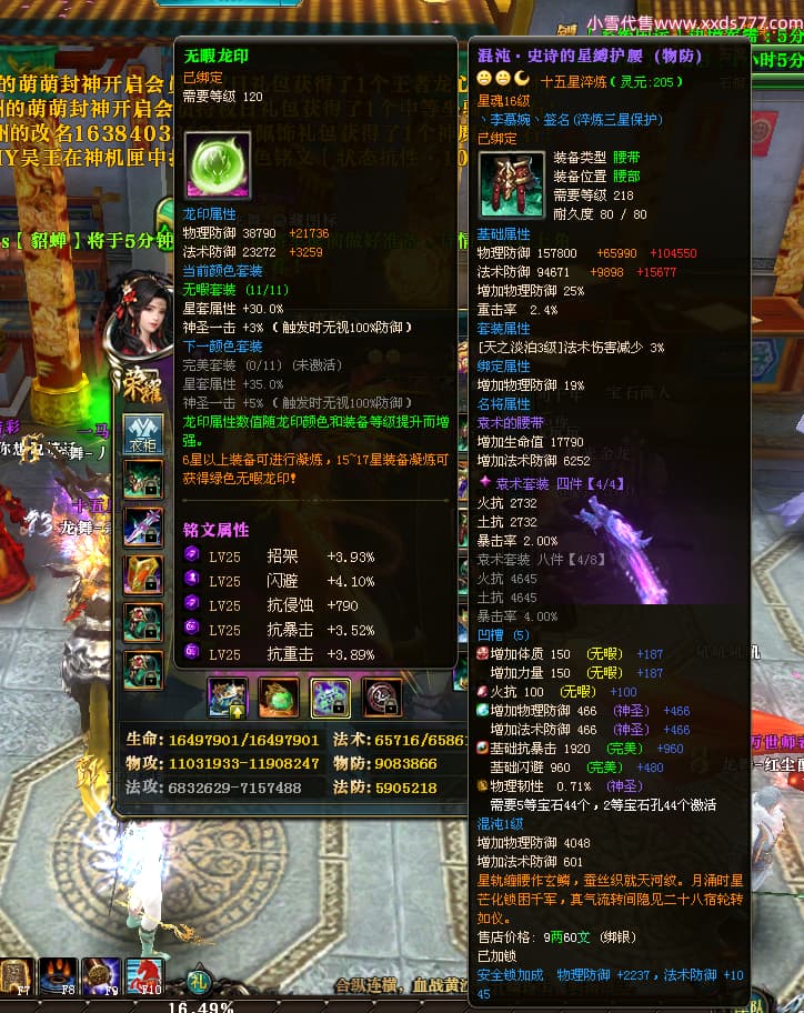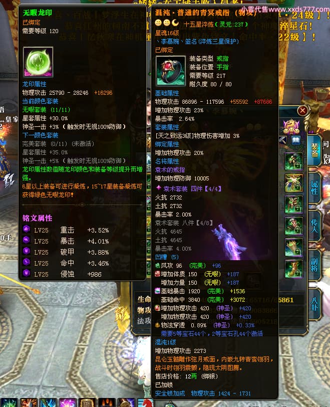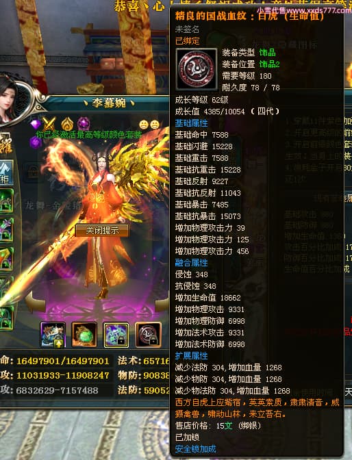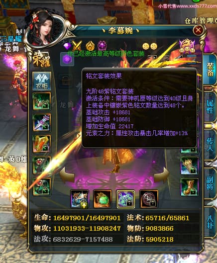 编号W25160 丶李慕婉丶 龙舞九州 荆州 本国排名55名 16738W战力 人物黄金史诗紫14X(8件15X6件混沌) 传人极品紫12X 副将精良紫12X 马史诗紫12X 精良紫15披风 人物星魂16级 传人星魂10级 副将星魂6级 马星魂14级 人物铭刻15级 点亮4件16星其余14星 马铭刻12级 点亮10星 人物绿龙印 马黄龙印 五六等单双属性神圣完美无暇石头 蓝黄孔